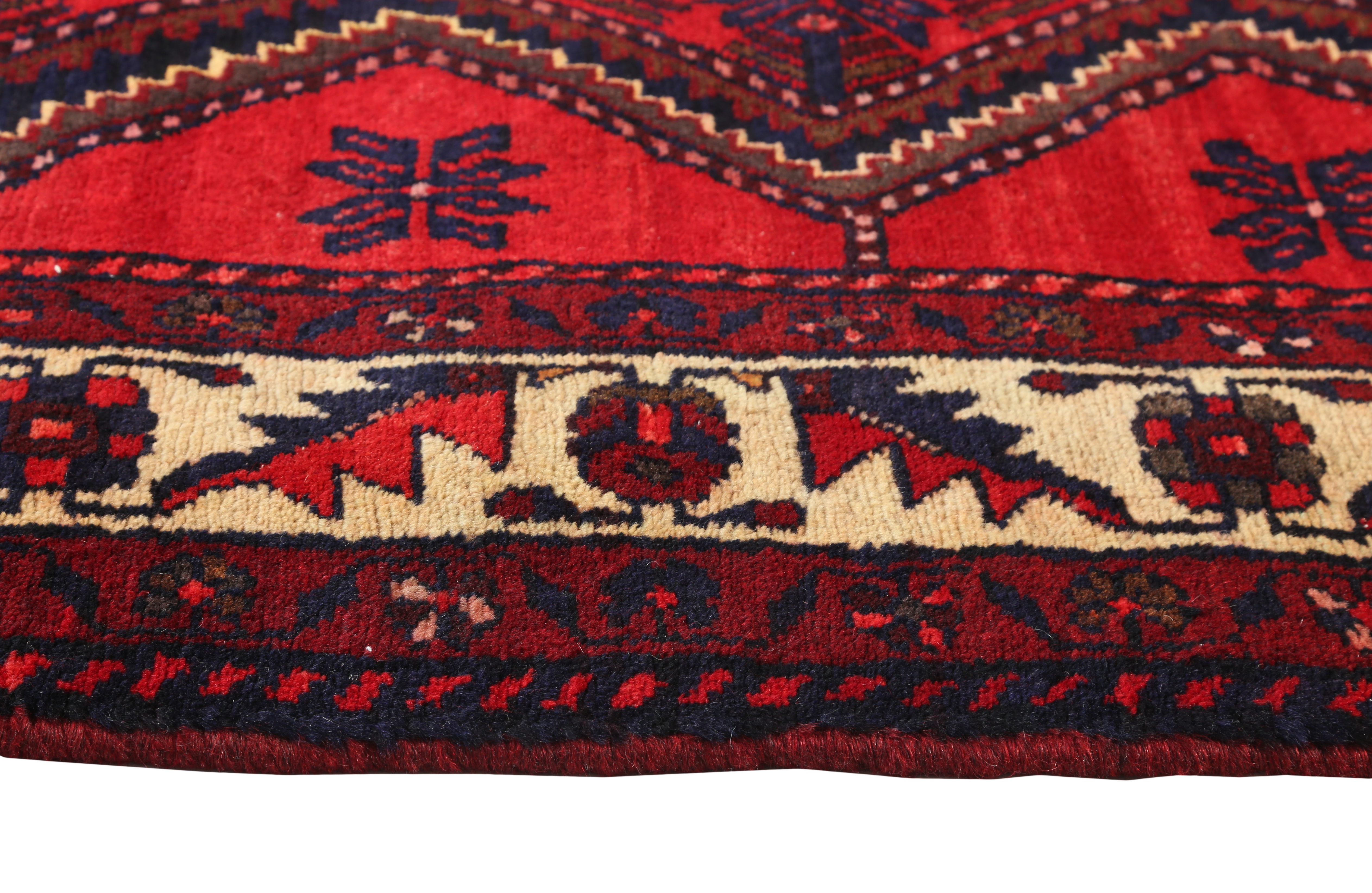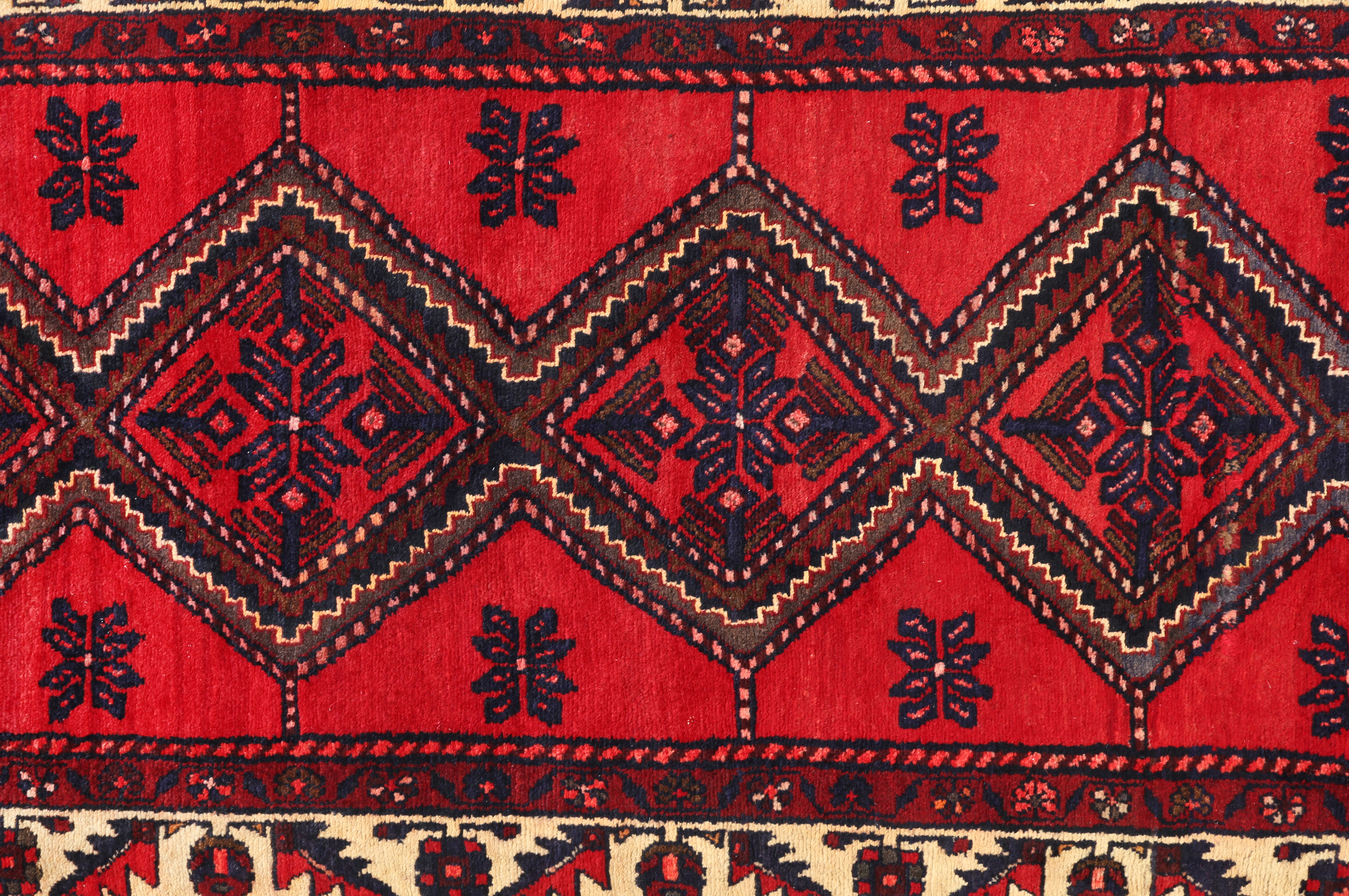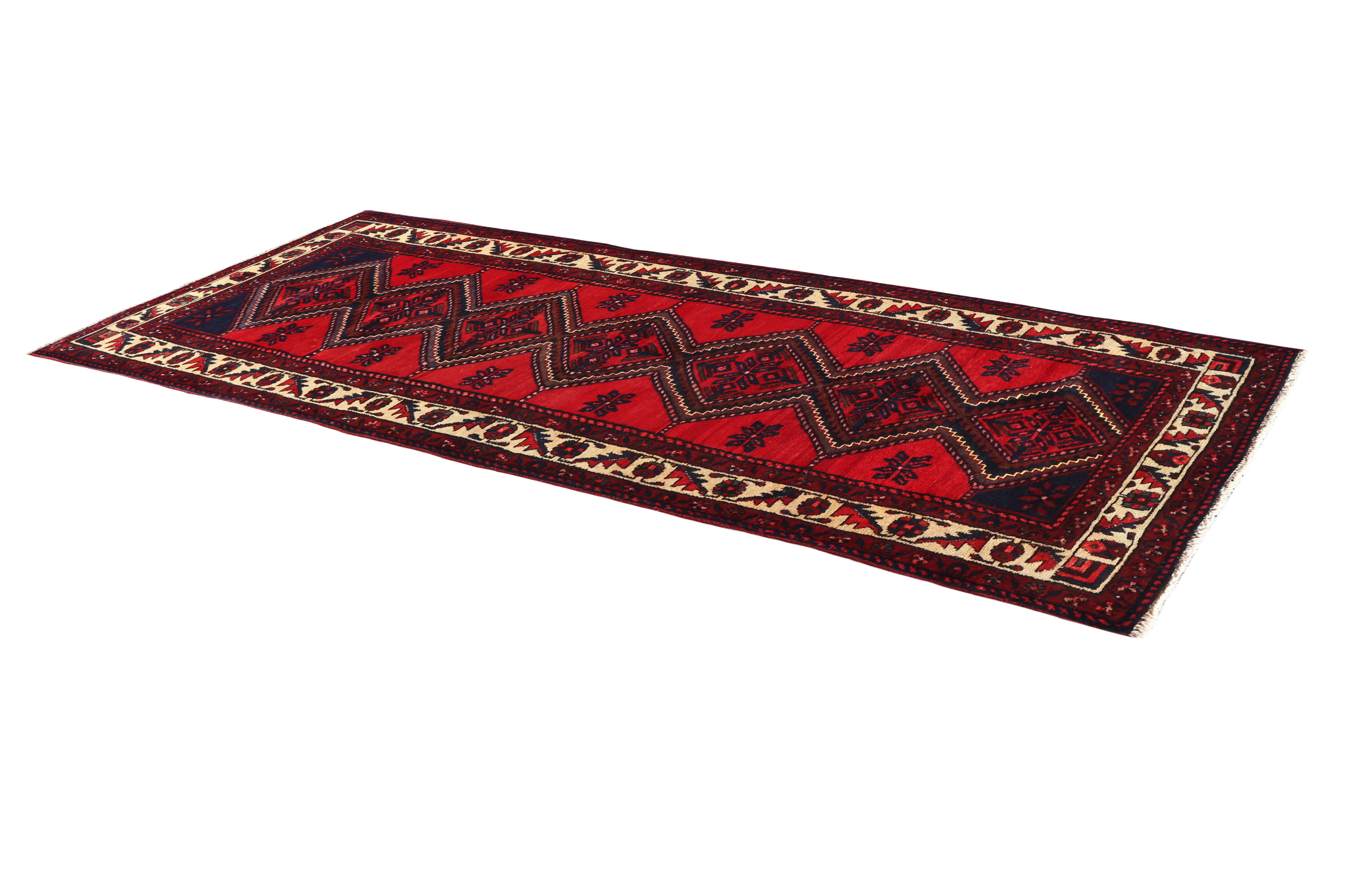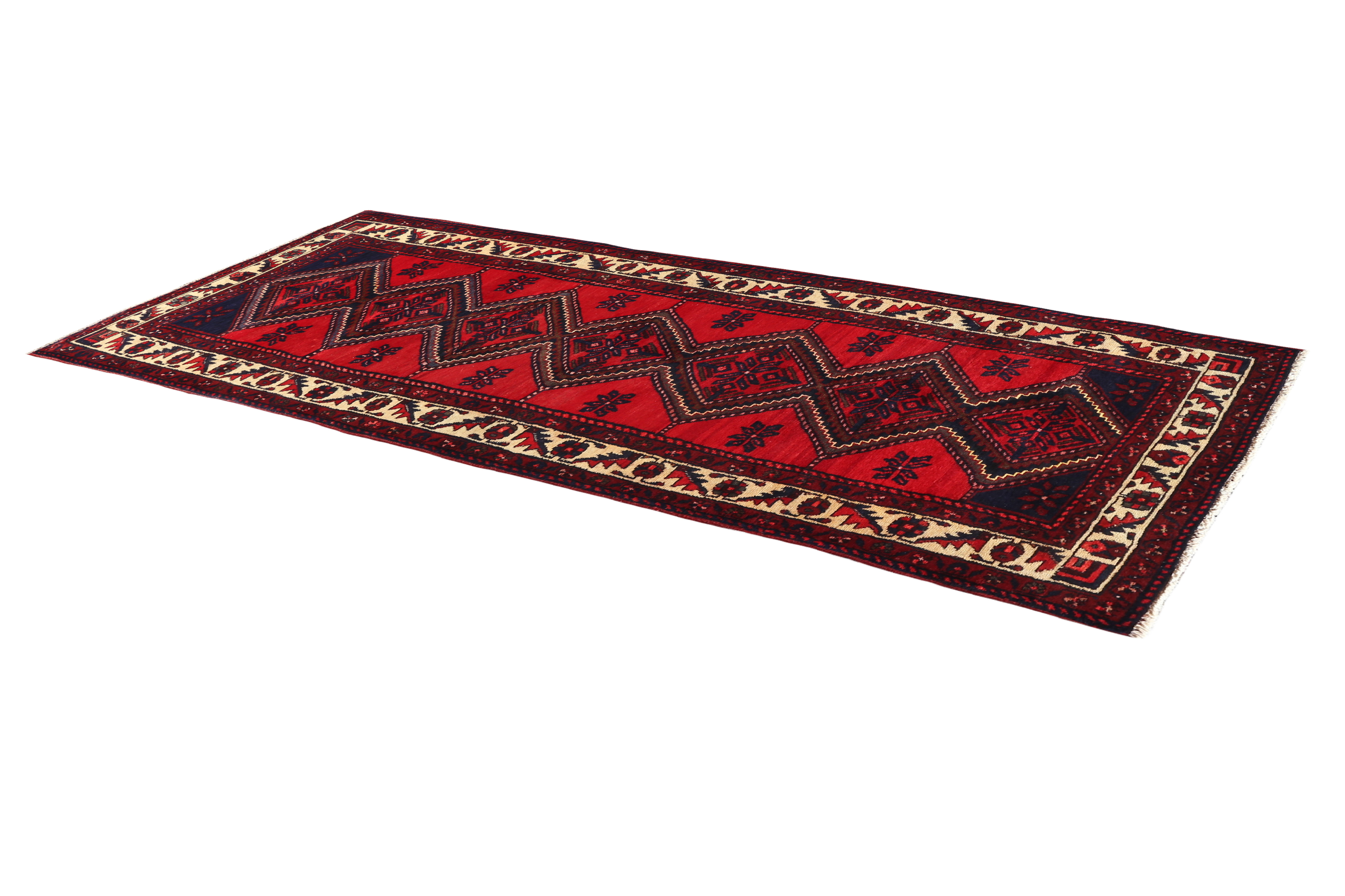 This magnificent semi antique Saveh Persian rug, measuring 10'0" x 3'5", presents an exquisite diamond lattice pattern that embodies centuries of Persian weaving artistry. The geometric precision of the tribal motifs creates a mesmerizing visual rhythm across the madder red field, accented by ivory, navy blue, black, burgundy, and cream tones that speak to the sophisticated color palette of traditional Persian craftsmanship. Dating from 40-60 years ago, this hand-knotted masterpiece carries the authentic patina and character that only time can bestow upon genuine Persian textiles.