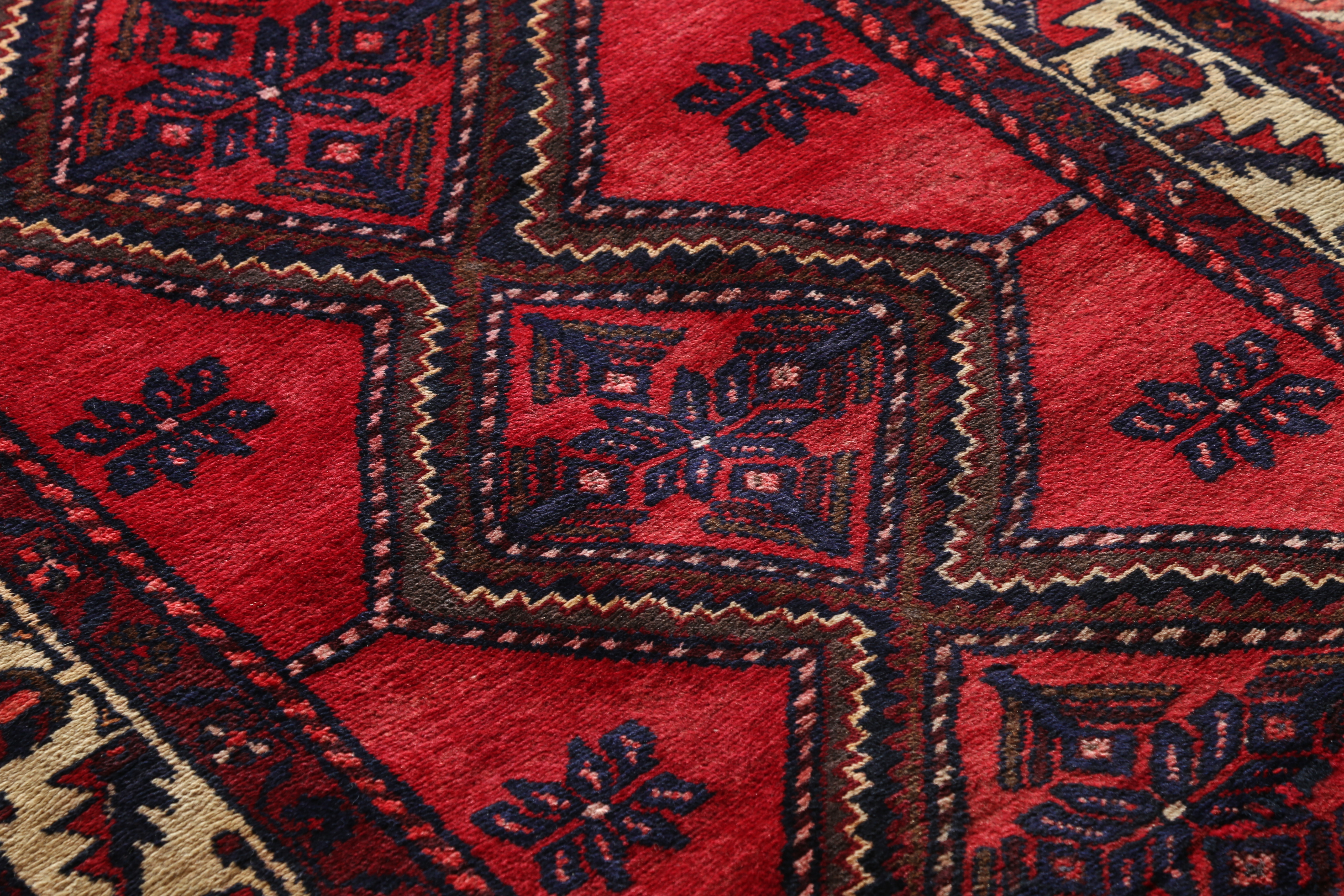 The diamond lattice design holds profound significance in Persian culture, symbolizing protection, prosperity, and the interconnectedness of life's journey. Each diamond shape represents a window to the divine, while the interlocking pattern suggests the eternal nature of existence and the bonds that unite all living beings. The rich madder red background, derived from the roots of the Rubia plant, has been prized for millennia for its vibrant permanence, while the ivory and navy blue accents create a harmonious balance that speaks to the weaver's masterful understanding of color theory.