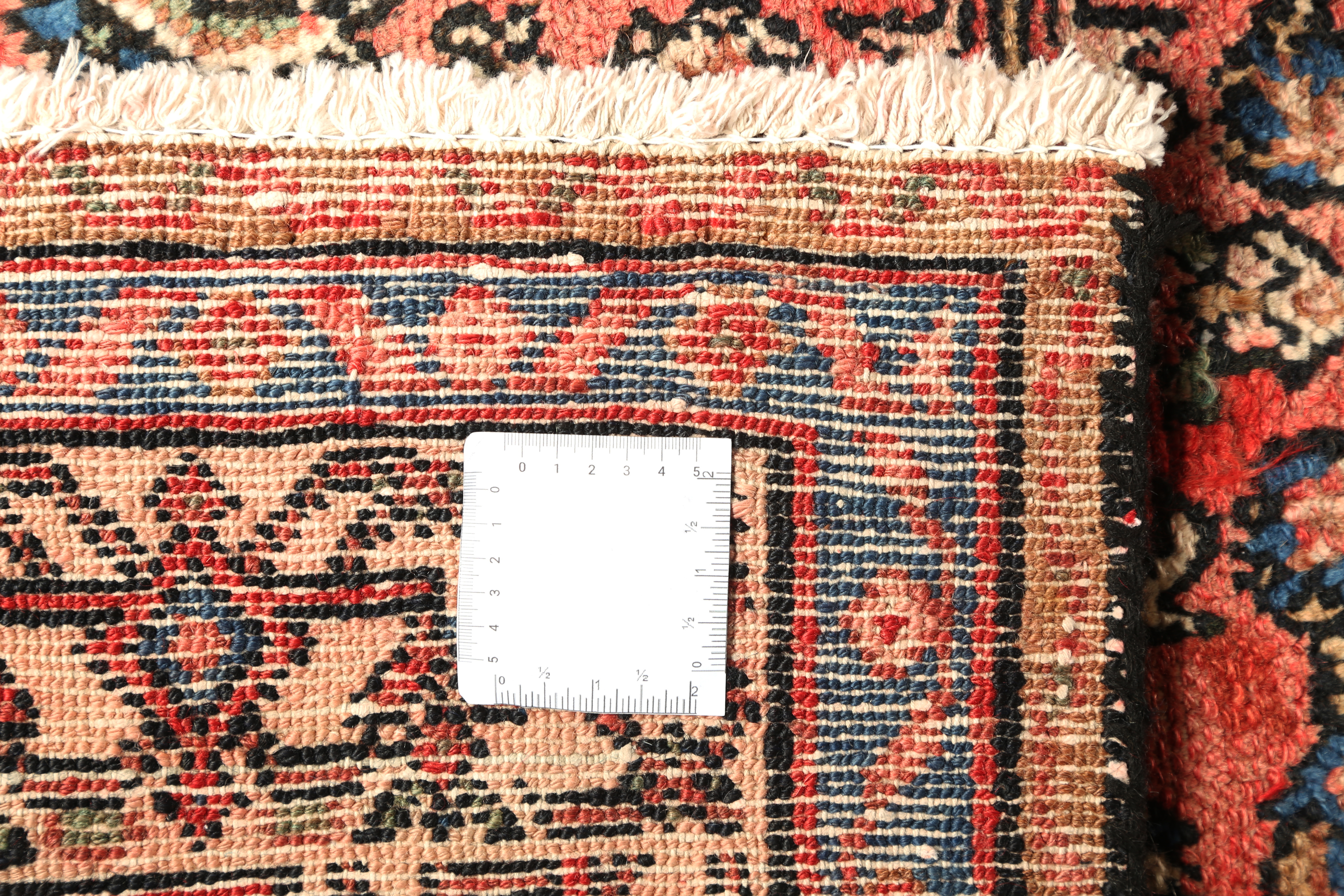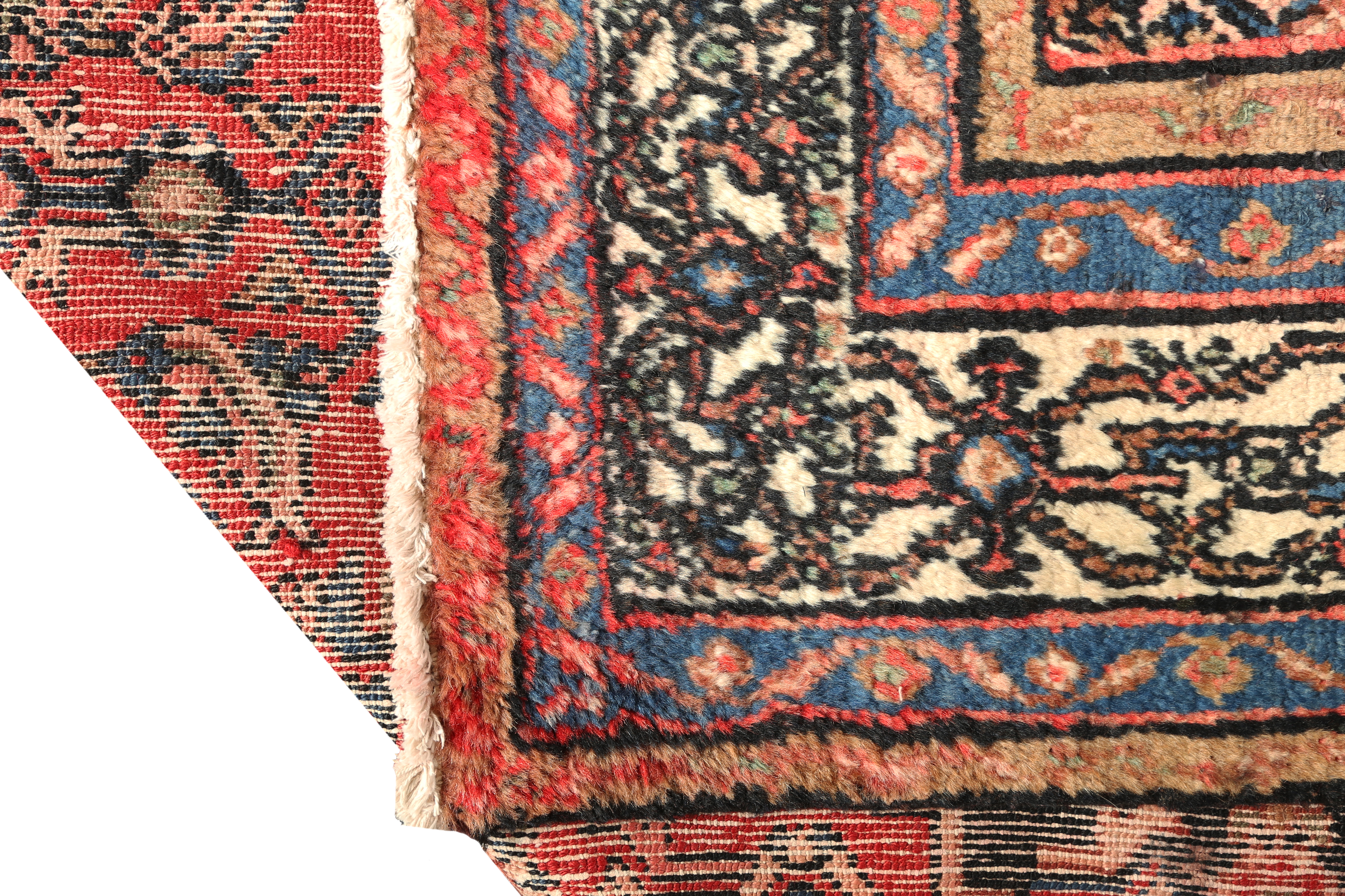Semi-antique and antique Hamadan rugs are particularly valued for the warm, mellowed complexity that their natural dyes develop with age. The madder reds soften toward a warm brick tone, the indigo navies deepen into a rich