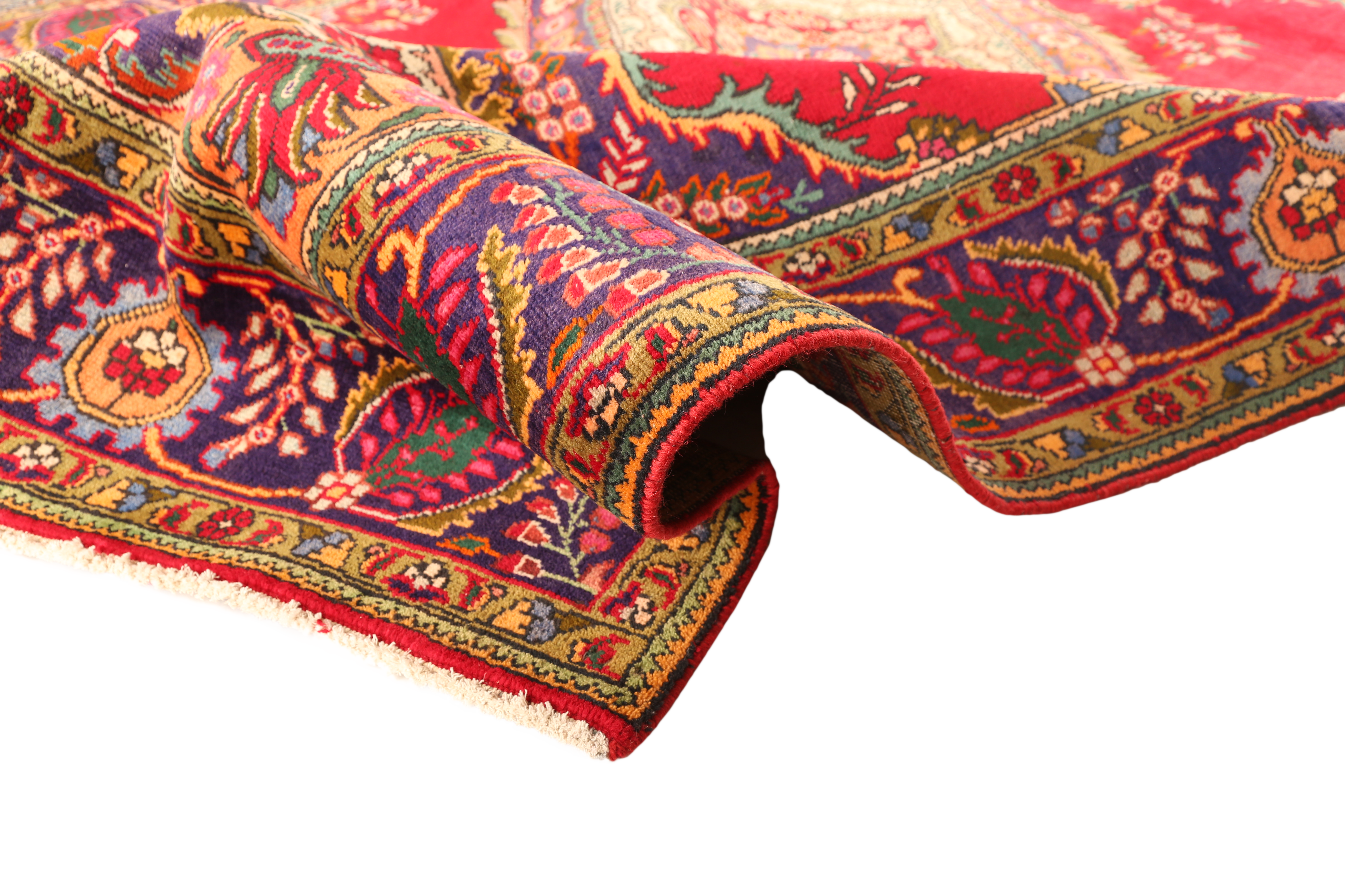 This magnificent semi antique Tabriz Persian rug at 10'0" x 6'7" presents a masterful display of traditional Persian artistry, where deep crimson red serves as the foundation for an intricate Shah Abbasi medallion design that radiates outward in cream, gold, burgundy, navy blue, and Persian blue hues. The central toranj medallion commands attention with its geometric precision, while delicate orange and pink accents dance throughout the field alongside emerald green details that bring life to this four-decade-old masterpiece.