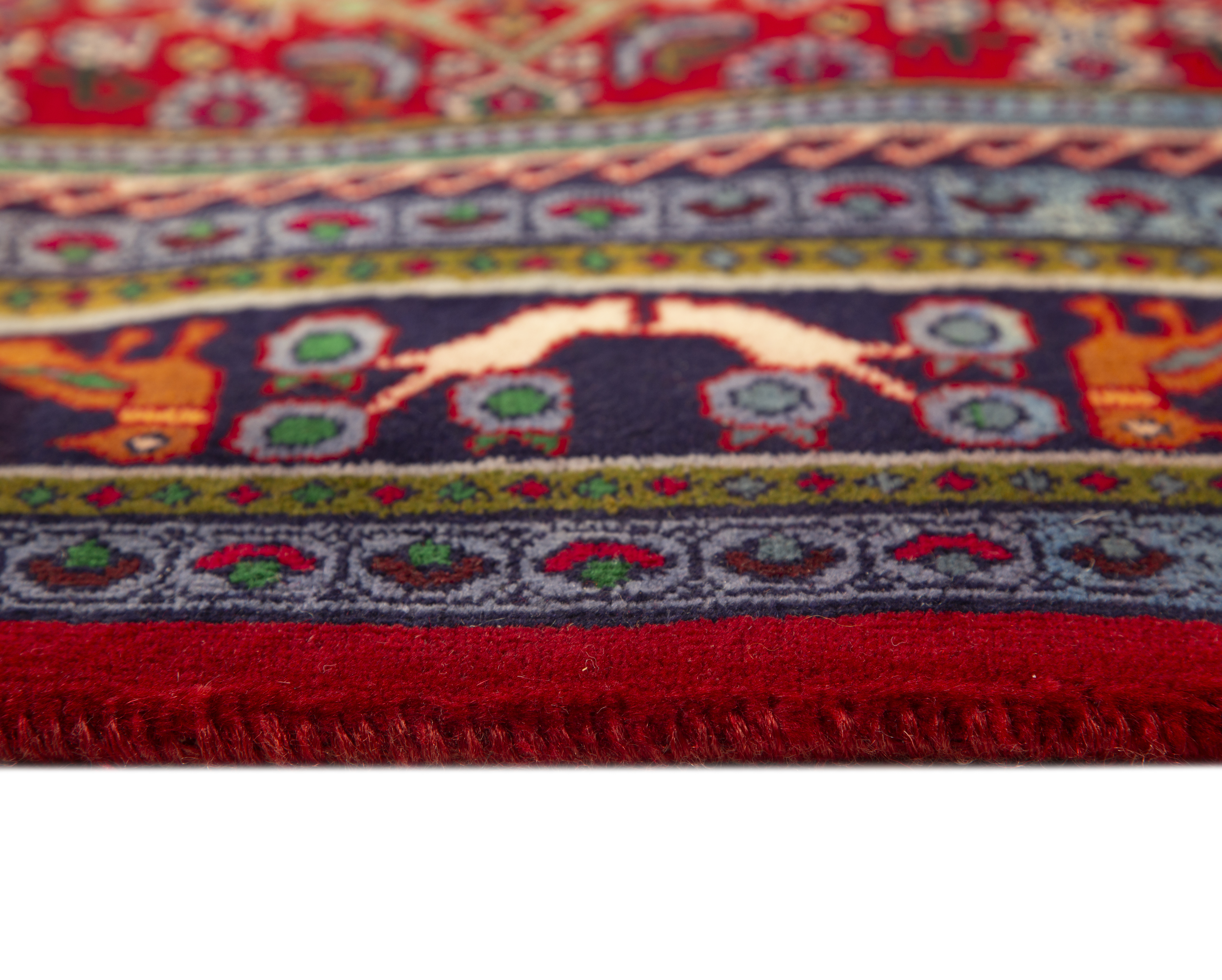 accents of gold create compositions of visual richness. These colors, achieved with natural dye materials and traditional mordanting techniques, possess the luminous depth and organic warmth that distinguishes genuine Persian