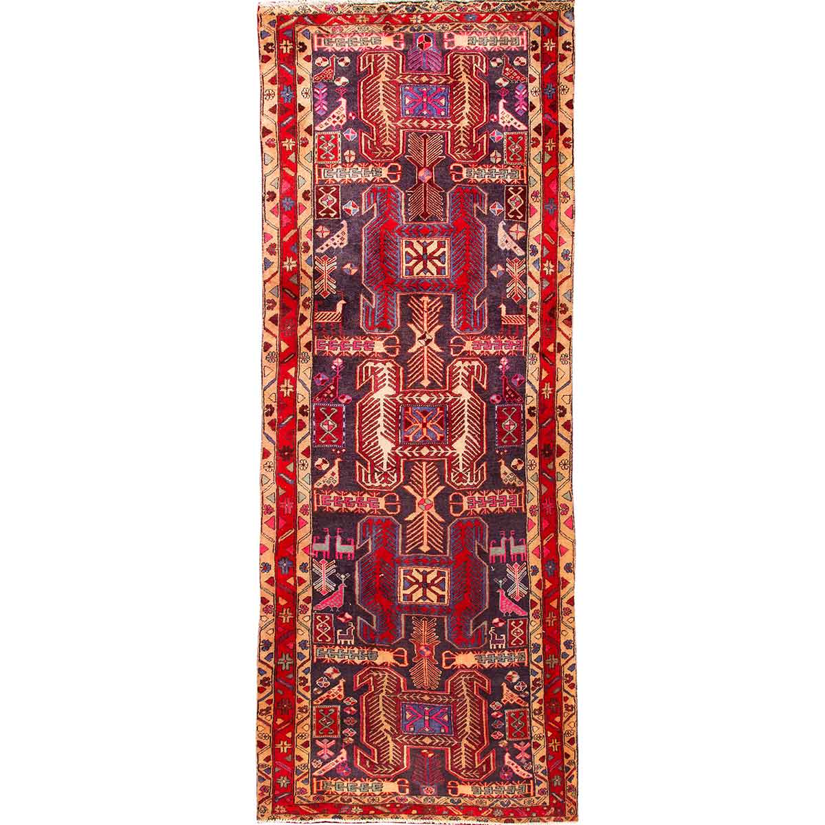 This magnificent 10'10" x 4'0" Ardabil Persian rug showcases the masterful geometric artistry that has defined this celebrated weaving tradition for over four centuries. The striking interplay of dark red and burgundy creates a rich foundation, beautifully contrasted by deep navy blue borders and delicate cream accents that dance throughout the intricate tribal motifs. At 25-40 years old, this exceptional piece has developed the perfect patina that only authentic Persian rugs can achieve, with colors that have mellowed into a sophisticated harmony of wine red, royal blue, and warm ivory tones.
