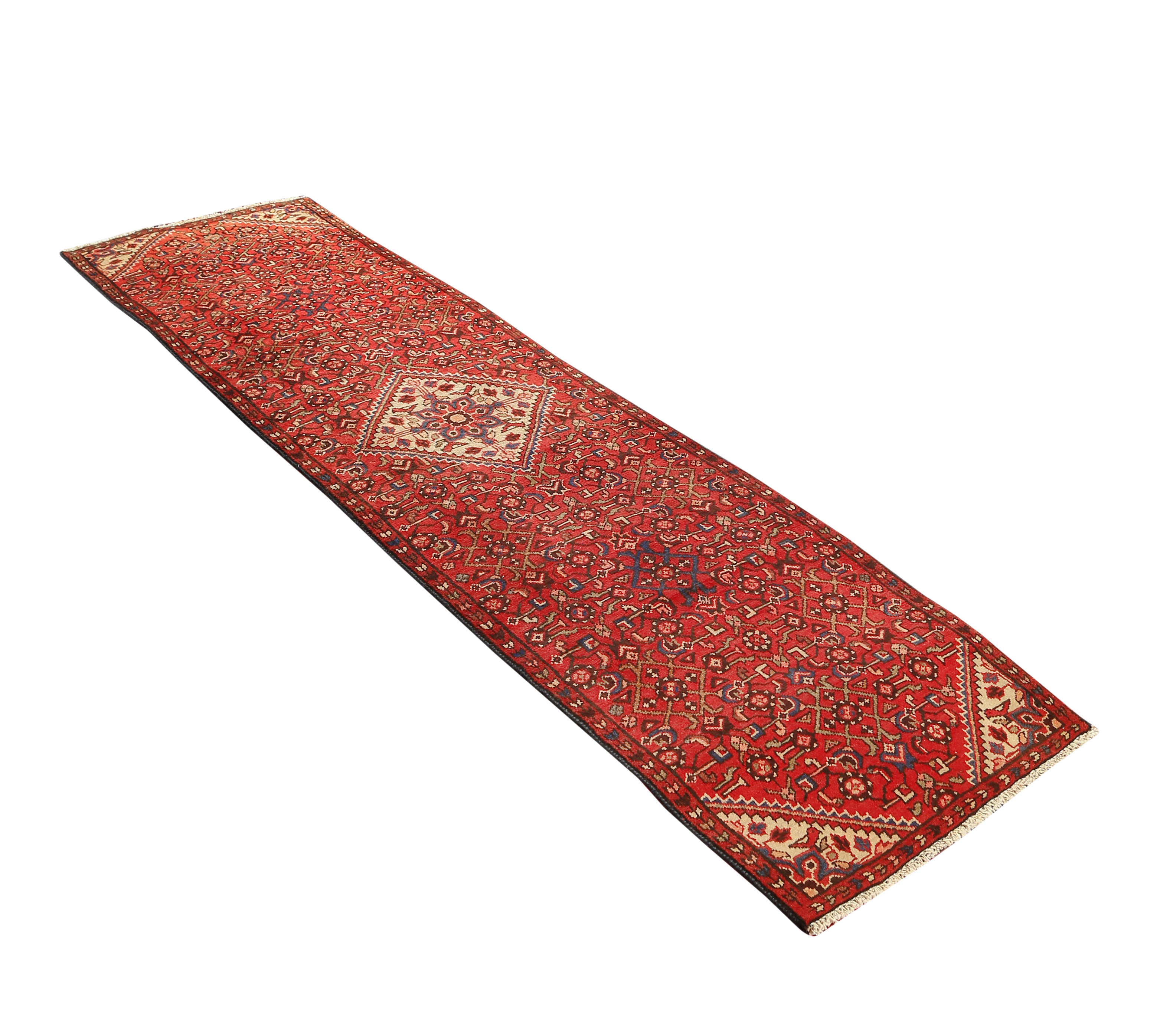 This magnificent semi antique Hamadan Persian runner, measuring 10'2" x 2'7", showcases the timeless beauty of traditional Persian craftsmanship with its intricate Herati (Mahi) motif dancing across a rich madder red field. The sophisticated diamond lattice pattern creates a mesmerizing visual rhythm, while delicate cream and navy blue accents highlight the masterful artistry that has made Hamadan weavers legendary throughout Persia for centuries.