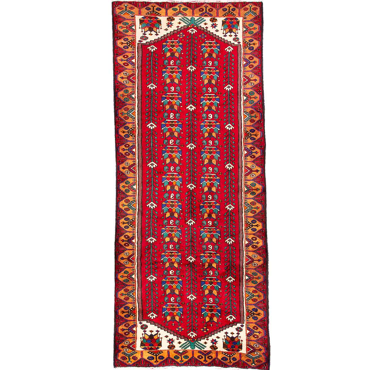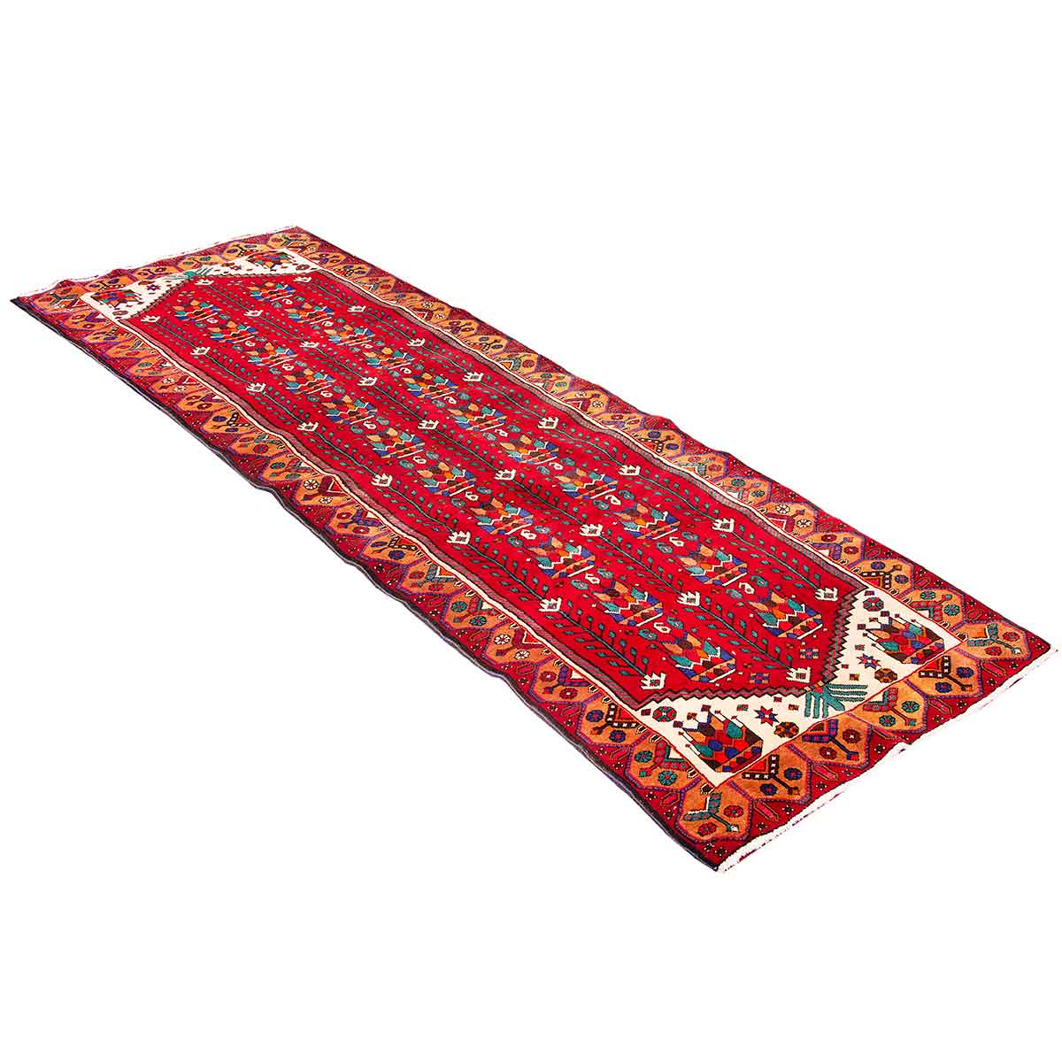 This Semi Antique Qashqai rug, measuring 10x3 ft, presents a distinguished Geometric composition in Crimson, Blue - hallmark characteristics of the Fars weaving tradition at its finest. The creative process of Qashqai rug weaving