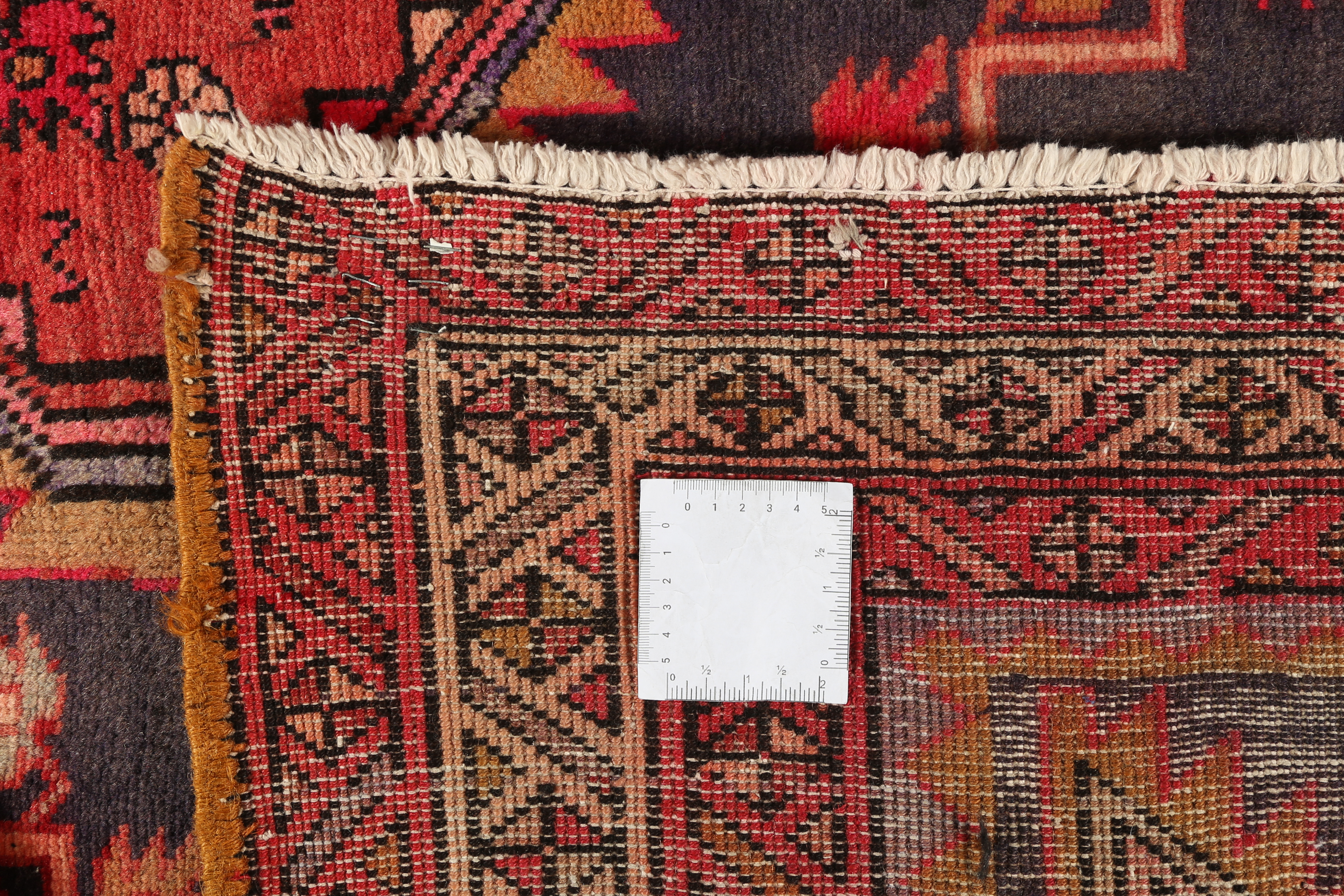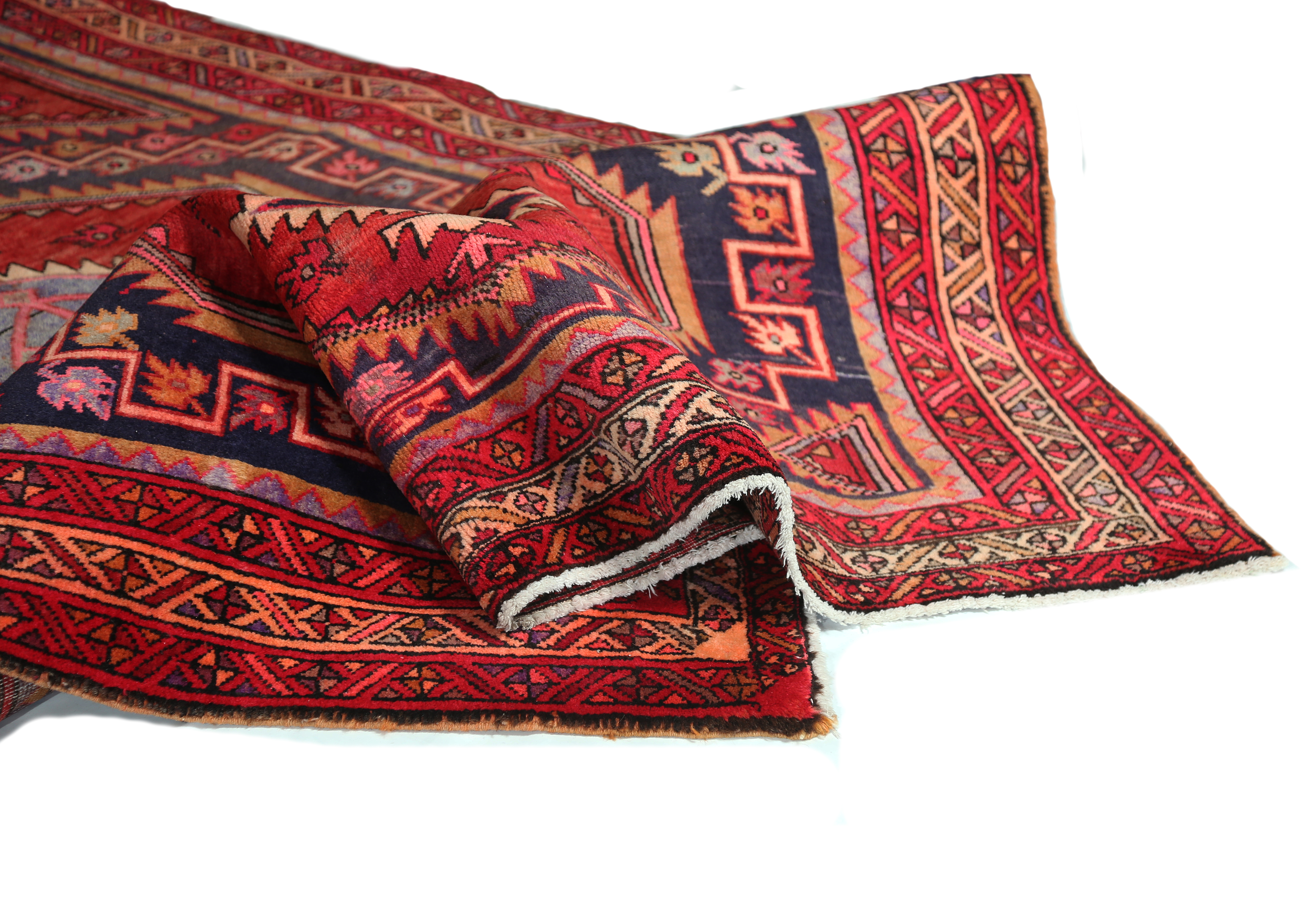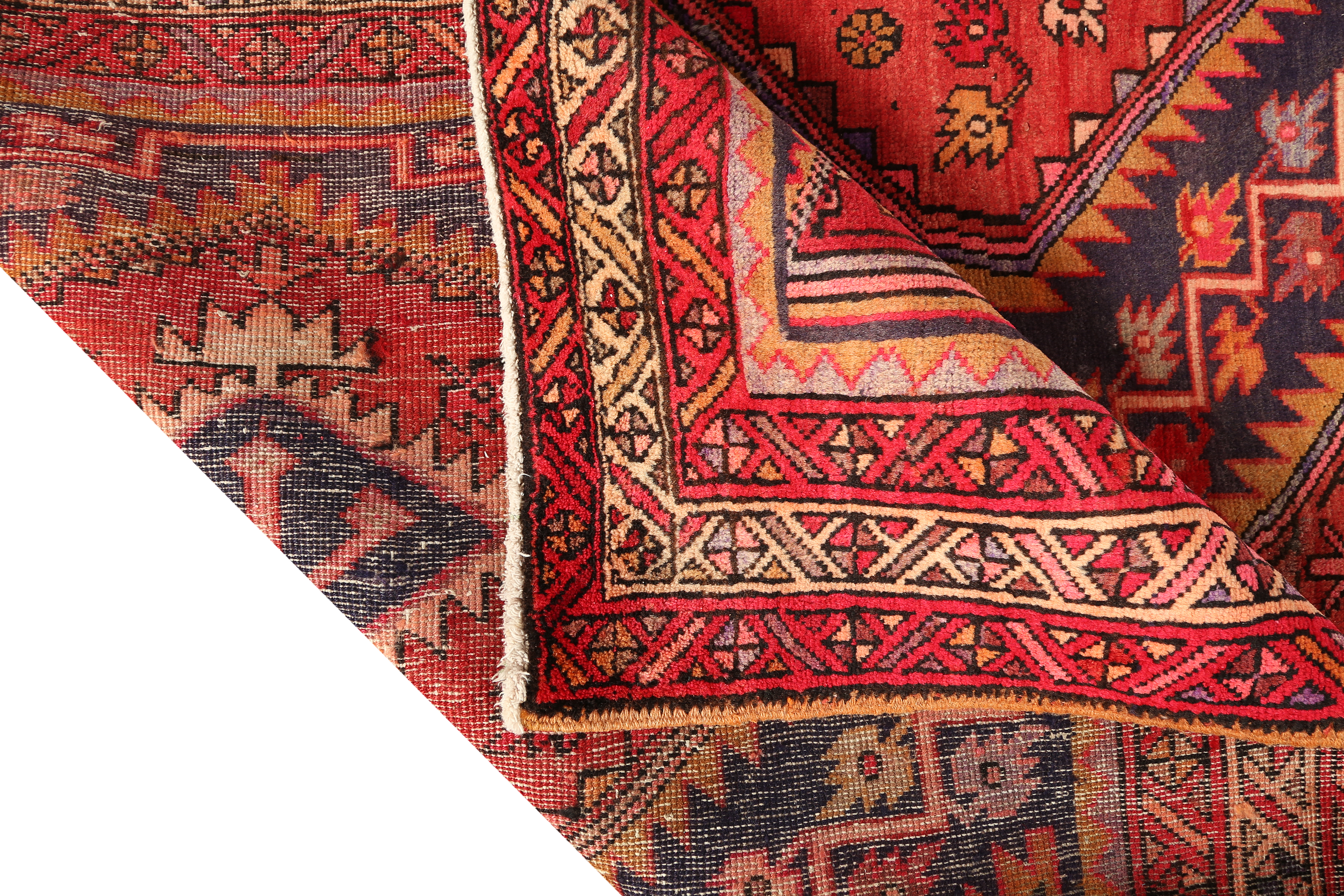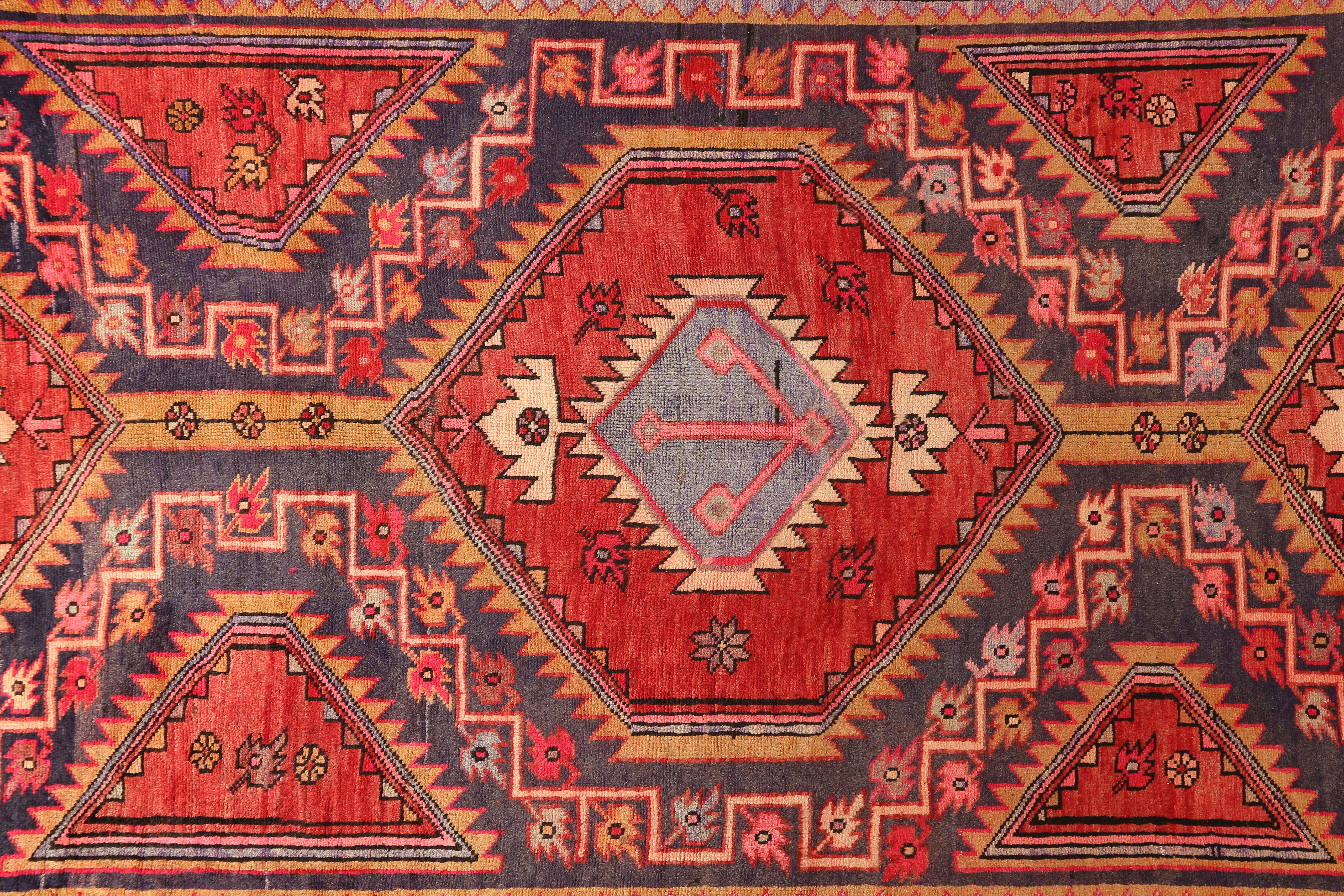 This exceptional semi antique Ardabil Persian rug at 10'2" x 4'10" presents a magnificent medallion toranj centerpiece surrounded by intricate geometric diamond lattice motifs. Woven 40-60 years ago in the historic city of Ardabil, this one-of-a-kind hand-knotted masterpiece elevates any space with its authentic Persian craftsmanship and timeless elegance. The rich madder red field provides a stunning backdrop for the navy blue central medallion, while brick red accents create depth and visual interest throughout the composition.