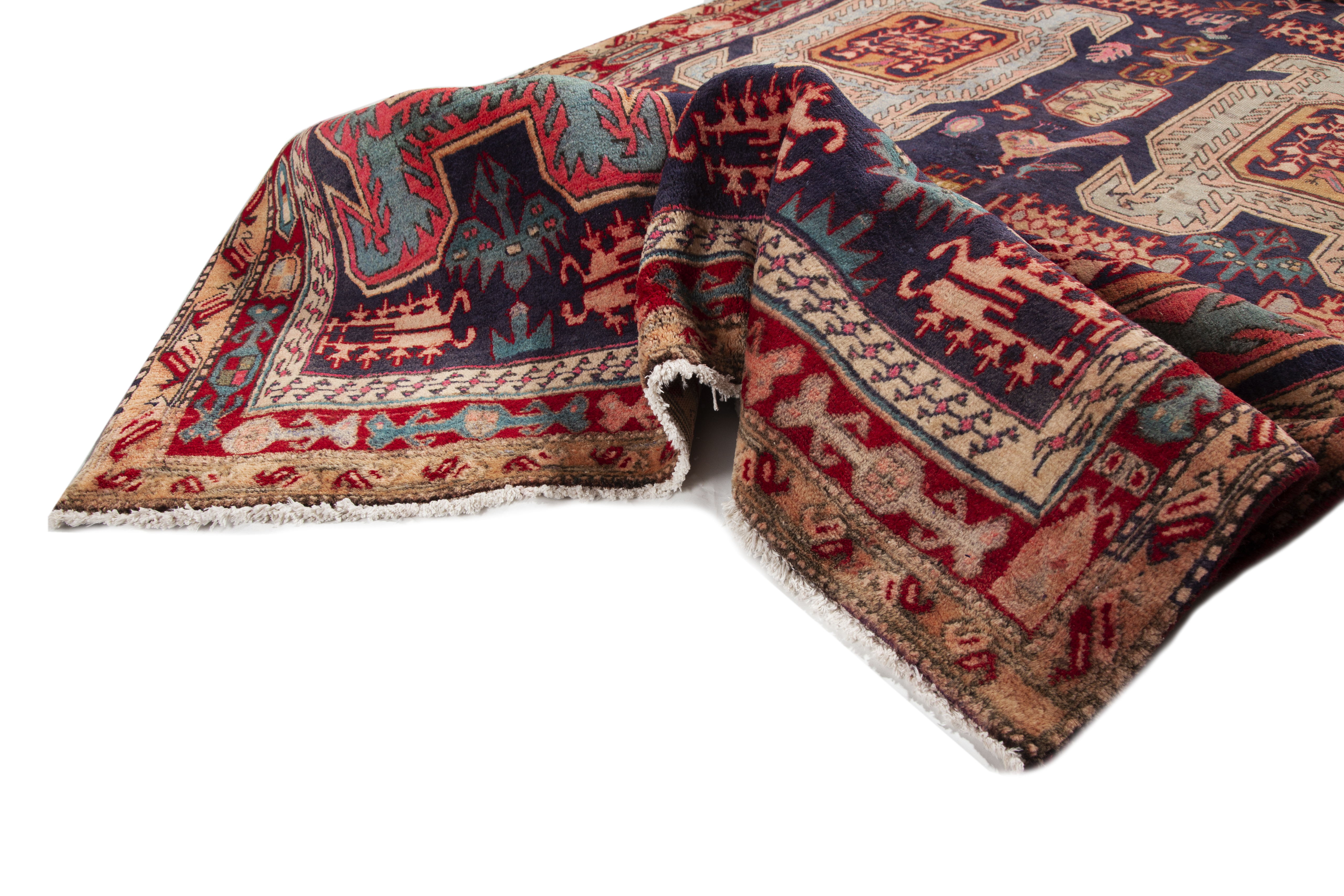 This exquisite semi antique Ardabil Persian rug, measuring 10'2" x 4'12", represents four decades of graceful aging from the mountainous region of northwestern Persia. The rug's striking geometric medallion design, known as Toranj, creates a captivating focal point against a rich midnight blue field that has developed the lustrous patina characteristic of authentic Persian craftsmanship. Woven with symmetrical and asymmetrical knots on a foundation of natural cotton, this one-of-a-kind hand-knotted masterpiece elevates any living space with its sophisticated presence and cultural heritage.
