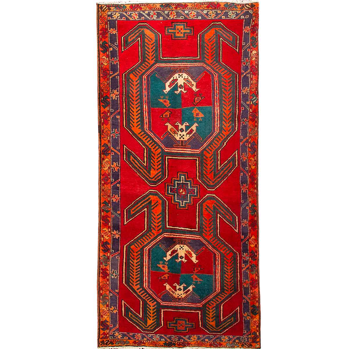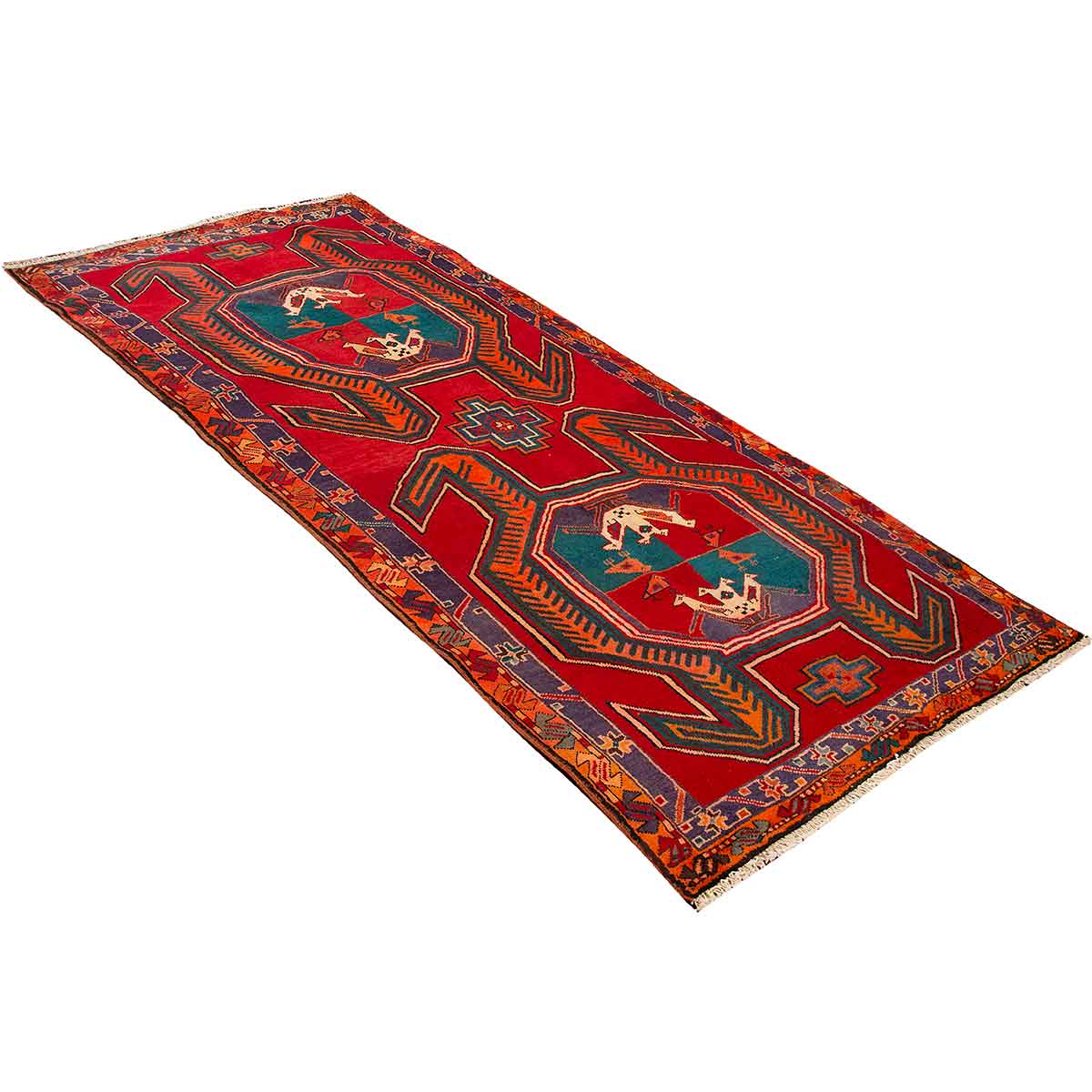 This exquisite 10'3" x 4'4" Ardabil Persian rug showcases the masterful artistry of contemporary Persian weaving, featuring a breathtaking medallion (Toranj) centerpiece surrounded by intricate geometric patterns that dance across the field in perfect harmony. The vibrant red foundation creates a bold canvas for the sophisticated navy blue, turquoise, and cream motifs, while delicate accents of orange, brown, green, and burgundy add layers of complexity that reveal new details with every viewing angle.