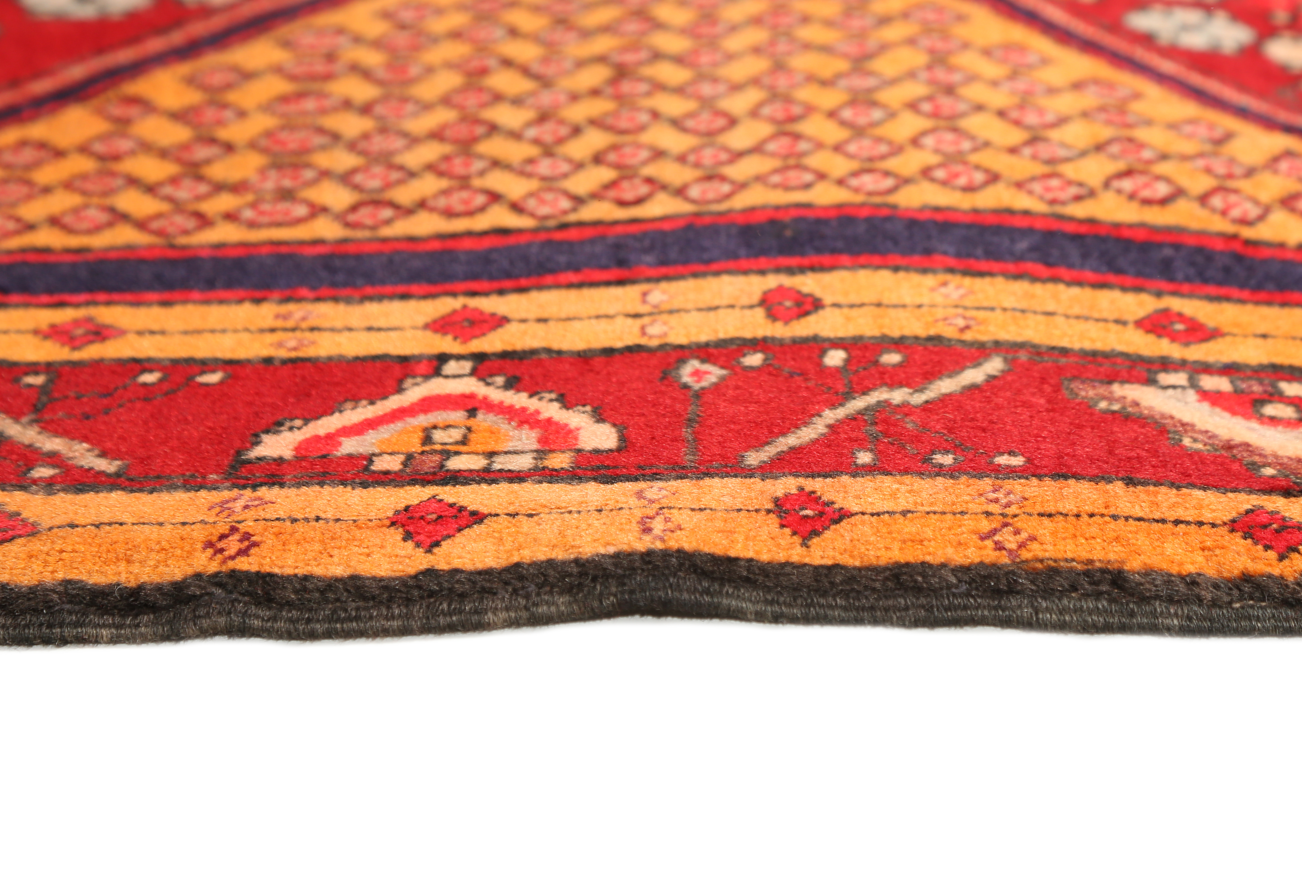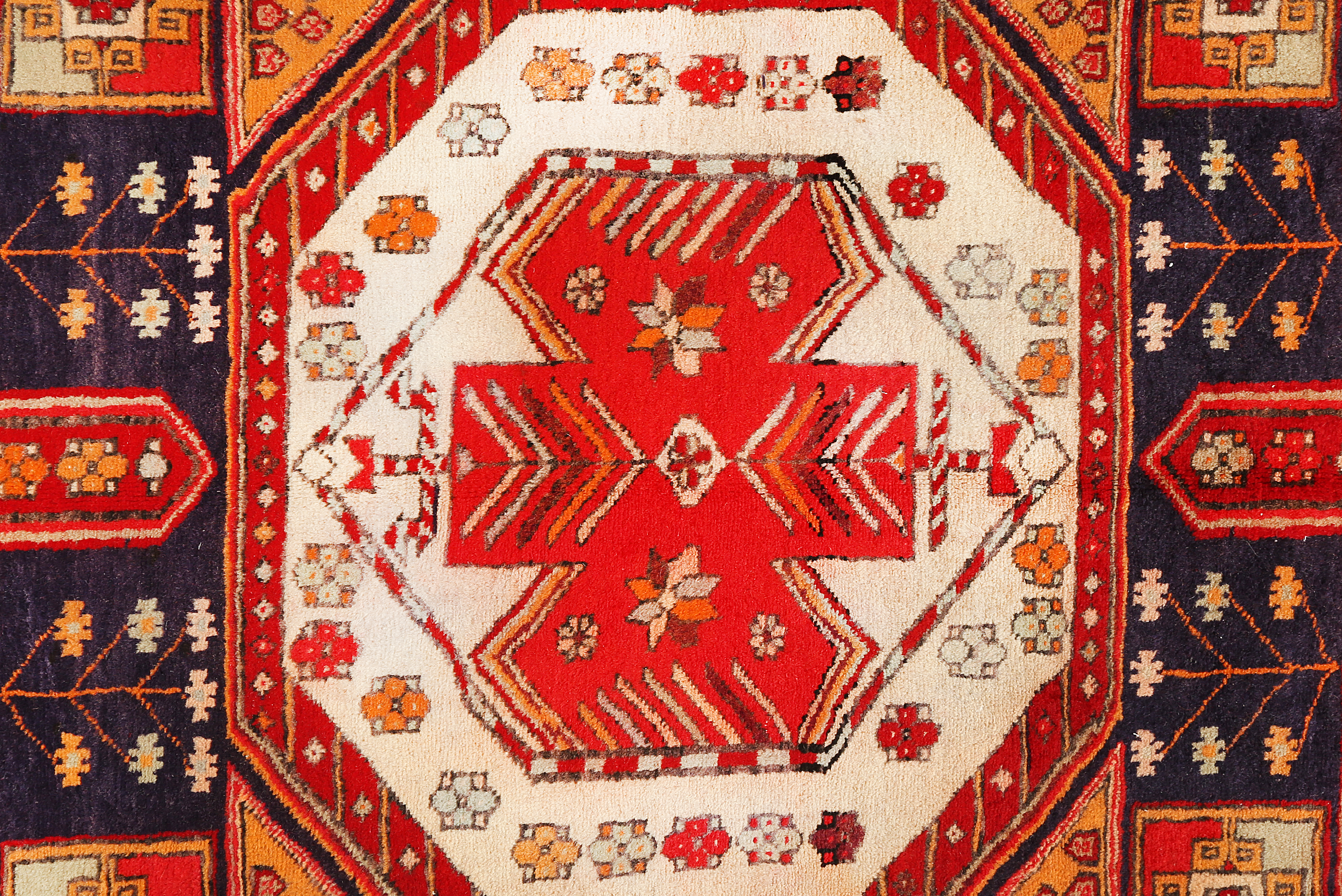 This magnificent semi antique Ardabil Persian rug measuring 10'6" x 4'7" showcases the masterful artistry of Persian weavers from four to six decades past, presenting a captivating geometric medallion design that speaks to centuries of weaving tradition. The elongated proportions make this piece exceptionally versatile for hallways, galley kitchens, or as a stunning runner beneath a dining table, where its rich tapestry of red, cream, navy blue, gold, rust red, ivory, black, and burgundy creates an atmosphere of refined elegance.
