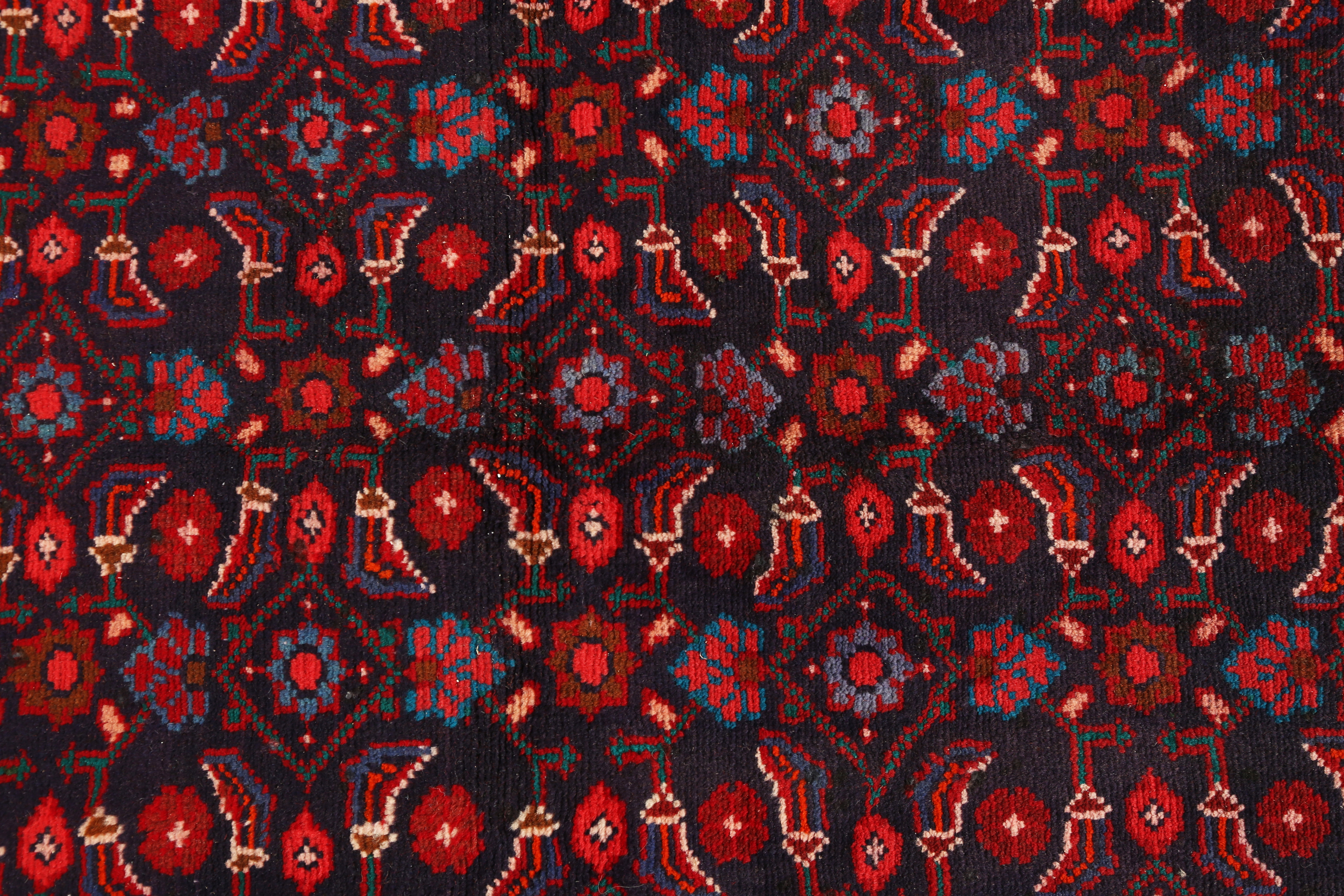 The Herati pattern, also known as Mahi or fish design, carries profound symbolic meaning in Persian culture, representing abundance and the flow of life through its interconnected diamond medallions and curved leaves that seem to swim across the field. Combined with the Afshan all-over pattern, this creates a mesmerizing visual rhythm that draws the eye while maintaining perfect balance. The madder red ground speaks to prosperity and celebration, while the navy blue borders represent wisdom and stability, making this a rug that brings both energy and grounding to any space.