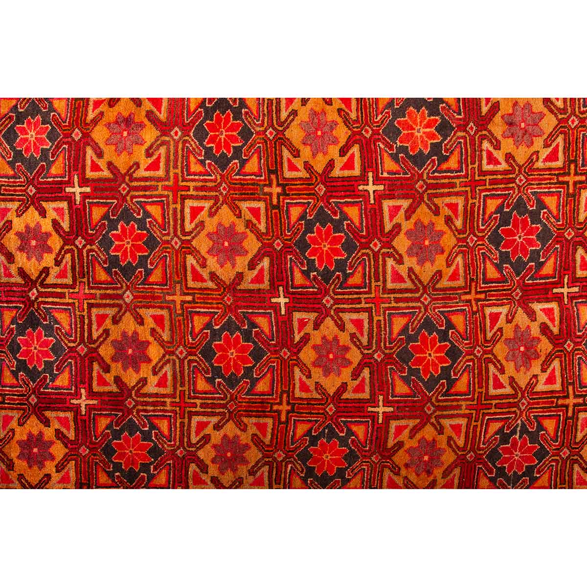 This extraordinary 10'6" x 4'9" Ardabil Persian rug presents a mesmerizing display of geometric mastery, where traditional diamond lattice patterns dance across a field of rich red and burnt orange. The semi antique character, developed over four to six decades, reveals itself through the subtle patina that graces each carefully hand-knotted knot. Vibrant crimson borders frame the intricate Gol Farang motifs, while accents of navy blue, cream, yellow, and gold create a symphony of color that speaks to centuries of Persian artistic tradition.