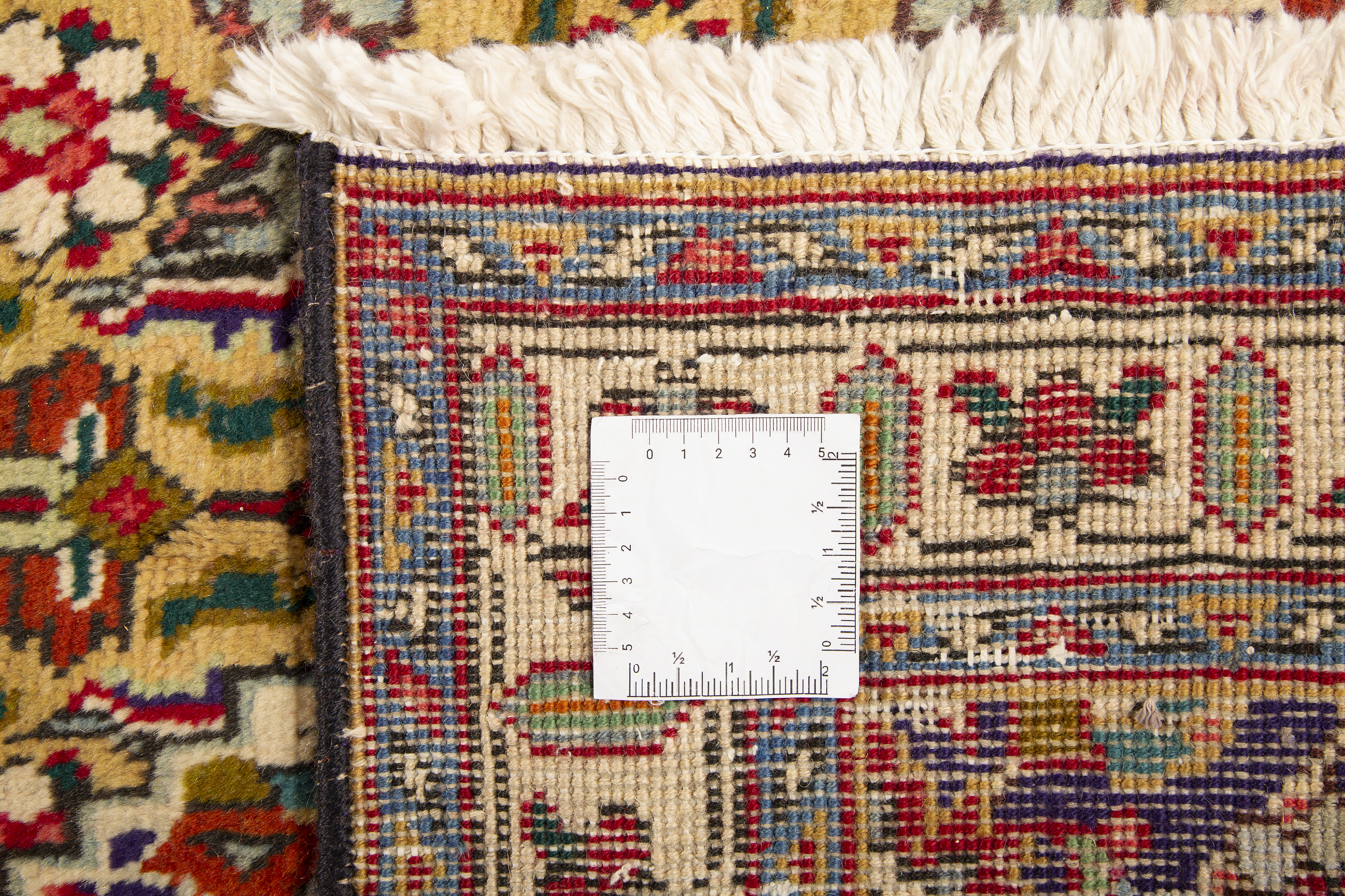 This magnificent semi-antique Ardabil Persian rug measuring 10'6" x 8'0" showcases the refined artistry of Persian weaving through its captivating medallion design and exceptional color palette. The luminous gold field provides a radiant foundation for the intricate central toranj, while rich madder red and deep navy blue accents create striking visual depth throughout the composition. Forest green, burgundy, and emerald details interlace with cream and ivory highlights, enhanced by subtle rust red and Persian blue nuances that demonstrate the masterful dye techniques of traditional Persian craftsmen.
