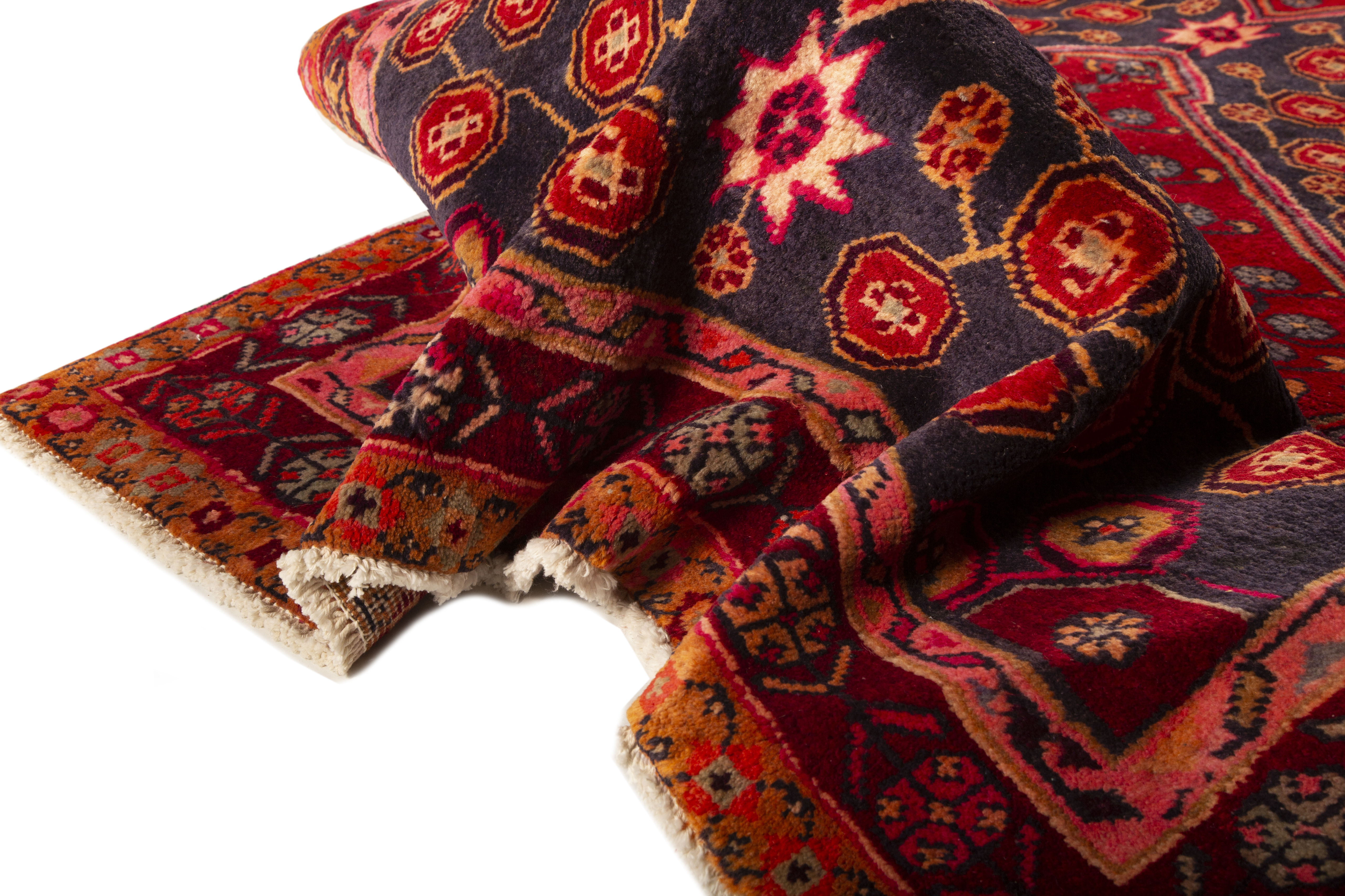 A superb example of Kurdish weaving heritage, this 10x4 ft Semi Antique rug showcases the celebrated Medallion design of Kurdistan, Kermanshah, Khorasan, Mazandaran, rendered here in rich tones of Red, Blue with the authority of long tradition. The design tradition of Kurdish weaving centers on medallion compositions rendered with the confident drawing vocabulary of nomadic, village, city weaving culture. Working within a shared design tradition while expressing individual creative preferences, Kurdish weavers produce rugs of notable visual character - compositions that are simultaneously rooted in Persian cultural convention and freshly alive with the personality of their individual makers.