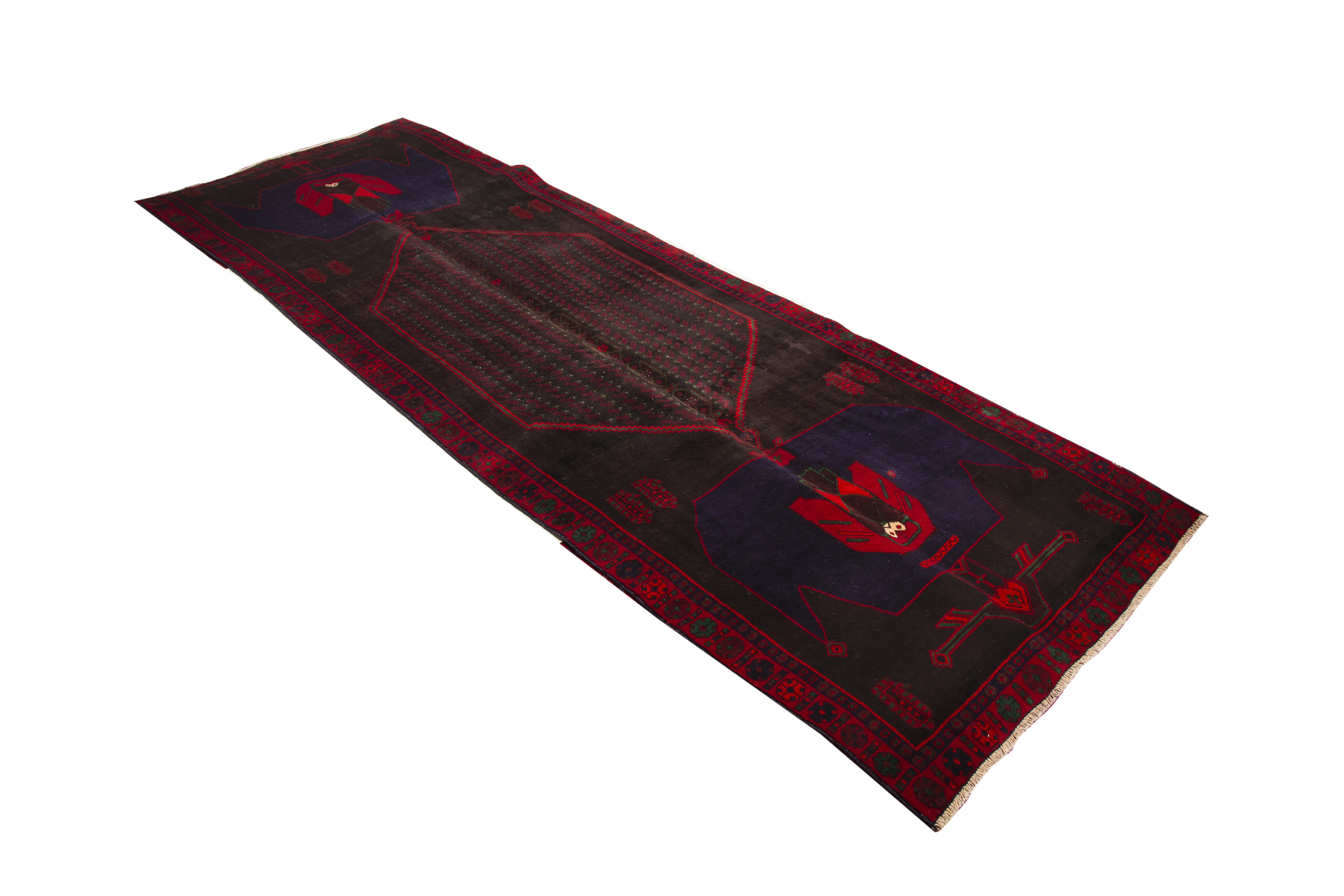 This magnificent semi-antique Bijar Persian rug measuring 10'8" x 4'9" showcases the extraordinary craftsmanship that has made these weavings legendary among collectors and interior designers. With its rich dark red field accented by navy blue, crimson, black, burgundy, and rust red tones, this exceptional piece demonstrates why Bijar rugs are often called the "iron rugs of Persia" for their incredible durability and structural integrity. The central medallion, known as Toranj in Persian, creates a stunning focal point surrounded by intricate geometric patterns that reflect the tribal and nomadic heritage of this distinguished weaving tradition.