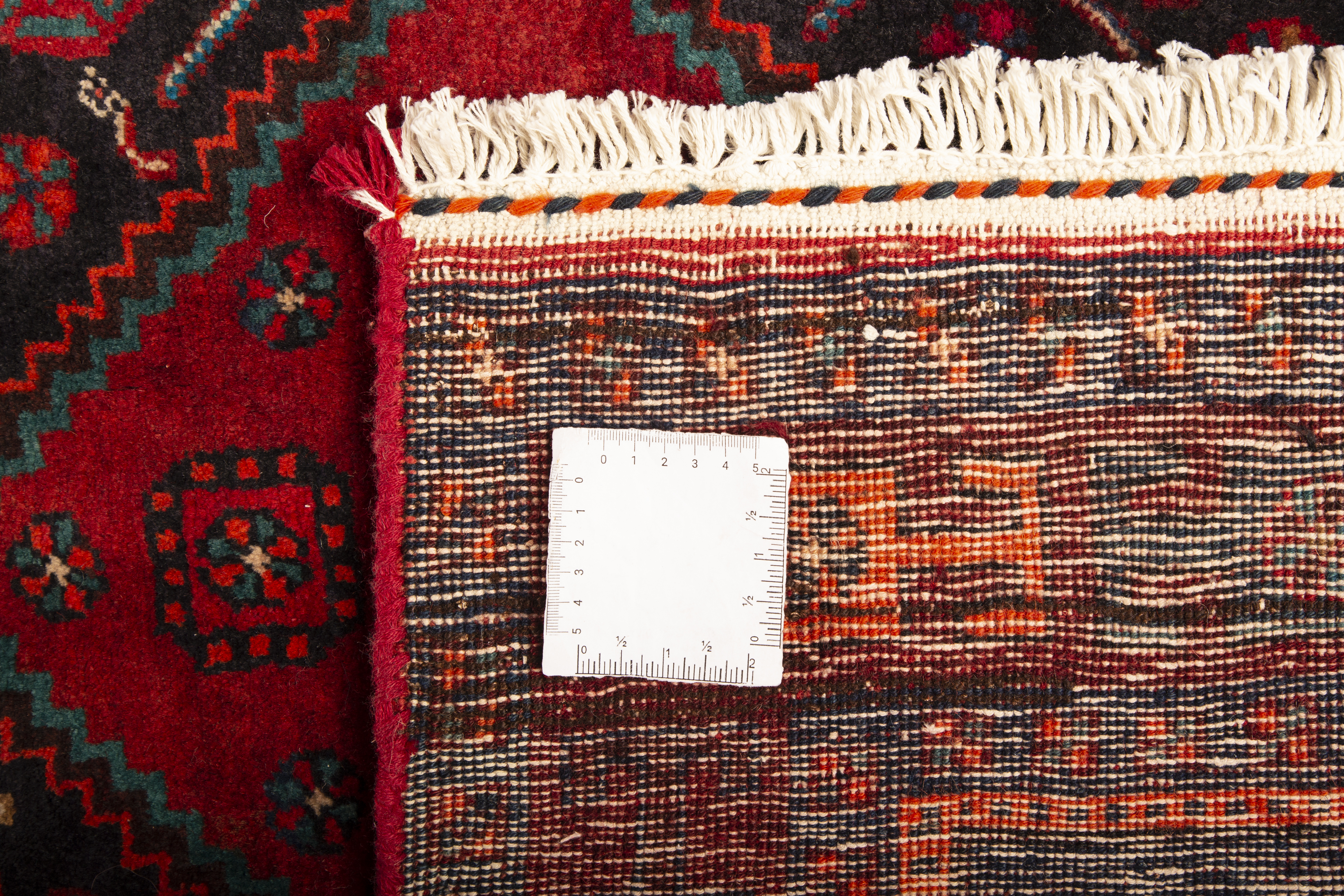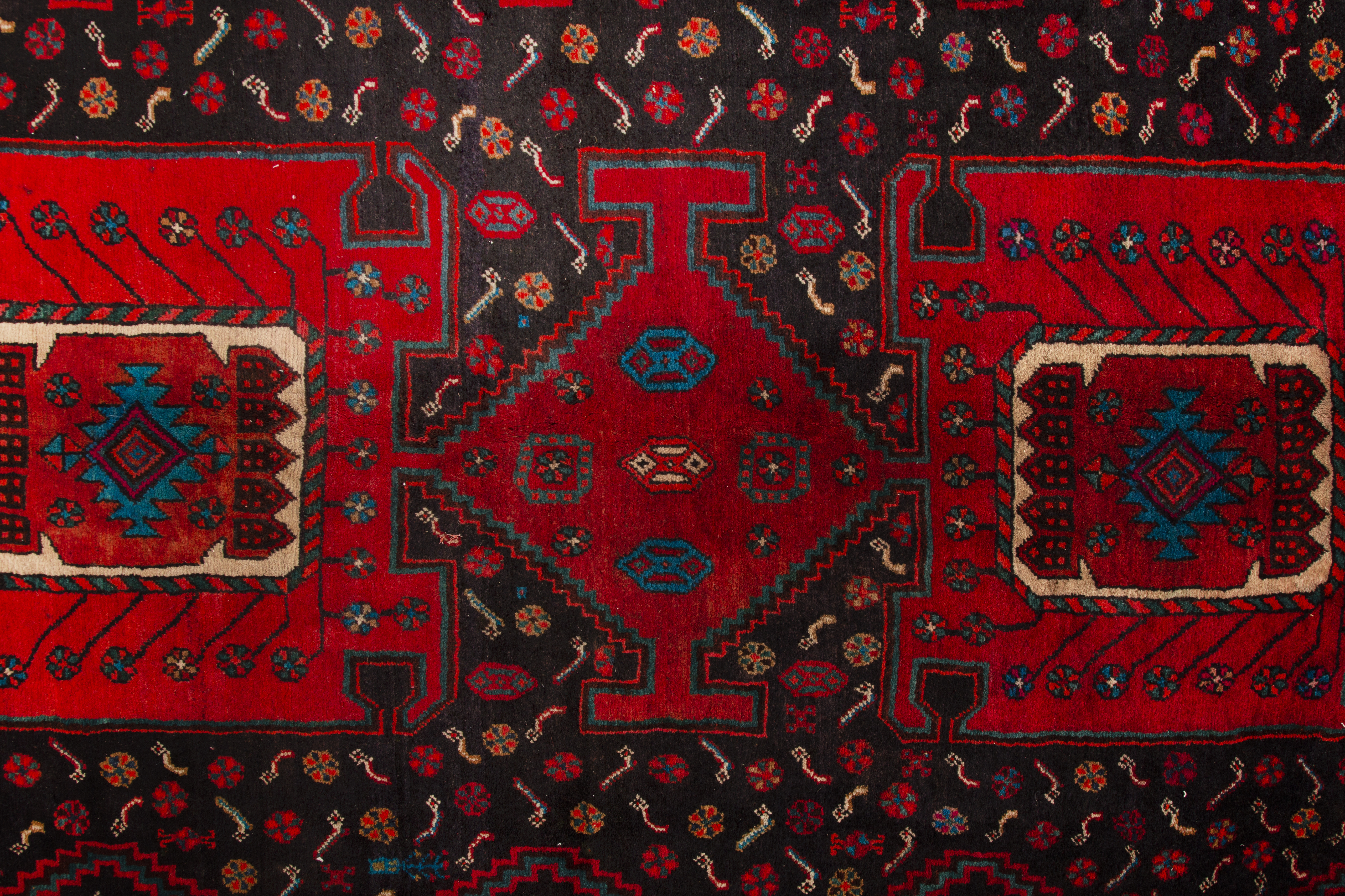 The rich color palette of dark red, navy blue, and crimson creates a dramatic foundation that speaks to the boldness of traditional Persian design philosophy. These deep, saturated tones are complemented by strategic touches of black for definition, ivory for contrast, and brown for earthen warmth. The semi-antique patina, developed over 40 to 60 years of careful use, has mellowed these colors to perfection, creating subtle variations that add depth and character to every surface. The interplay between the dominant dark red field and the navy blue accents demonstrates the sophisticated color relationships that Persian masters understood intuitively, while the crimson highlights add vibrancy that prevents the overall composition from becoming too somber.