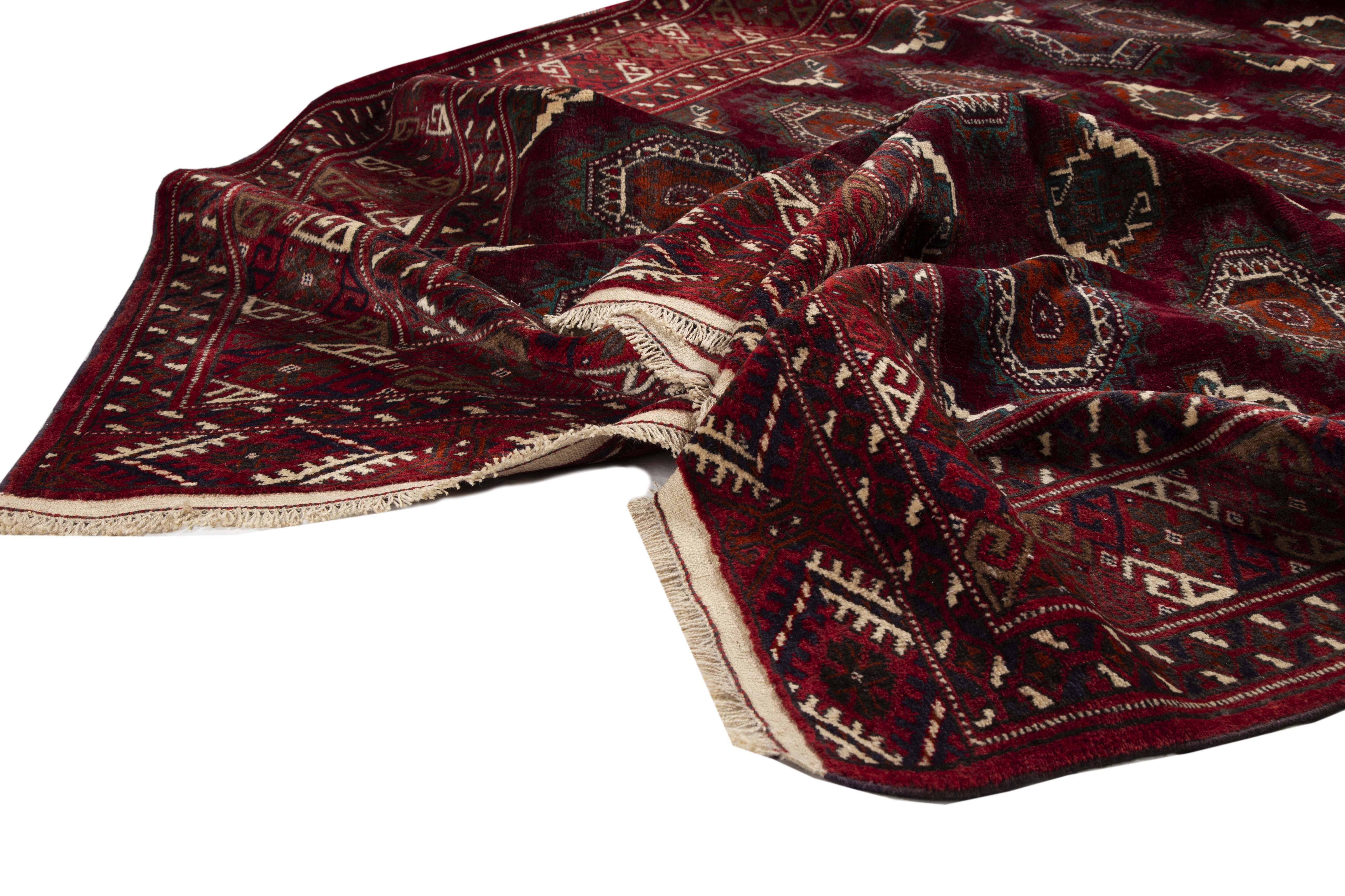 This hand-knotted Semi Antique Turkmen rug from Golestan, Khorasan - 11x7 ft - presents a compelling Geometric composition woven in Crimson, Navy Blue, a living record of one of Persia's great regional weaving traditions. Turkmen rugs stand entirely apart from all other Persian weaving traditions, distinguished by their extraordinary graphic power, their rigidly tribal design conventions, and the remarkable cultural identity encoded in every aspect of their composition. Produced by the Tekke, Yomut, Ersari, Salor, and other tribal groups of northeastern Persia and Central Asia, Turkmen rugs are instantly recognizable by their signature gul motifs - boldly geometric octagonal tribal emblems repeated with precision across a deep, jewel-like field.