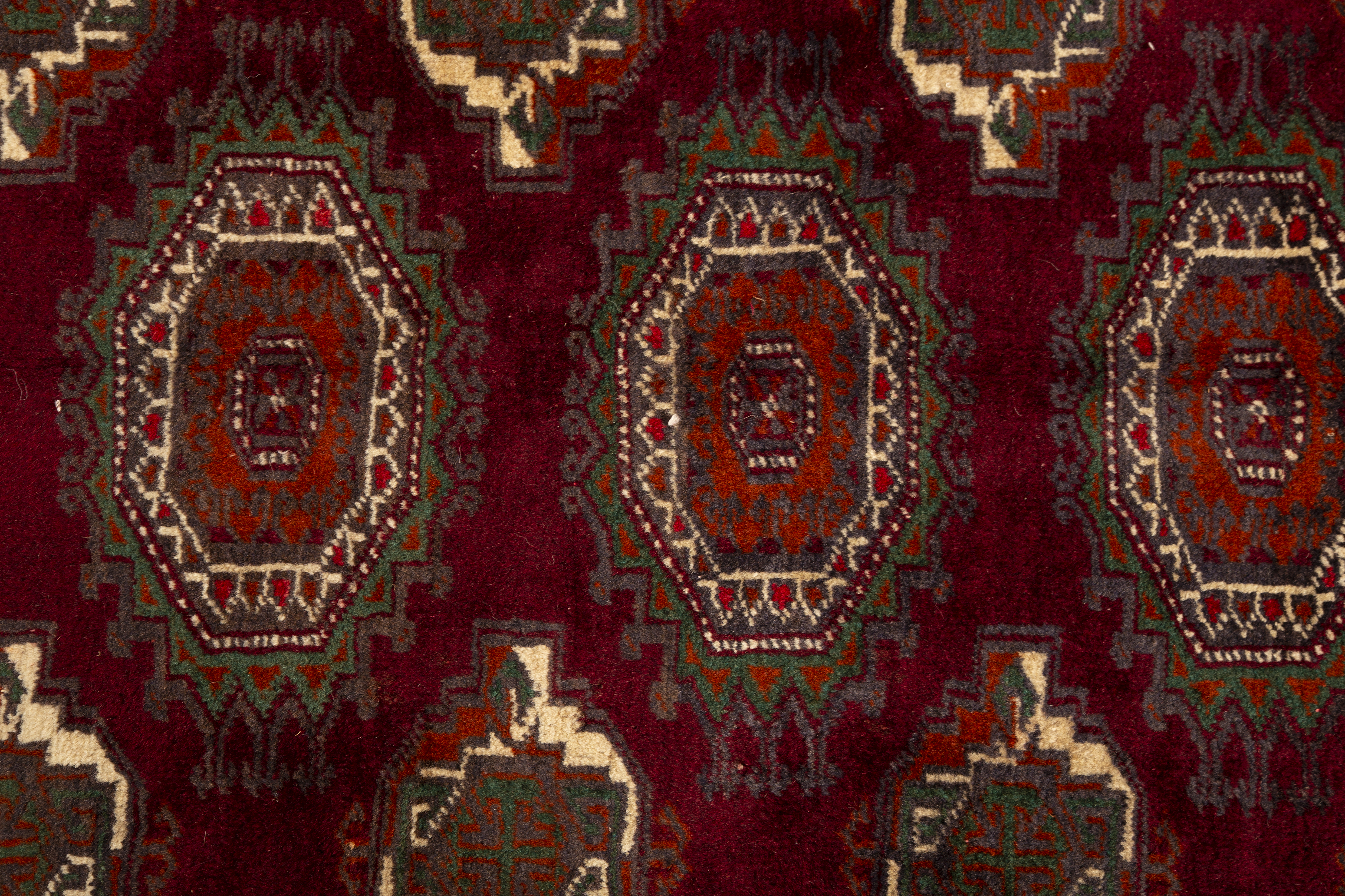 The color palette of Turkmen rugs is the most restricted and most immediately recognizable in all of Persian weaving. The characteristic deep, warm burgundy red - achieved with madder and pomegranate dyes processed by techniques developed over centuries - covers the majority of the field, contrasted with near-black secondary elements, dark blue accents, and the warm ivory of undyed wool. This palette reflects not commercial calculation but genuine cultural identity, the natural expression of a tribal aesthetic developed in the landscapes of Central Asia.