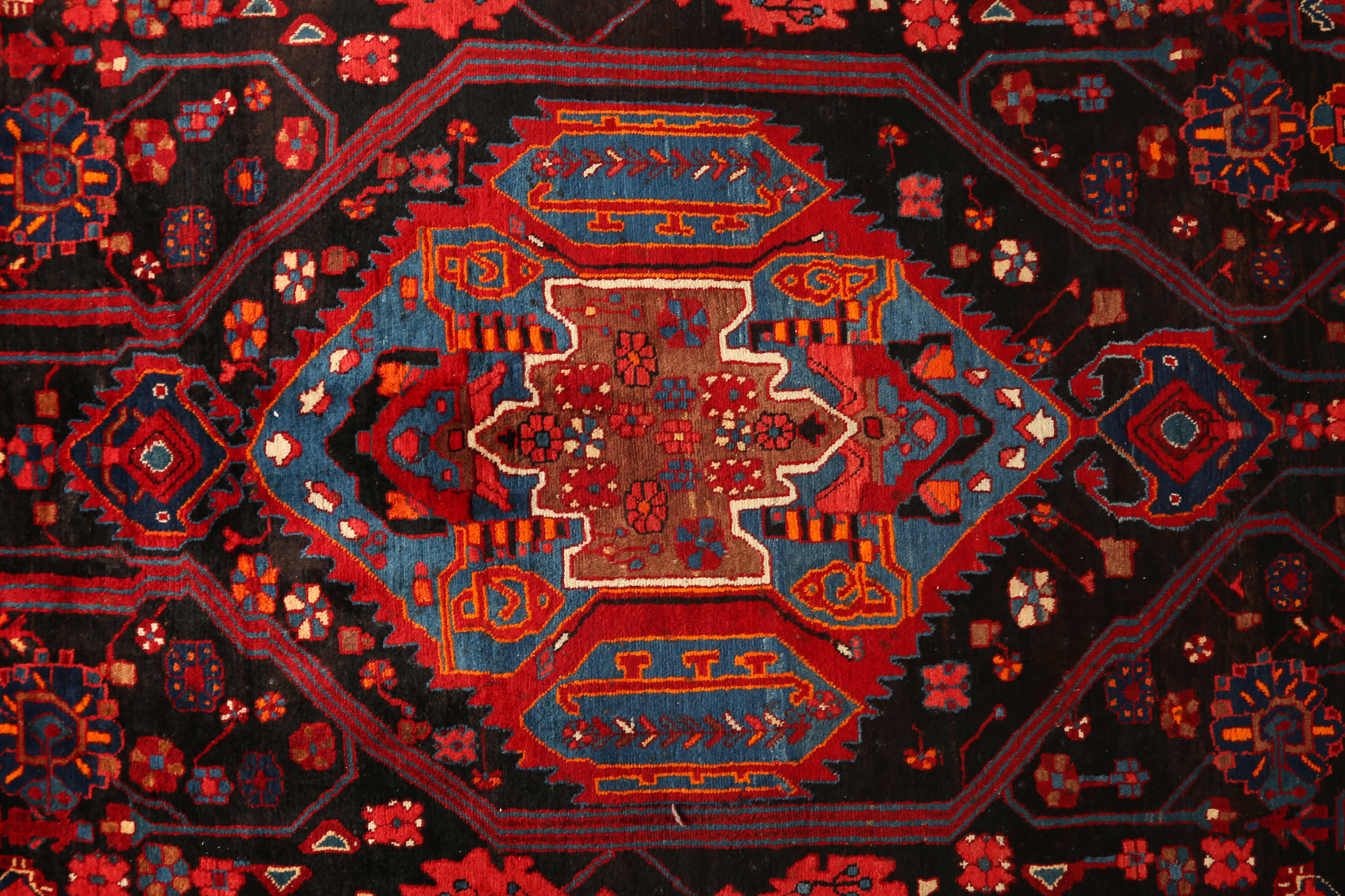 characteristic feature of Nahavand rug design is the boldly drawn central medallion - typically of geometric or semi-geometric form - that dominates the field composition. This medallion is usually surrounded by a richly filled
