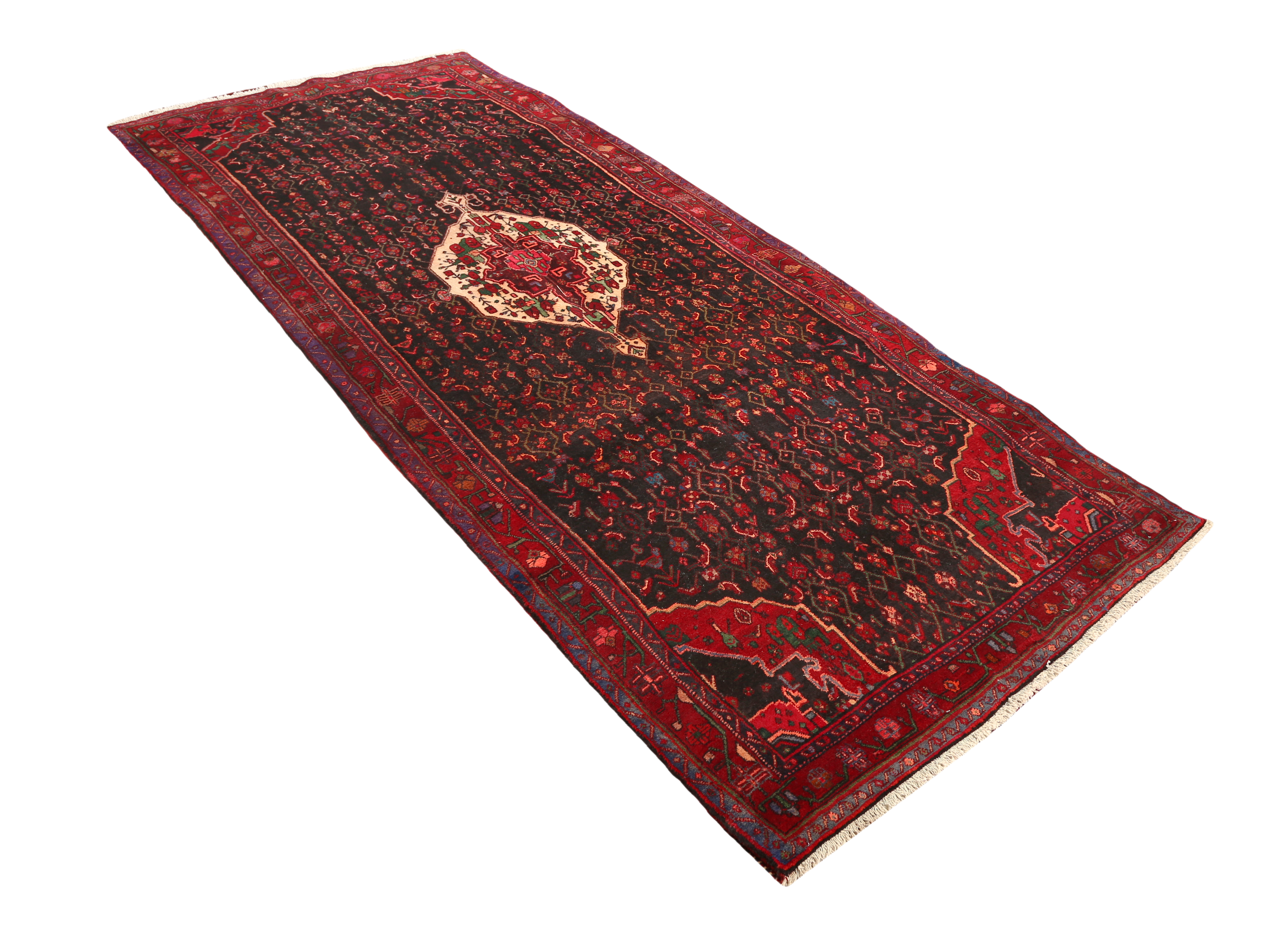 This magnificent semi antique Senneh Persian rug at 11'6" x 4'10" presents a breathtaking symphony of dark red and navy blue, enhanced by vibrant crimson, warm ivory, and touches of rust red, black, green, and gold. The classic medallion (Toranj) centerpiece commands attention while the intricate Herati (Mahi) patterns flow gracefully throughout the field, creating a harmonious balance that speaks to forty to sixty years of refined Persian artistry.