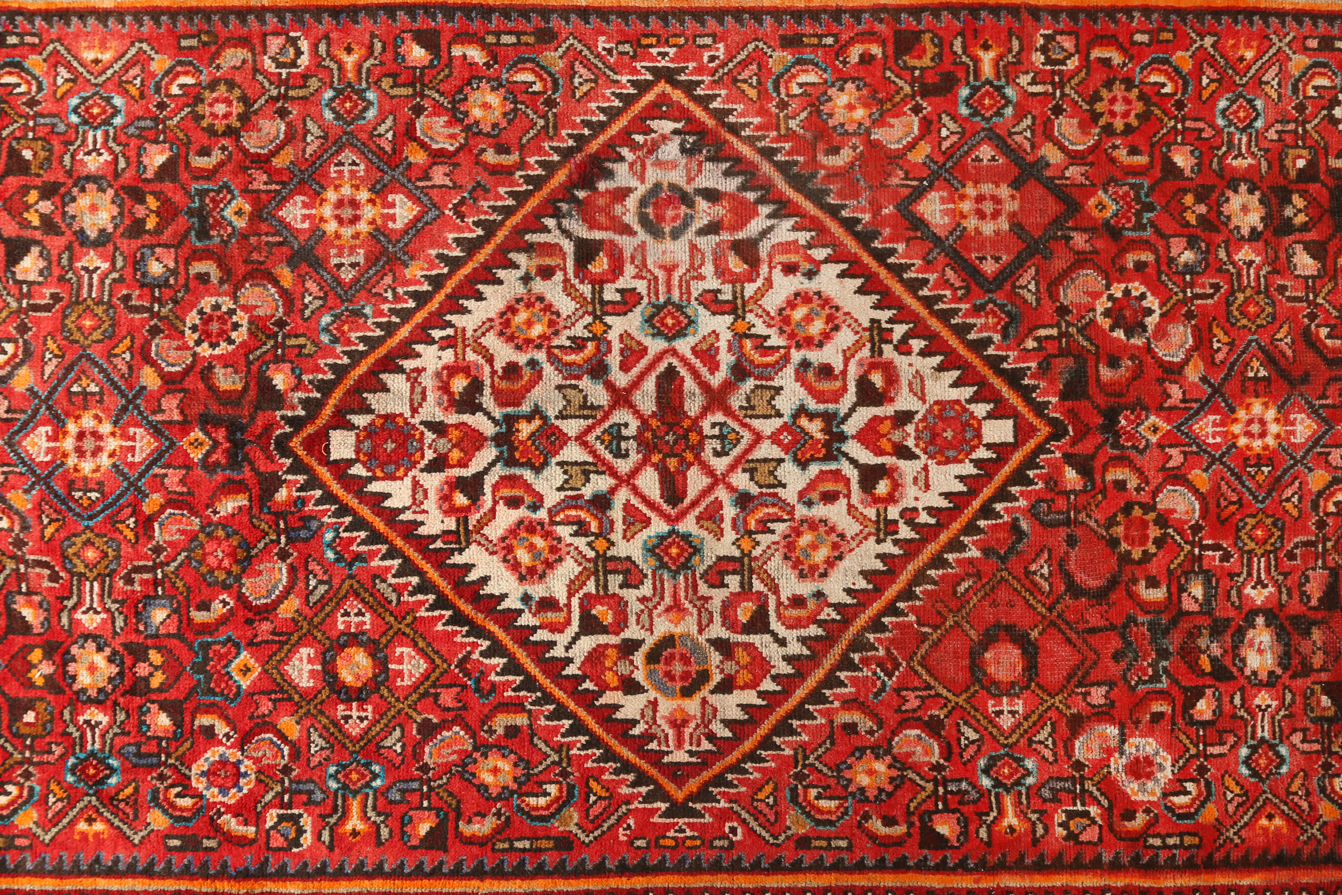 A superb example of Hamadan weaving heritage, this 11x5 ft Semi Antique rug showcases the celebrated Herati design of Hamadan, rendered here in rich tones of Red, Blue with the authority of long tradition. Each Hamadan rug is the