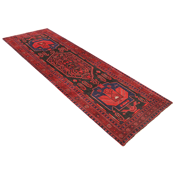 This magnificent semi antique Bijar Persian rug at 11'8" x 4'2" showcases the legendary durability and artistic mastery that has made Bijar weavings among the most coveted floor coverings in the world. The striking geometric patterns dance across a rich madder red field, accented by deep navy blue, vibrant crimson, bold black, luxurious burgundy, and pristine ivory, creating a tapestry of colors that tells the story of four decades of Persian craftsmanship. This exceptional piece represents the pinnacle of traditional Persian rug-making, where each knot was carefully placed by skilled artisans who inherited their techniques through generations of family tradition.