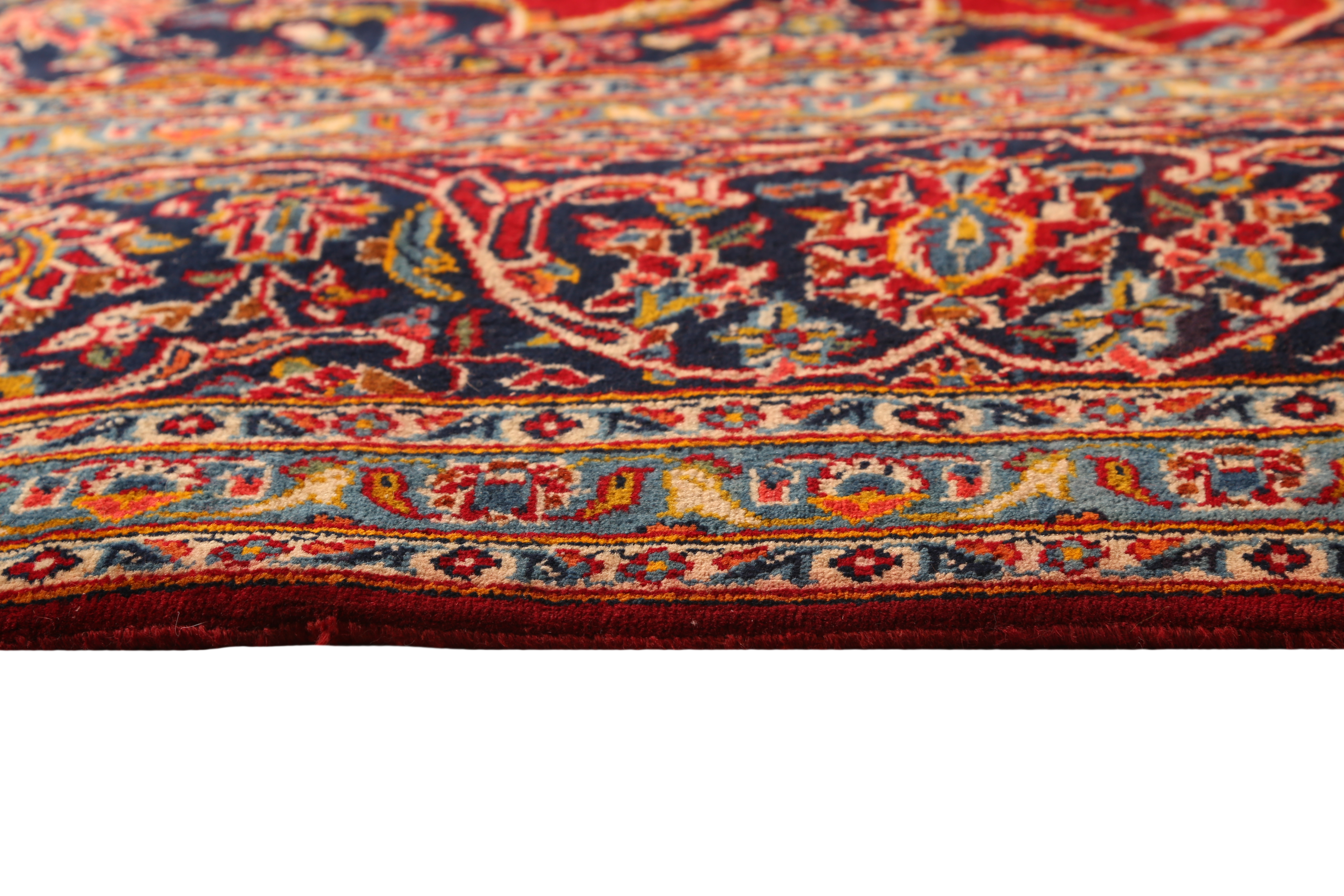This magnificent semi antique Kashan Persian rug measuring 11'8" x 8'2" showcases the sublime artistry of Persian master weavers through its intricate Shah Abbasi medallion design rendered in a captivating palette of crimson, navy blue, ivory, gold, forest green, brown, rust red, and beige. The substantial 11'8" x 8'2" foot dimensions make this piece perfectly suited for anchoring large living rooms, formal dining spaces, or grand entryways where its commanding presence can be fully appreciated.