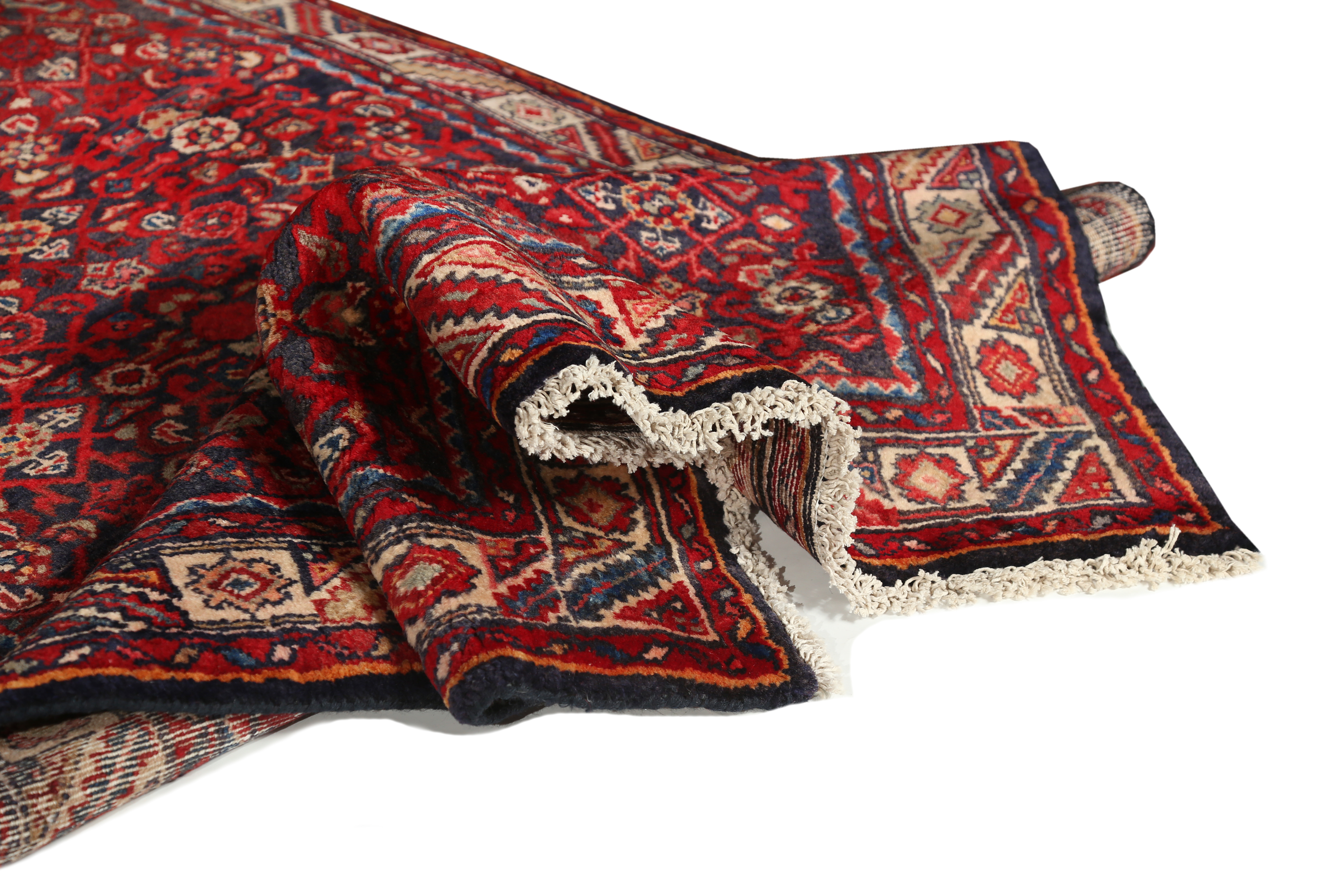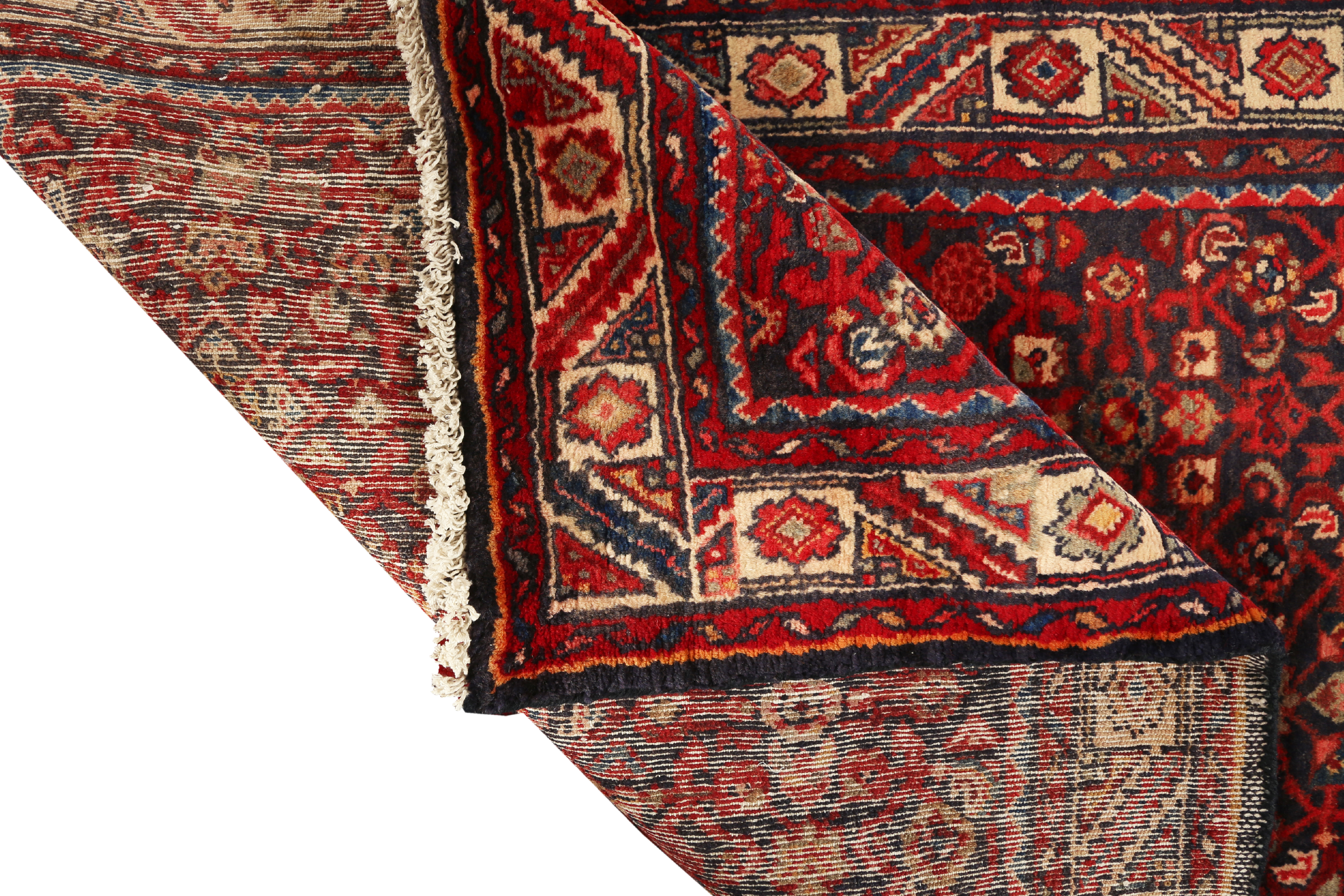 Semi-antique and antique Hamadan rugs are particularly valued for the warm, mellowed complexity that their natural dyes develop with age. The madder reds soften toward a warm brick tone, the indigo navies deepen into a rich