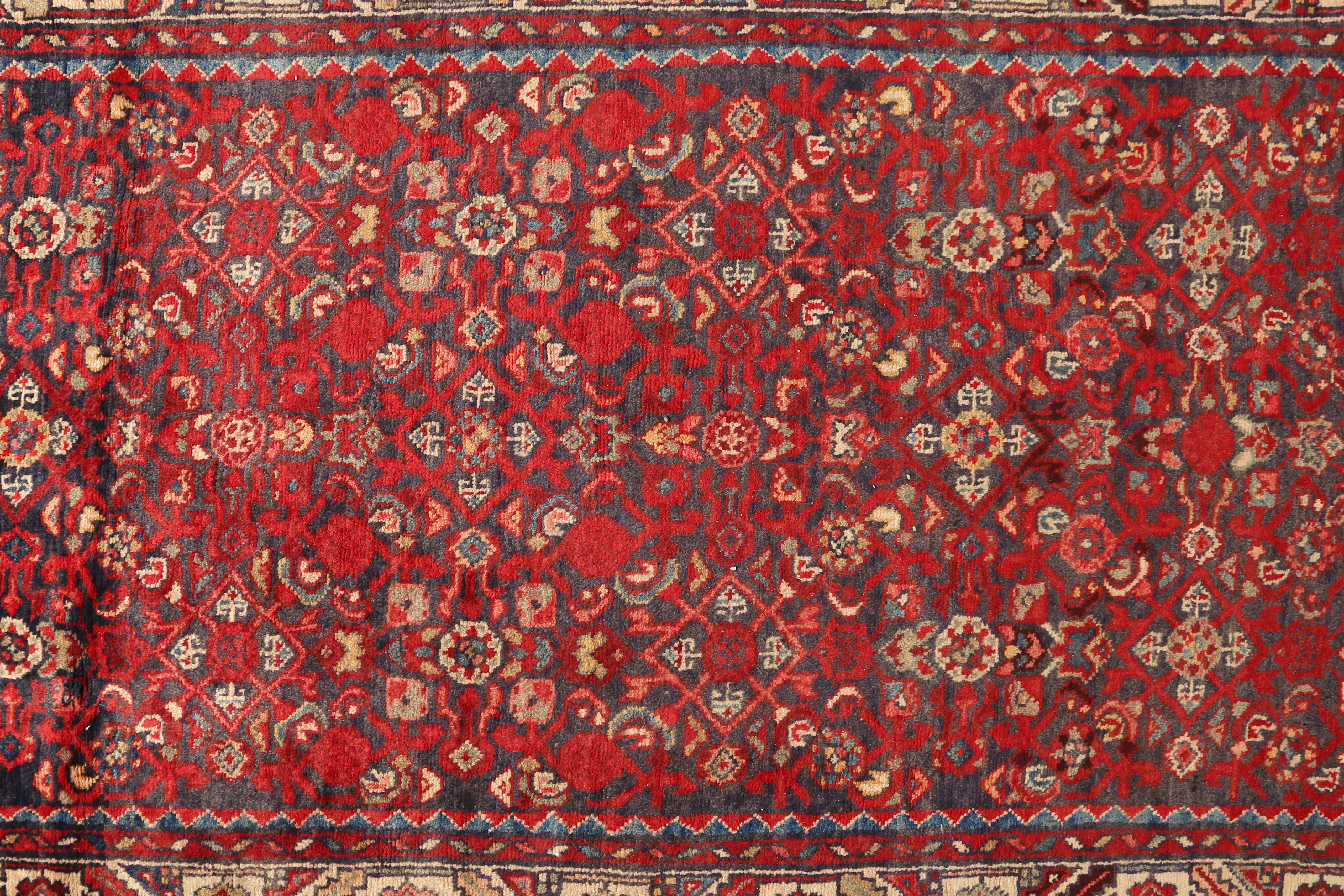 Measuring 12x3 ft and featuring a Herati design in Red, Blue, this Semi Antique Hamadan rug embodies the weaving culture of Hamadan - a tradition of exceptional artistry and enduring craft excellence. Each Hamadan rug is the