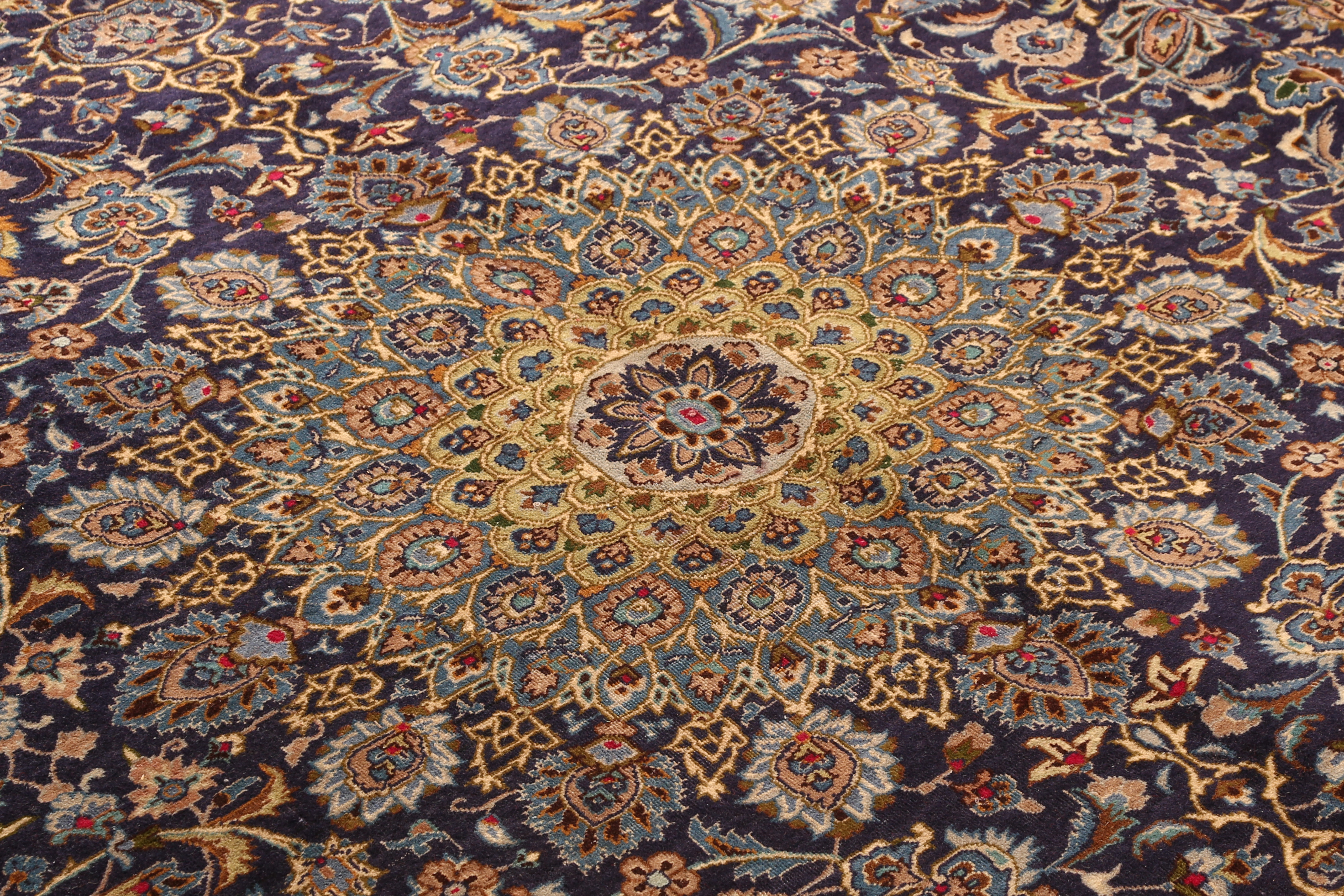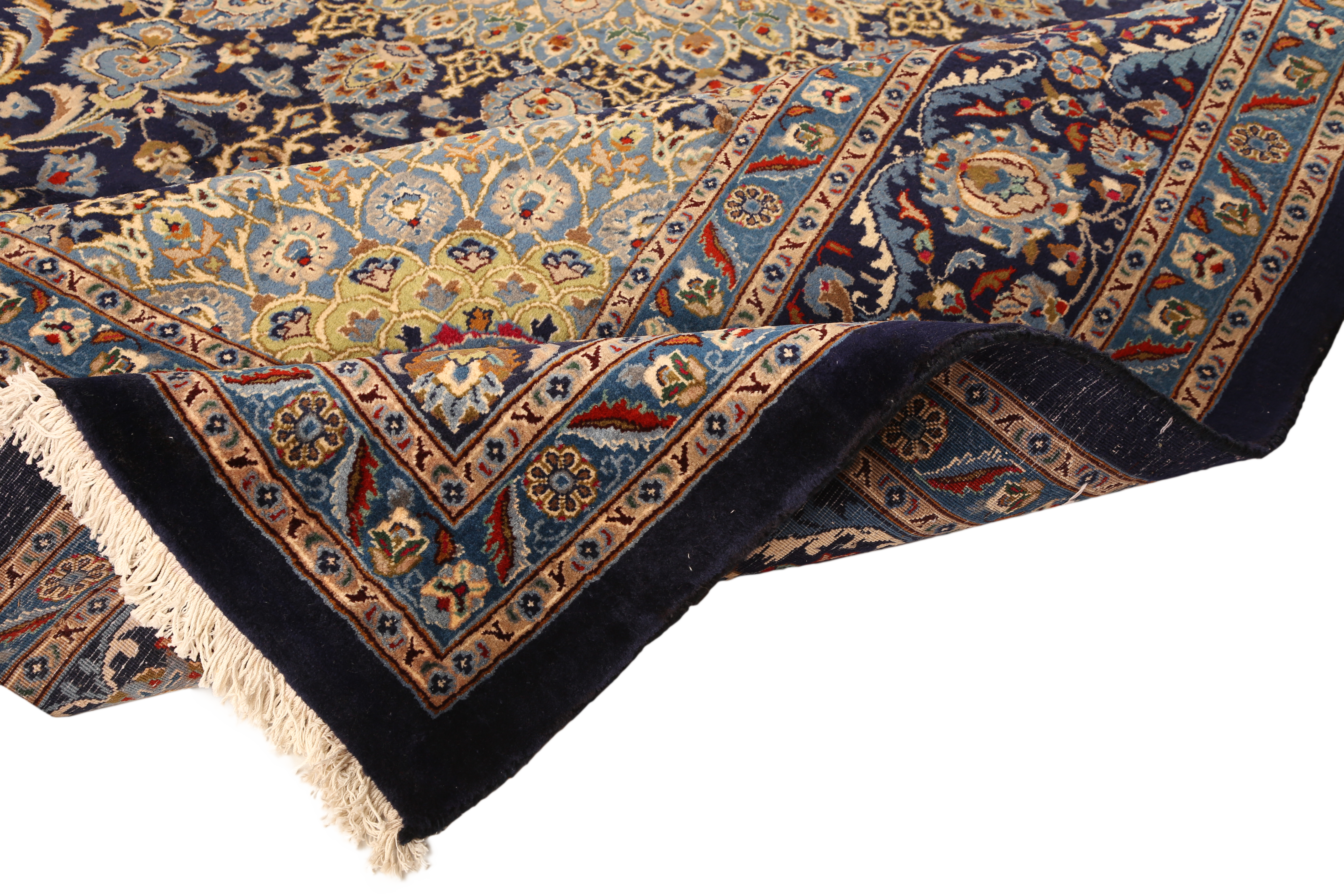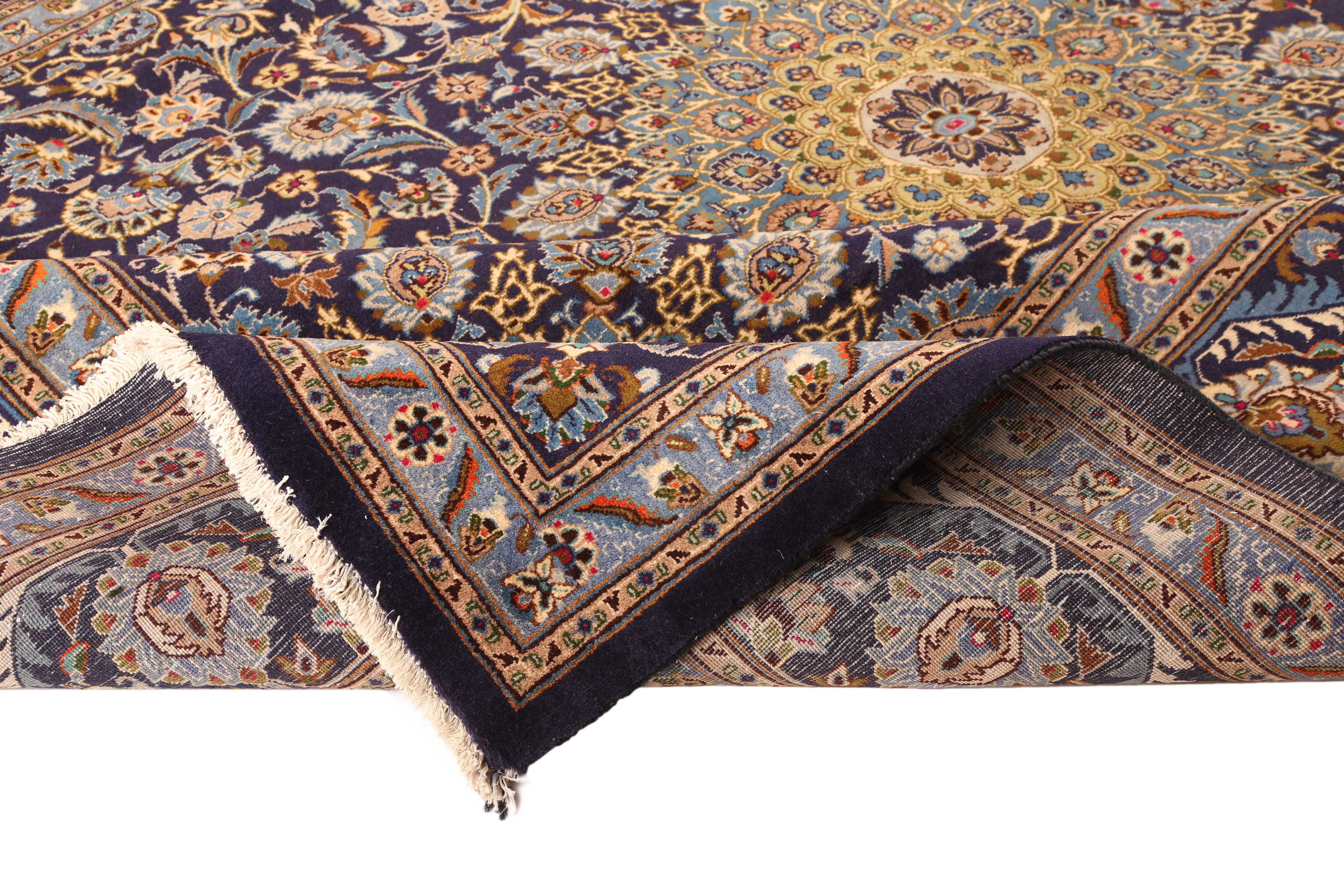 The central toranj medallion commands attention with its intricate geometry, surrounded by corner cartouches that echo the same design vocabulary in smaller scale. Each palmette and rosette has been hand-knotted with meticulous care, using asymmetrical Persian knots that create the characteristic density and durability these rugs are celebrated for. The navy blue field provides a dramatic backdrop that allows the lighter colors to emerge like stars against a midnight sky, while the antique gold borders frame the composition with regal authority.