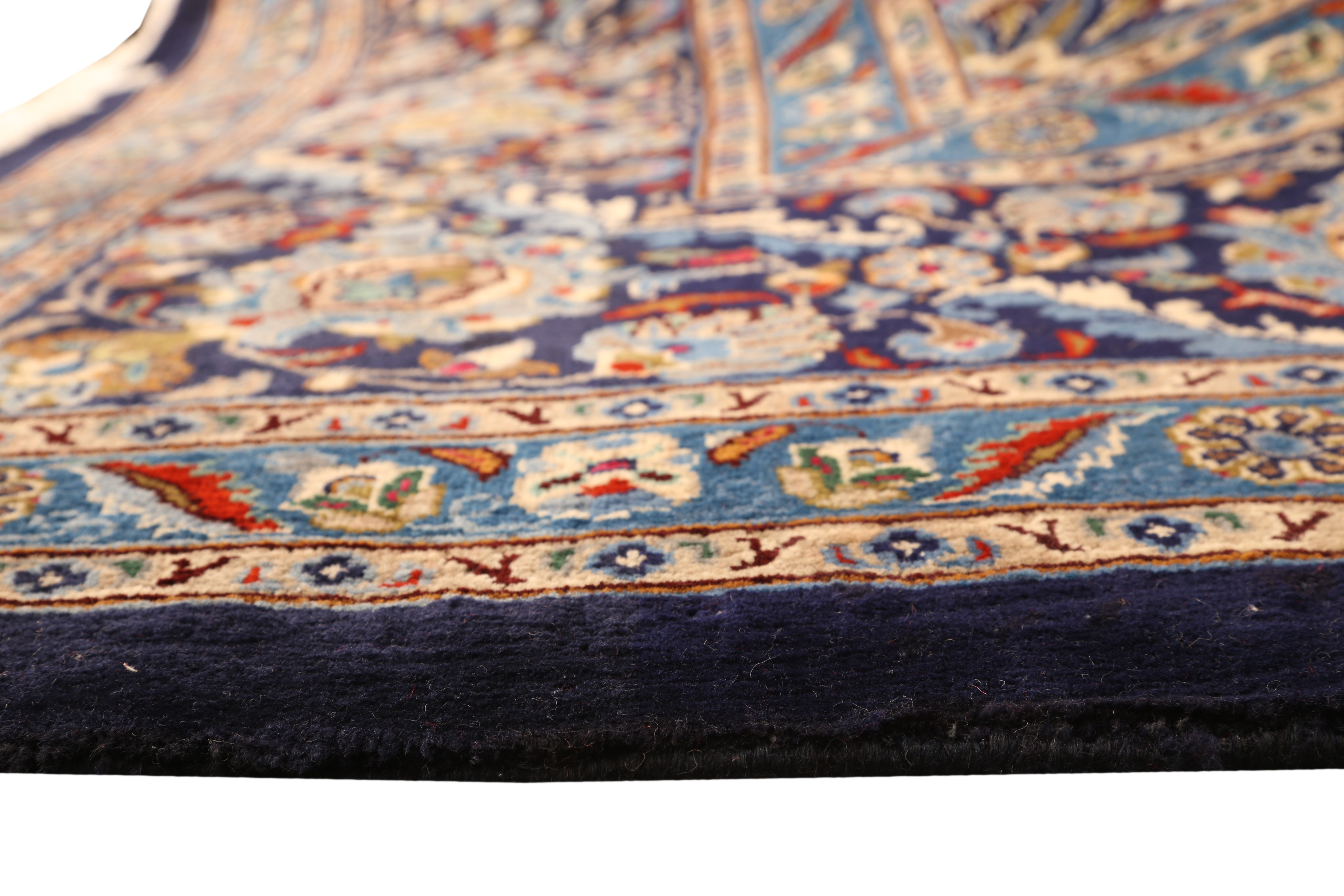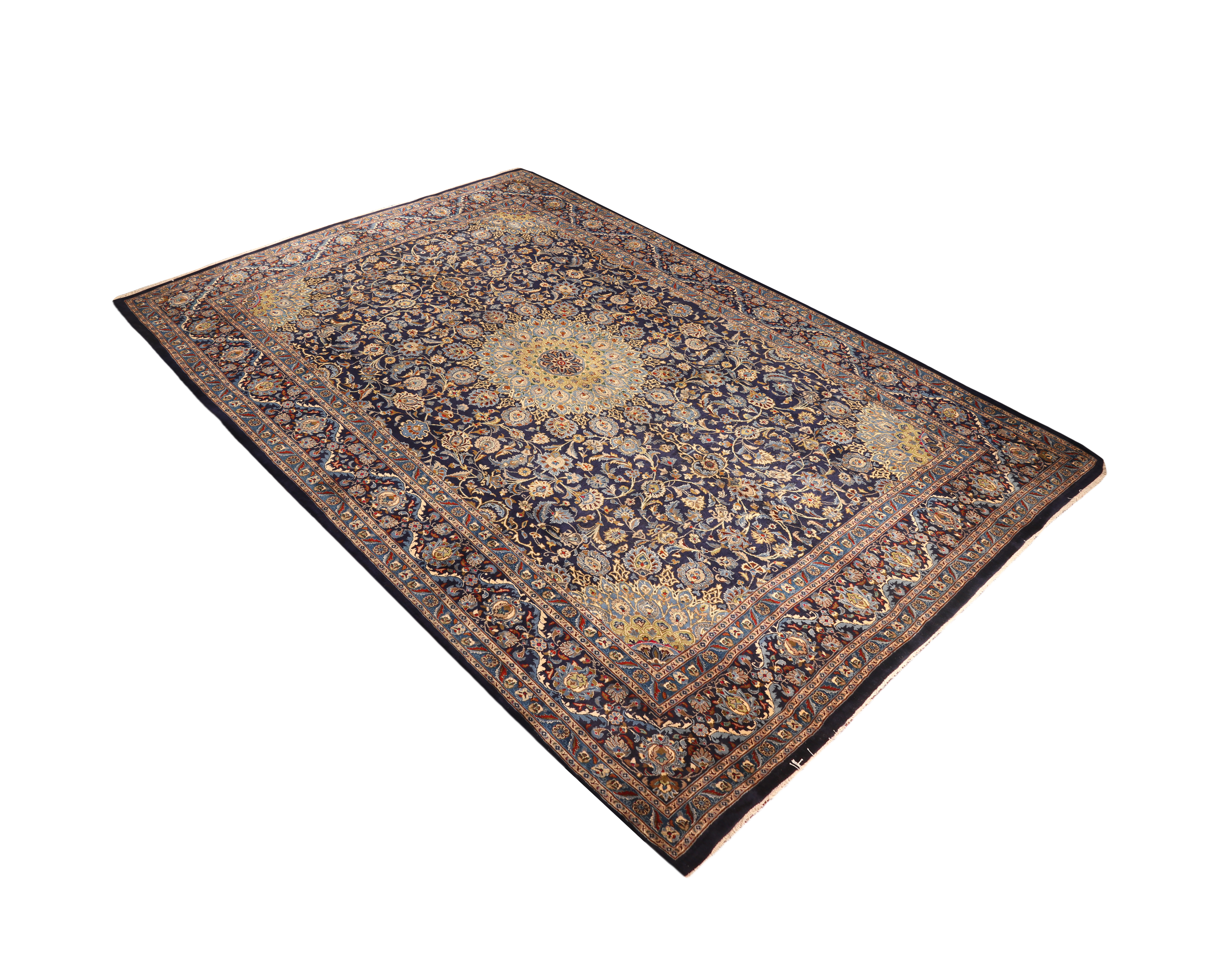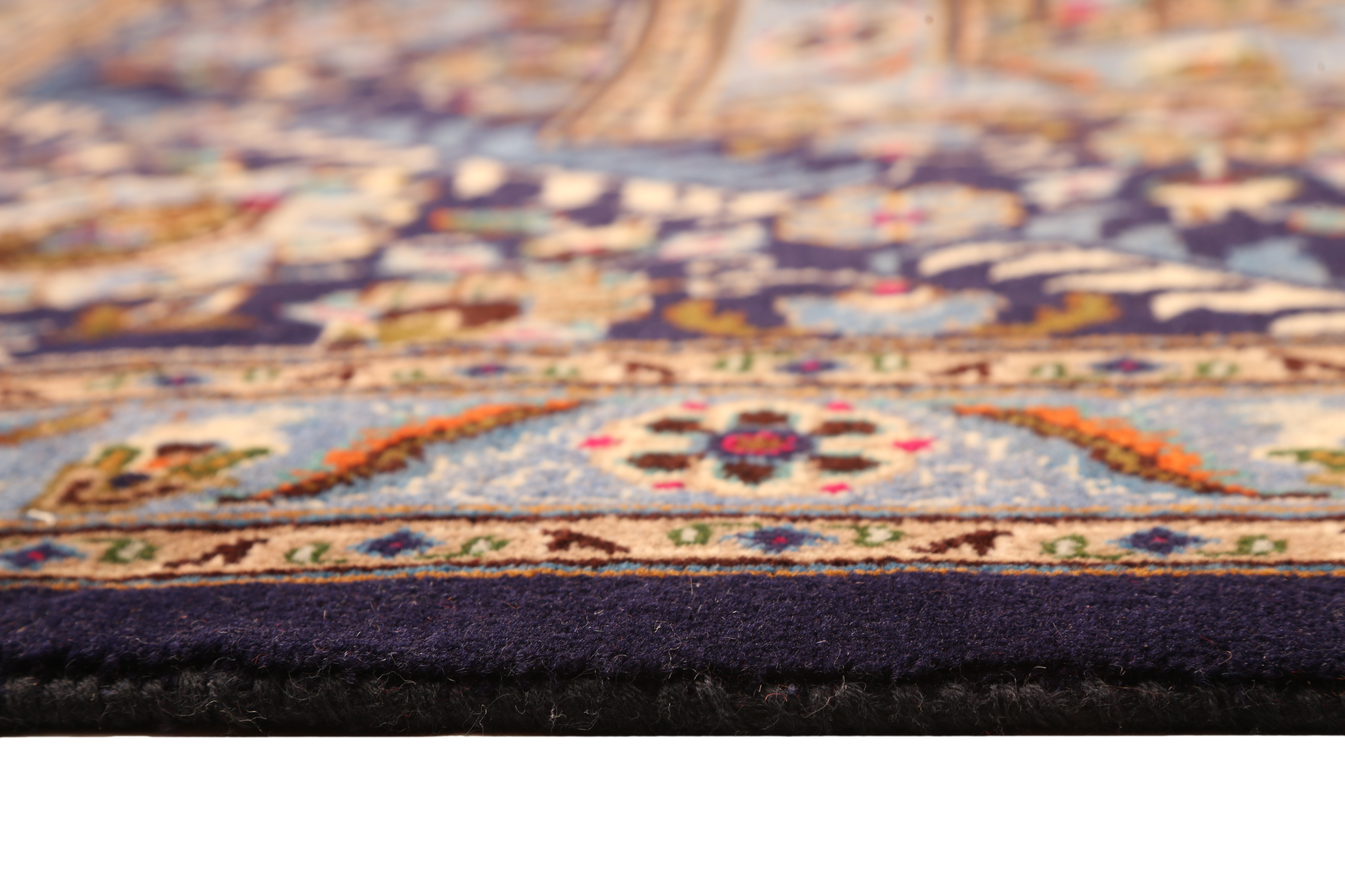 The central toranj medallion commands attention with its intricate geometry, surrounded by corner cartouches that echo the same design vocabulary in smaller scale. Each palmette and rosette has been hand-knotted with meticulous care, using asymmetrical Persian knots that create the characteristic density and durability these rugs are celebrated for. The navy blue field provides a dramatic backdrop that allows the lighter colors to emerge like stars against a midnight sky, while the antique gold borders frame the composition with regal authority.