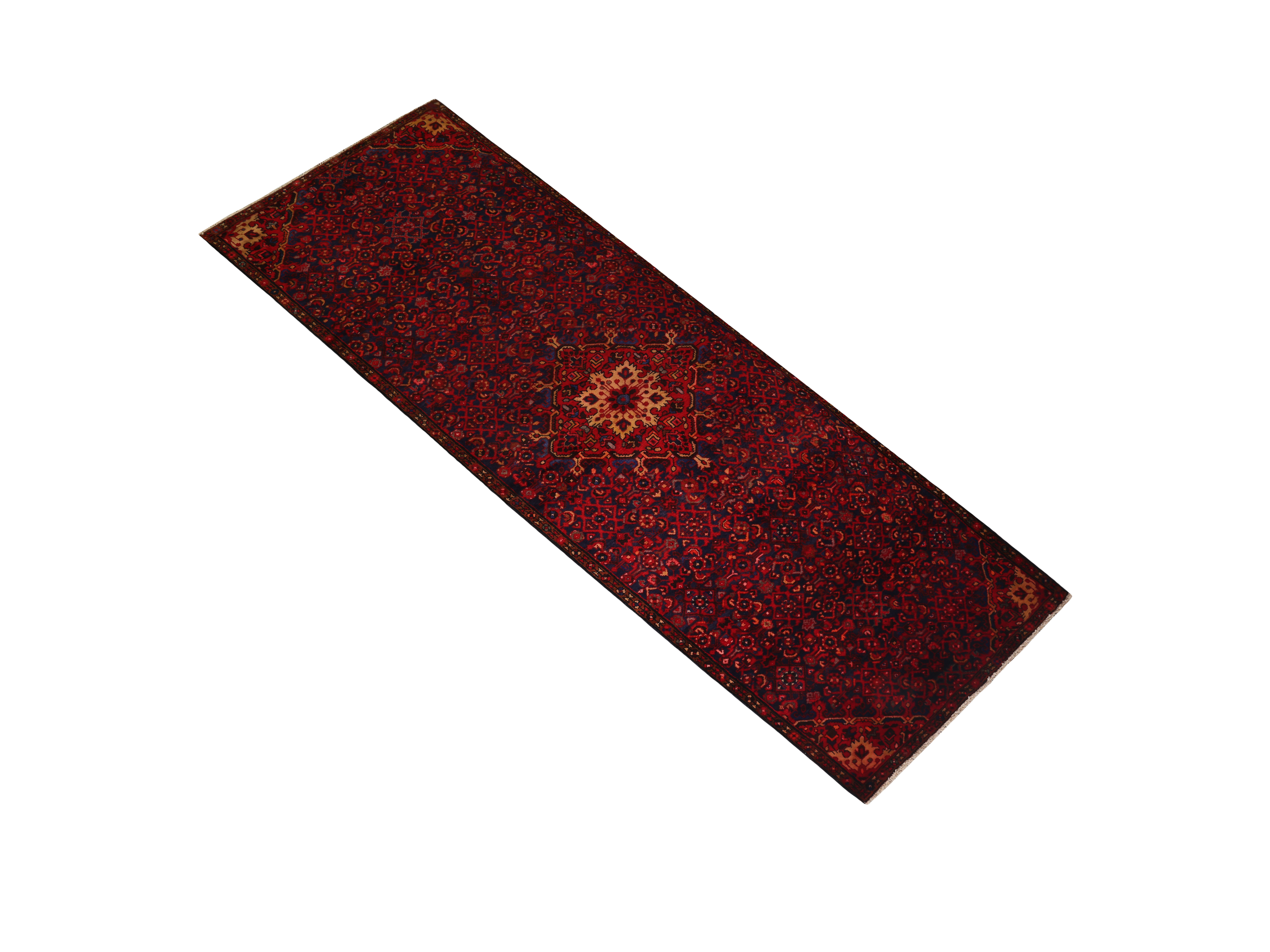 This Semi Antique Hamadan rug, measuring 12x3 ft, presents a distinguished Herati composition in Red, Blue - hallmark characteristics of the Hamadan weaving tradition at its finest. Village weavers across the Hamadan region work