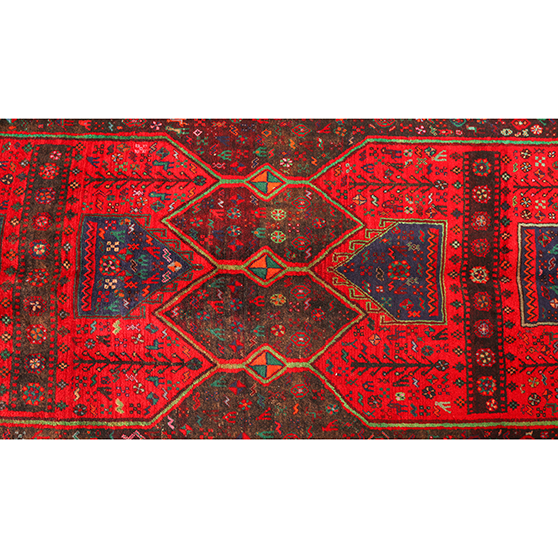 With its Medallion design in Red, Blue and its generous 12x4 ft format, this Semi Antique Kurdish rug represents the authentic weaving heritage of Kurdistan, Kermanshah, Khorasan, Mazandaran, where rugs of this quality have been