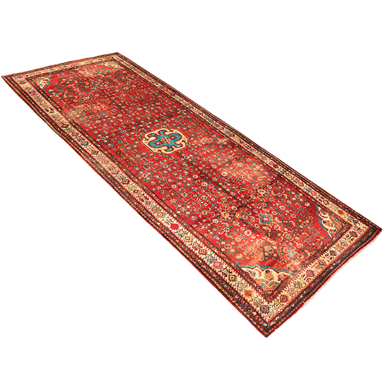 This hand-knotted Semi Antique Hamadan rug from Hamadan - 12x5 ft - presents a compelling Herati composition woven in Red, Blue, a living record of one of Persia's great regional weaving traditions. The extraordinary variety