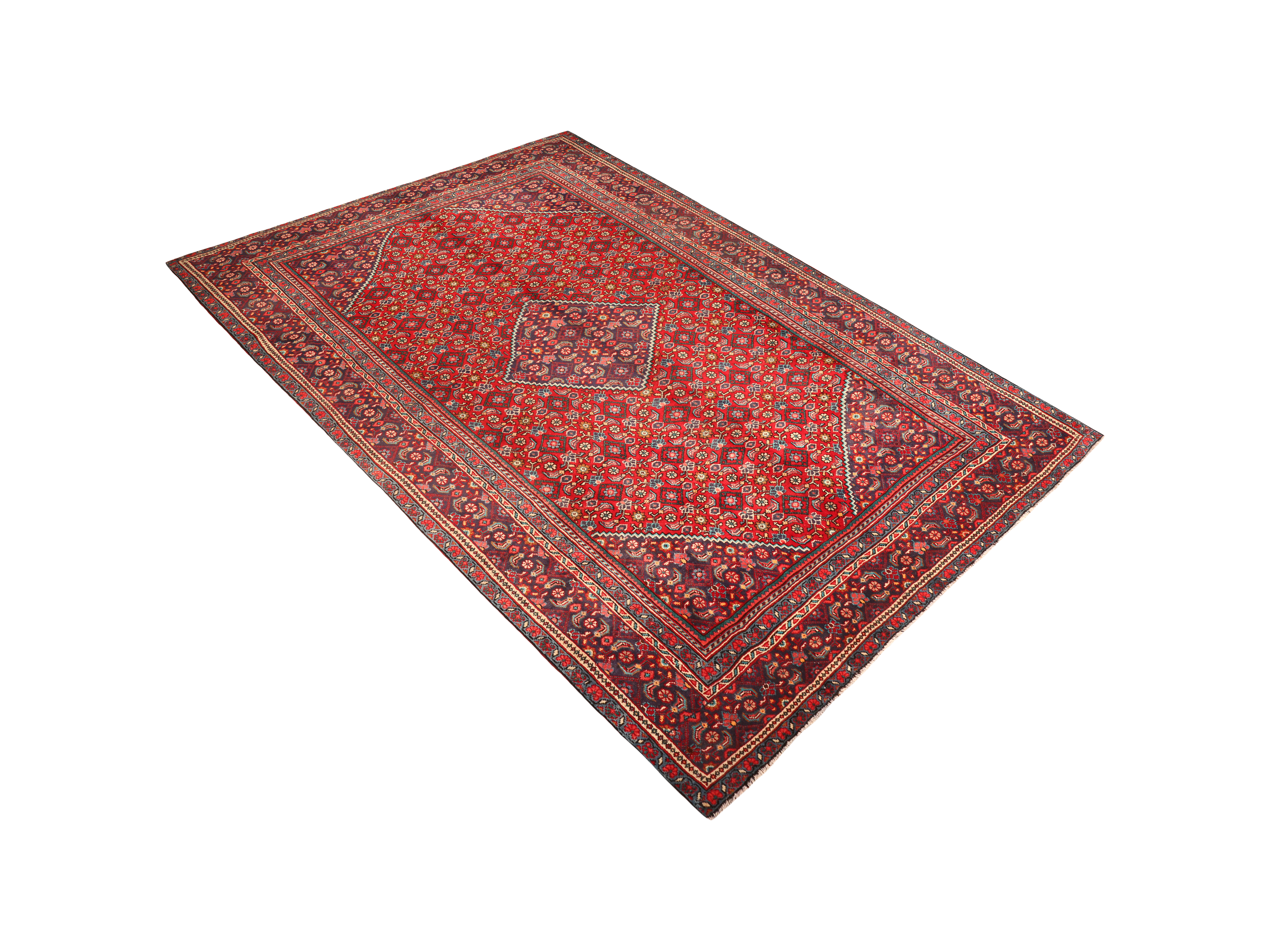 The Mahal weaving region in central Persia has been renowned since the 19th century for producing rugs of exceptional quality and distinctive character, with local artisans developing their own interpretation of classical Persian designs. This particular rug features the beloved Toranj (medallion) motif at its center, surrounded by intricate Herati patterns known as "Mahi" (fish) that create a mesmerizing geometric dance across the field. The burgundy and navy blue accents beautifully complement the dominant madder red ground, while touches of ivory, pink, and brown add depth and sophistication to the overall composition.