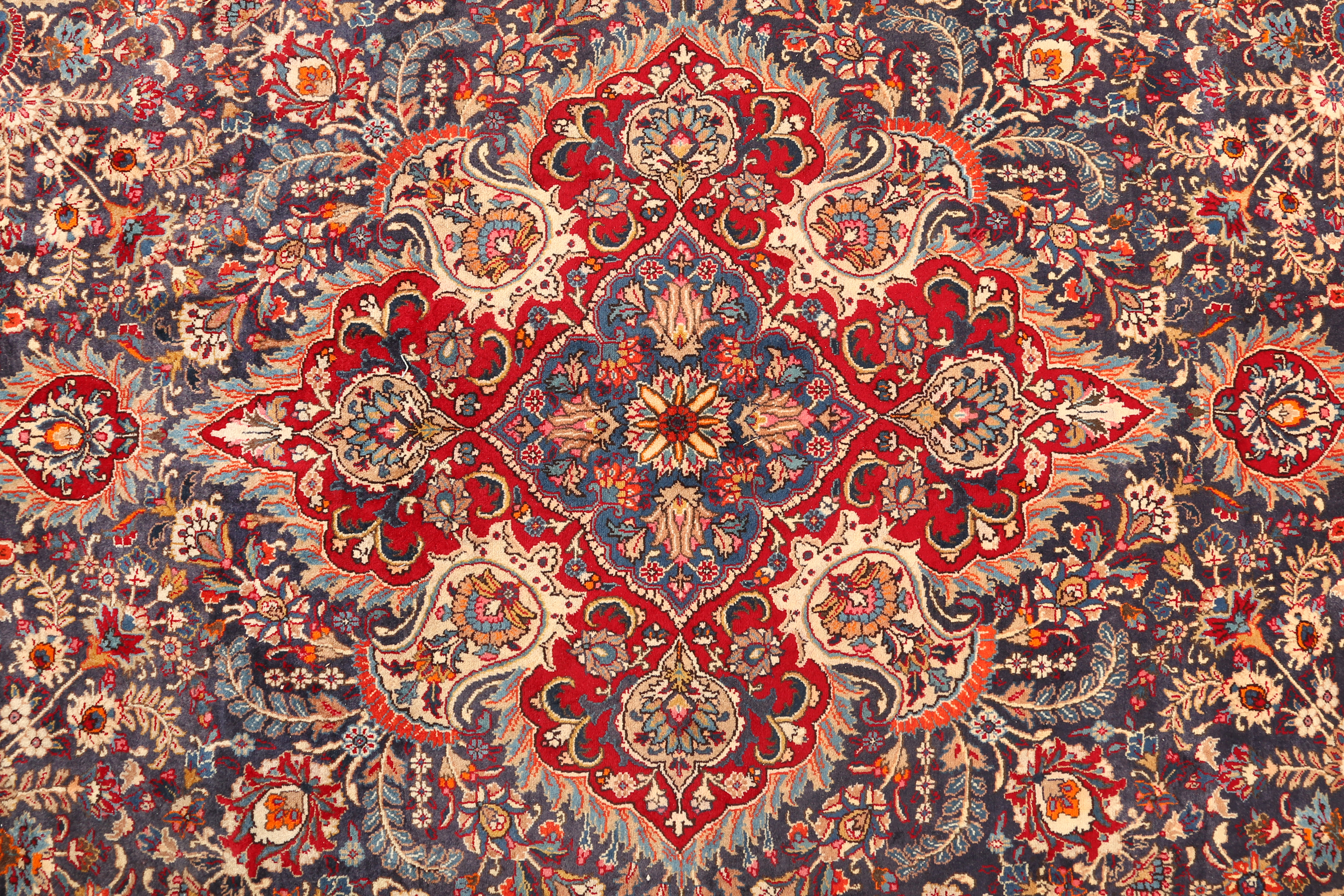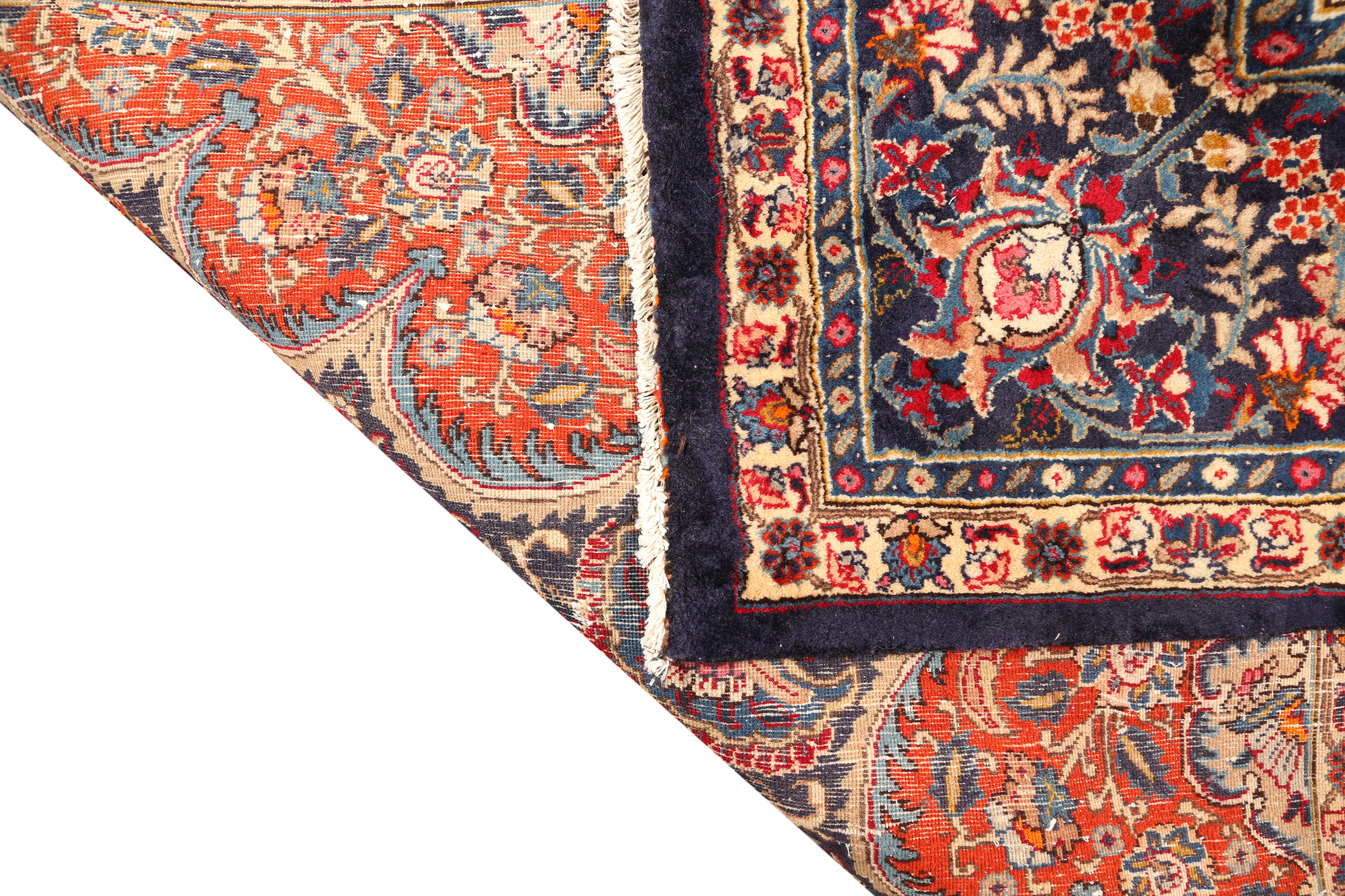 This magnificent semi antique Kashmar Persian rug measuring 12'12" x 9'8" presents a captivating symphony of navy blue, madder red, and ivory tones that dance across its meticulously hand-knotted surface. The central medallion design, known as Toranj, commands attention with its intricate Shah Abbasi palmettes and flowing Eslimi arabesque motifs, while rich accents of gold, forest green, rust red, terracotta, brown, burgundy, and ochre create depth and visual intrigue throughout the composition.