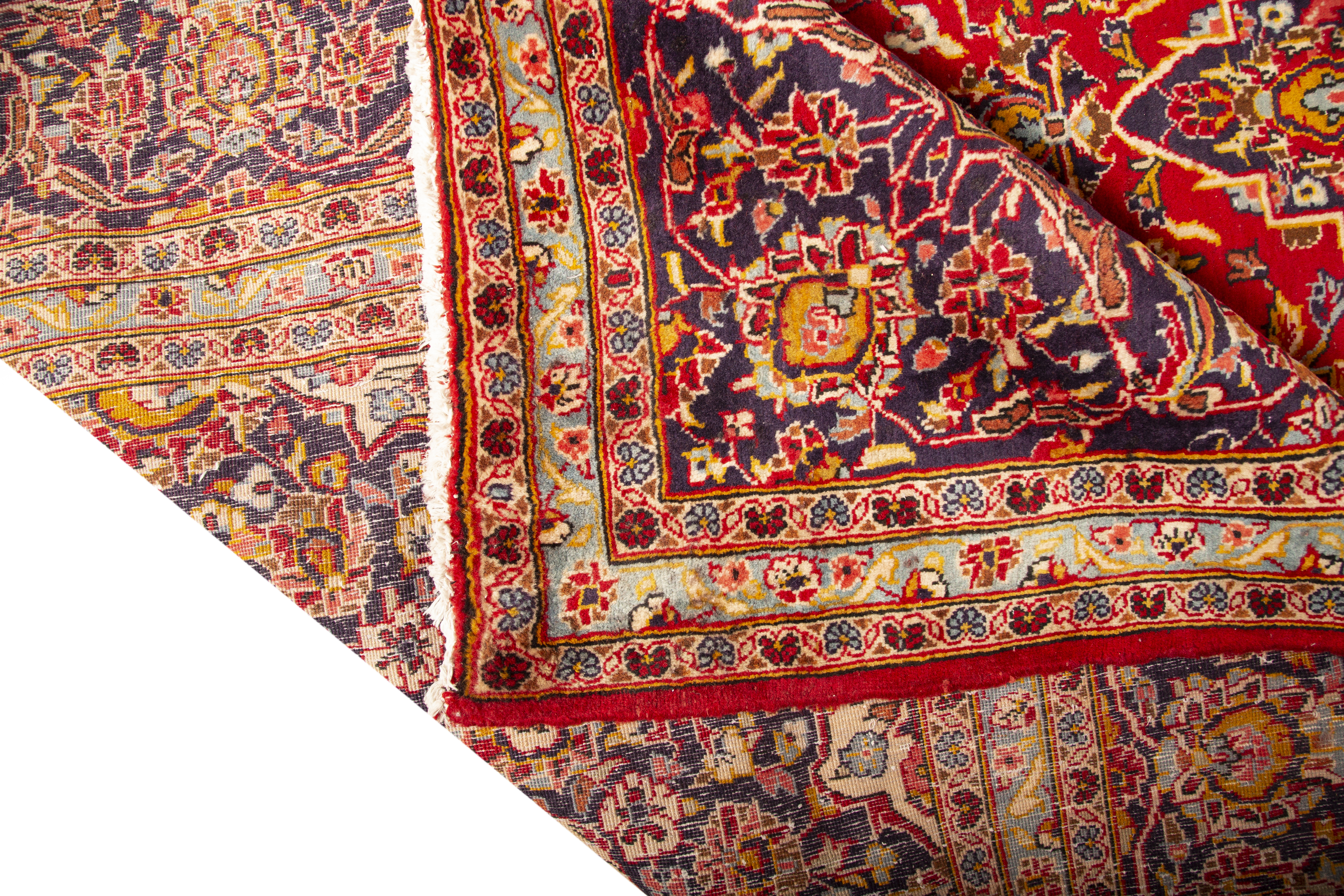 This Semi Antique Kashan rug, measuring 12x8 ft, presents a distinguished Medallion composition in Crimson, Navy Blue - hallmark characteristics of the Isfahan weaving tradition at its finest. The color palette of classical Kashan production is restrained, elegant, and deeply authoritative. Deep madder reds of exceptional quality achieve a richness and depth of tone unmatched in the Persian weaving world. These are paired with indigo navies of corresponding richness, warm ivory grounds, and accents of forest green and soft gold. Colors produced with natural dyes develop further depth, warmth, and luminosity with each decade of aging - the hallmark of great natural dye practice.