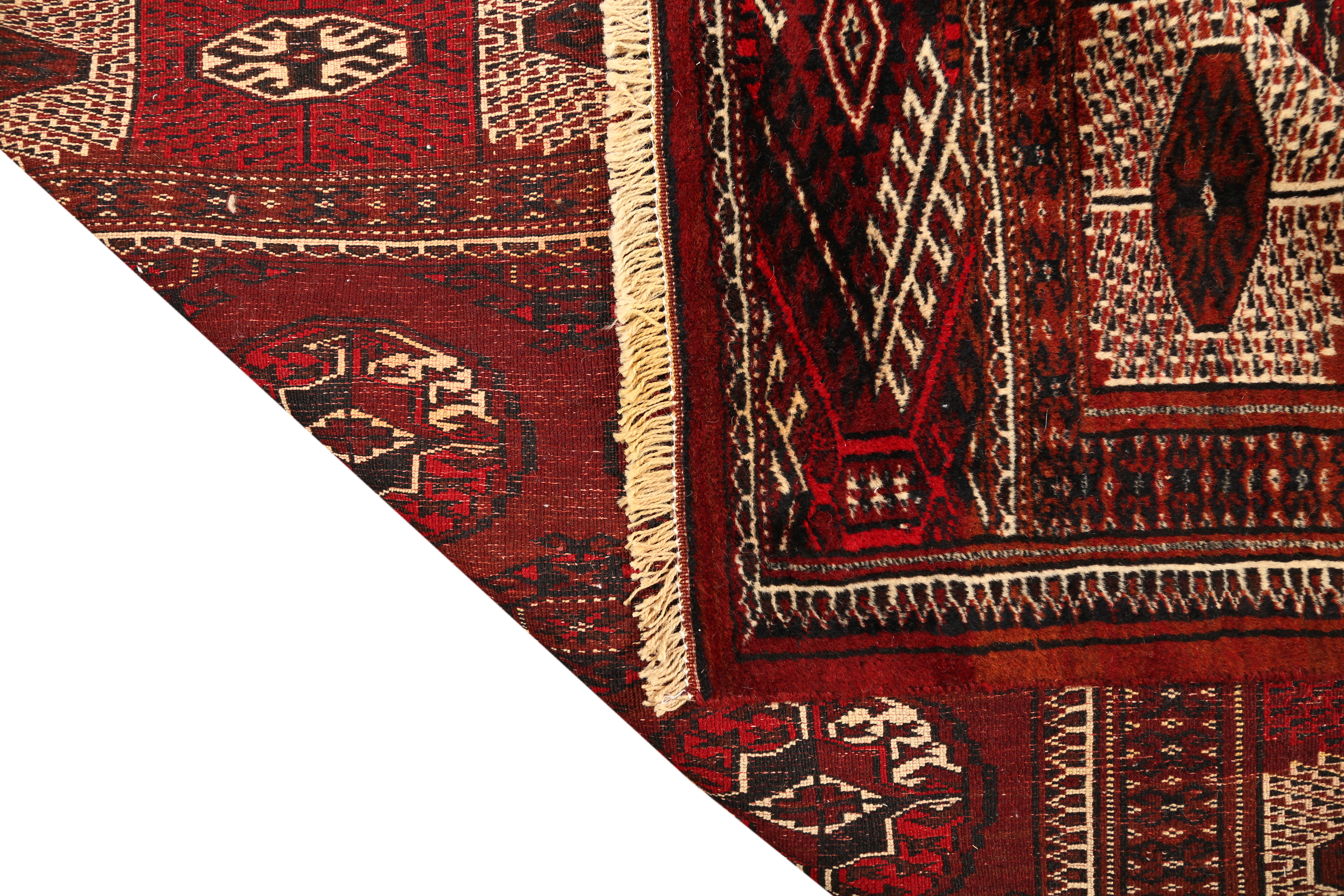 The construction of Turkmen rugs is unique in the Persian weaving world: woven entirely in wool - pile, warp, and weft - using the Persian asymmetrical knot at high densities on portable horizontal looms, these rugs achieve a