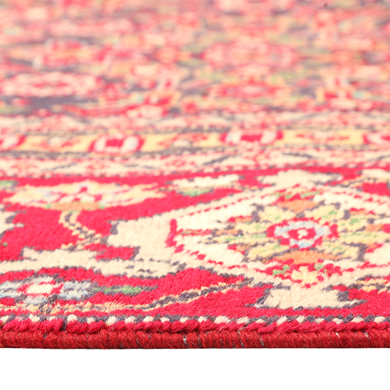 This Tabriz rug was woven using the symmetrical Turkish knot, also known as the Ghiordes knot. In this technique, the pile yarn is looped symmetrically around two adjacent warp threads, producing a more robust and raised pile than the asymmetrical Persian knot. This knotting technique is characteristic of some Kurdish, Caucasian, and tribal Persian weaving traditions.