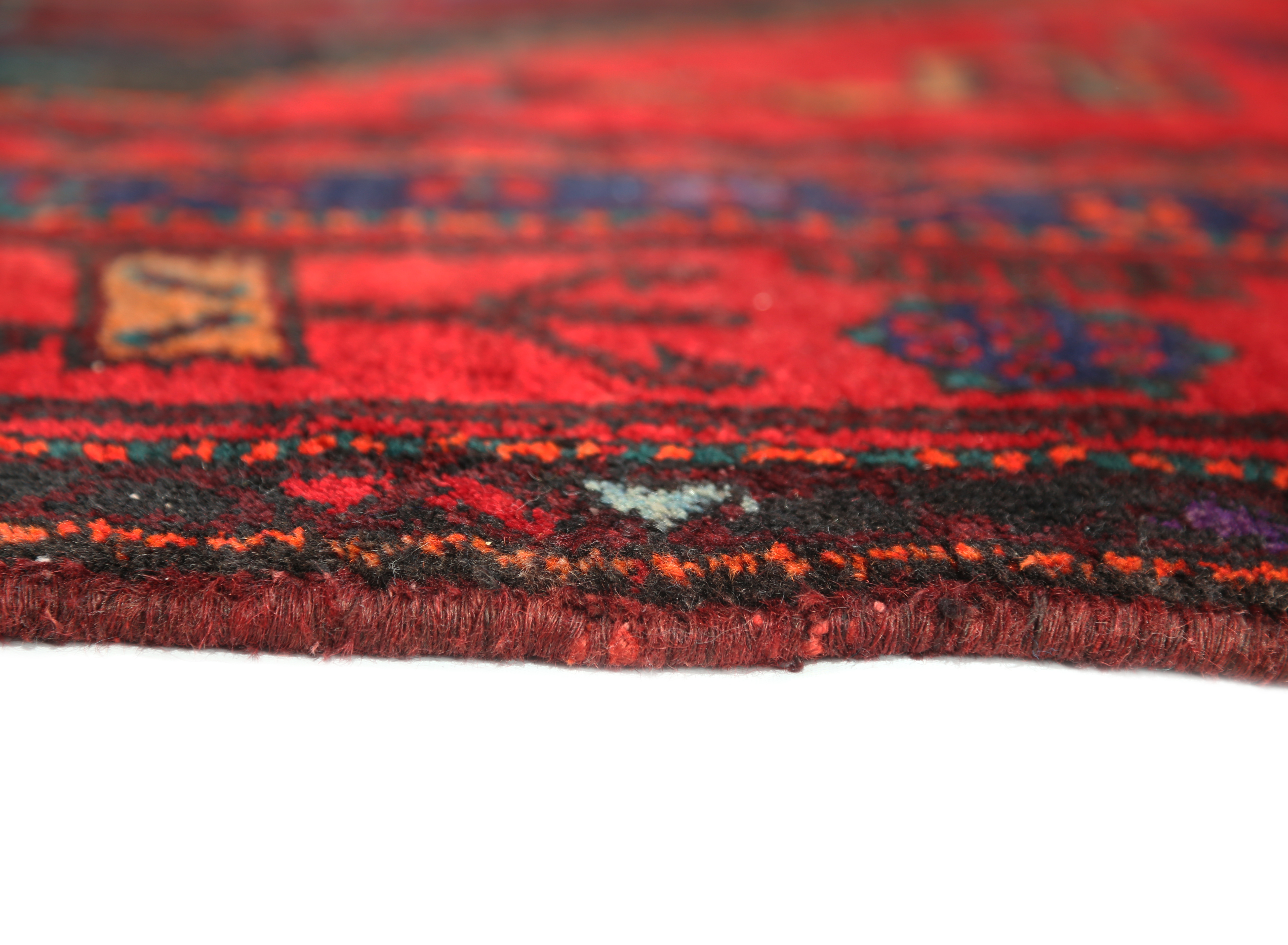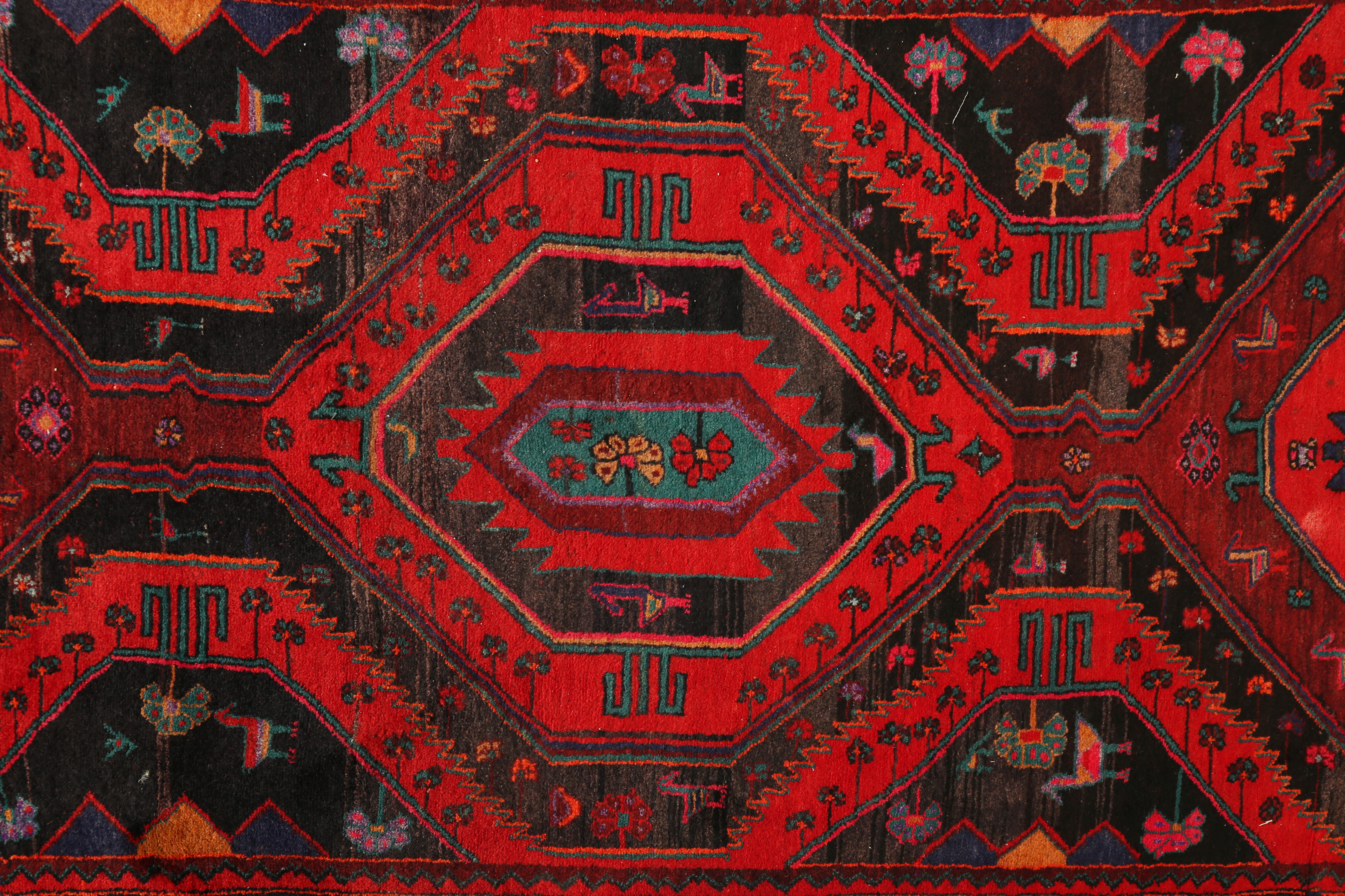This magnificent semi antique Hamadan Persian rug measuring 12'4" x 4'11" presents a stunning display of geometric artistry woven with masterful precision four decades ago. The rich madder red foundation serves as a dramatic canvas for intricate tribal motifs rendered in deep navy blue, dark red, black, cream, and warm brown, creating a sophisticated color palette that speaks to the weaver's exceptional skill. This one-of-a-kind hand-knotted masterpiece transforms any hallway or narrow living space into an elegant showcase of Persian craftsmanship.