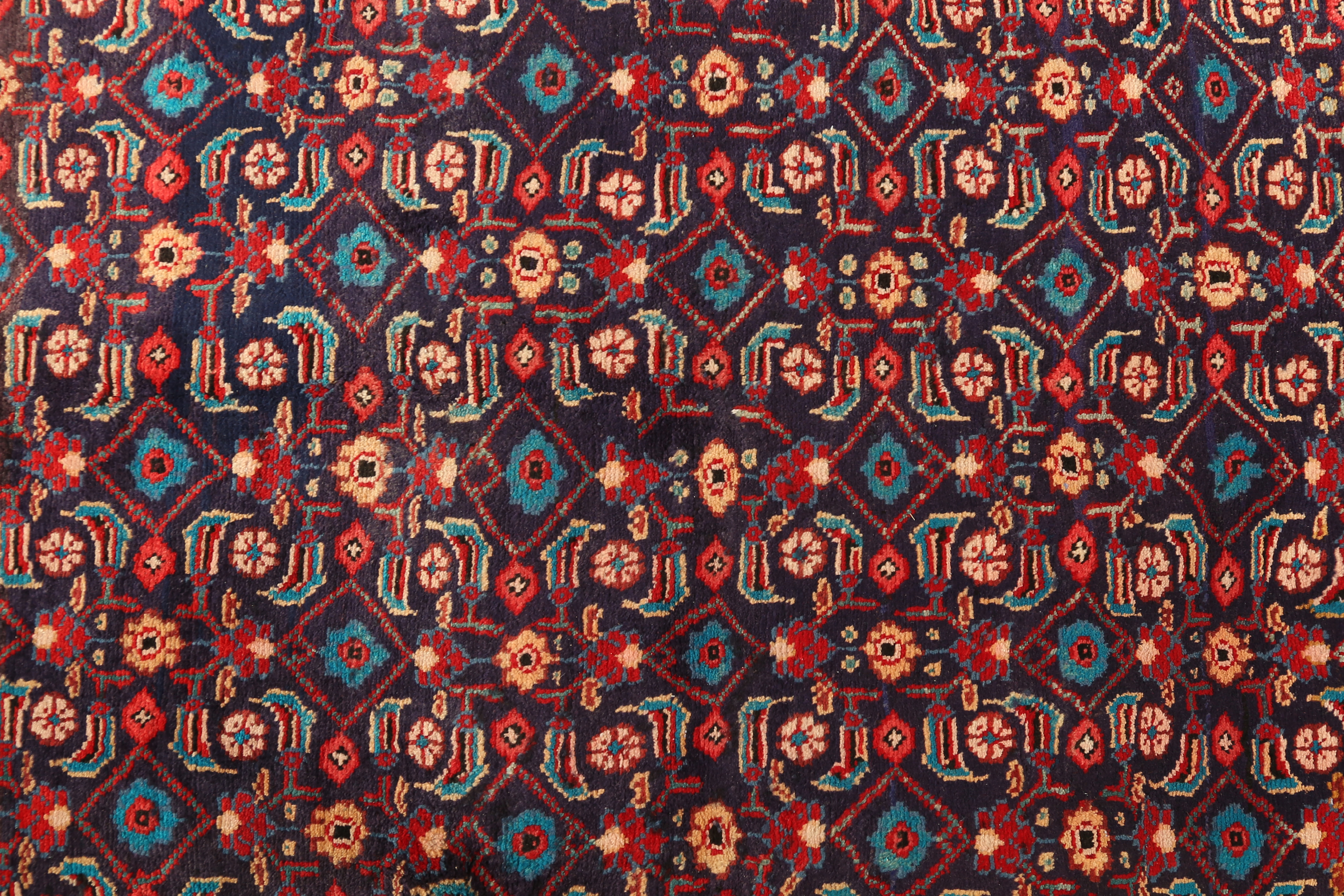 The classical Herati pattern, known locally as Mahi for its resemblance to swimming fish, creates mesmerizing movement through repeating diamond medallions surrounded by delicate rosettes and curved leaves. The deep burgundy field provides a rich foundation for the intricate navy blue and crimson geometric elements, while touches of ivory, rust red, gold, green, and ochre add luminous depth and complexity to every carefully knotted detail.