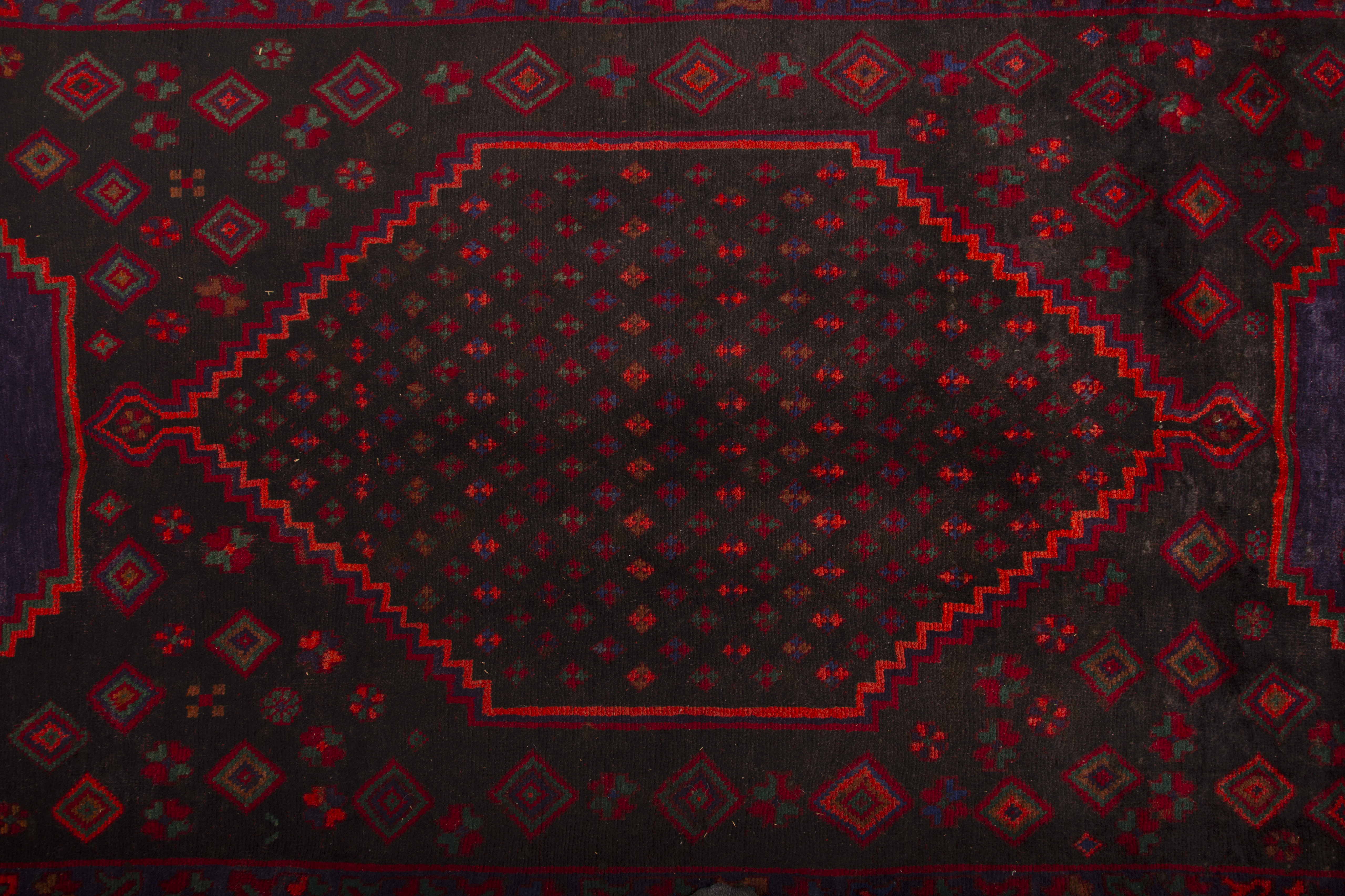 This hand-knotted Semi Antique Bijar rug from Kermanshah - 12x5 ft - presents a compelling Medallion composition woven in Crimson, Navy Blue, a living record of one of Persia's great regional weaving traditions. The Bijar