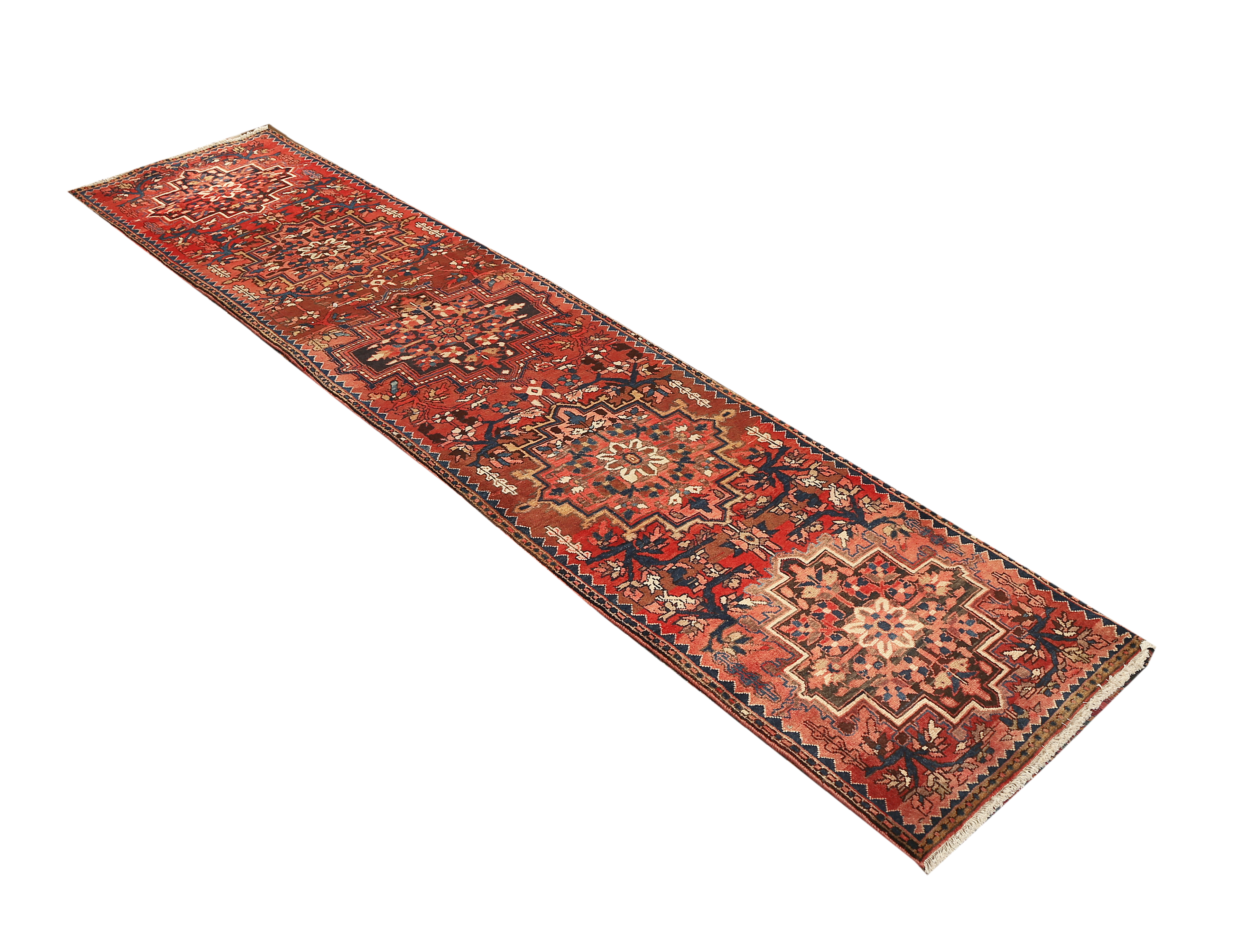 The historic region of Ardabil in northwestern Persia has been renowned for centuries as a center of exceptional rug production, where master artisans have passed down their weaving techniques through generations. This particular runner showcases the region's signature combination of geometric medallions with delicate Herati (Mahi) motifs, creating a harmonious balance between bold central elements and intricate background patterns. The semi antique age of this piece adds character and authenticity that only comes with time, as the natural wool has developed a subtle patina that enhances the overall beauty.