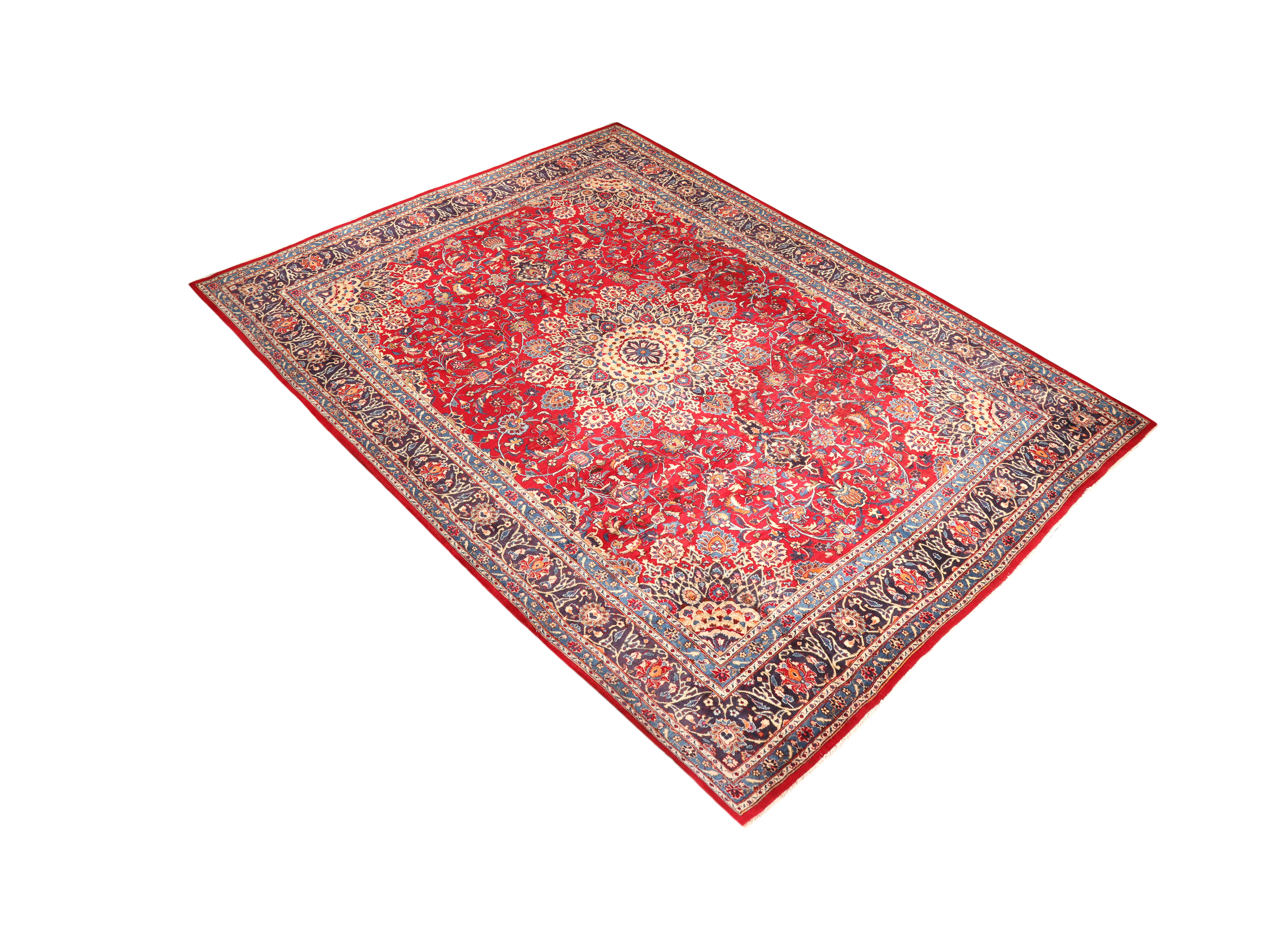 The rich crimson background creates dramatic warmth, while cream and navy blue accents provide sophisticated contrast, complemented by touches of beige, gold, brown, and white that add depth and complexity. This generous 12'8" x 9'12" foot size makes it perfect for anchoring large living rooms, formal dining areas, or spacious bedrooms, providing enough coverage to unify furniture arrangements while leaving elegant borders. Los Angeles Home of Rugs proudly presents this exceptional piece as a testament to Persian weaving excellence.
