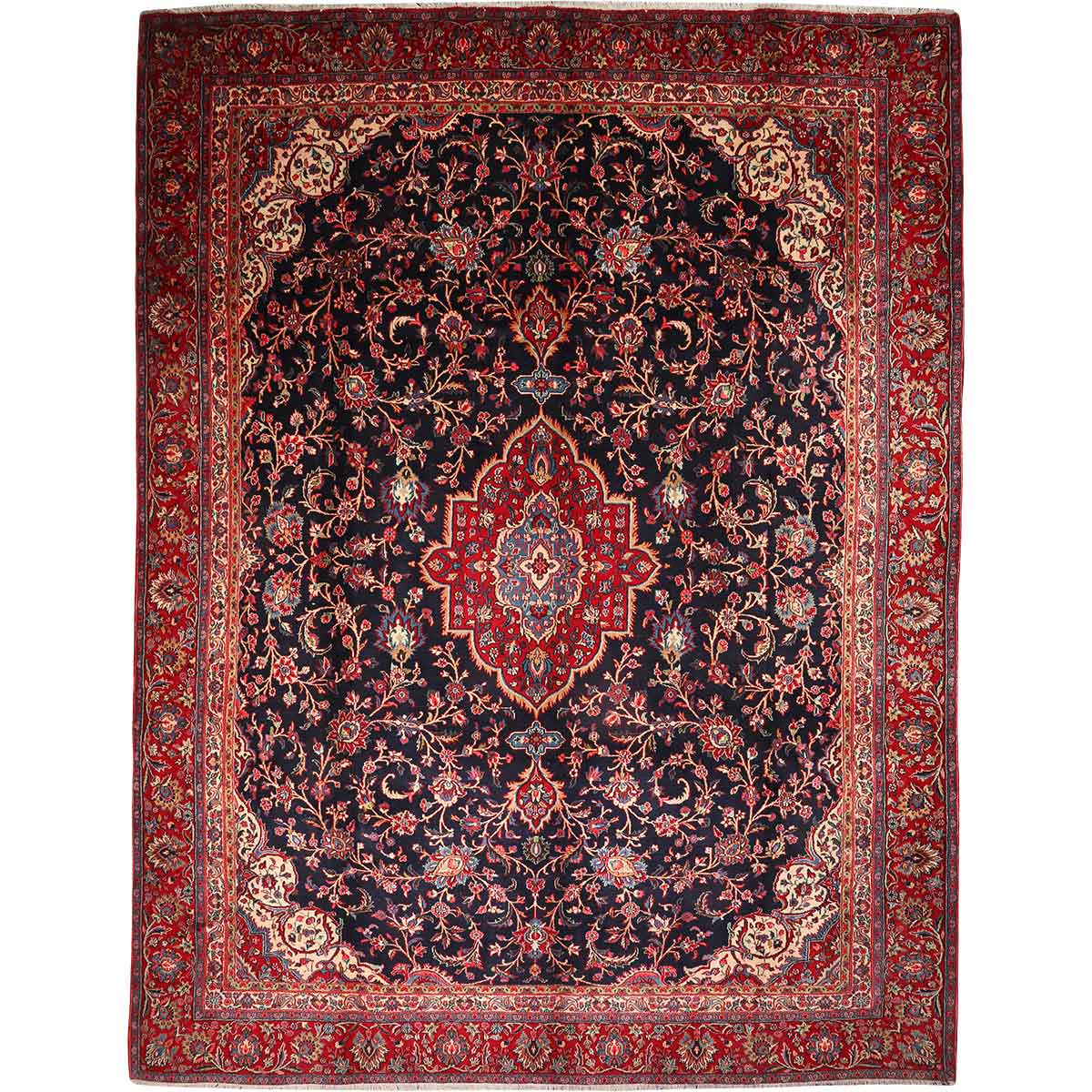 This magnificent 12'8" x 9'5" semi-antique Hamadan Persian rug showcases the extraordinary artistry of Persian weavers from four to six decades past, when traditional techniques flourished in the mountainous region of western Persia. The generous proportions make it an ideal centerpiece for formal dining rooms or spacious living areas, where its commanding presence can be fully appreciated. The rich palette of dark red, navy blue, and madder red creates a sophisticated foundation, while accents of cream, ivory, and gold add luminous depth to the overall composition.