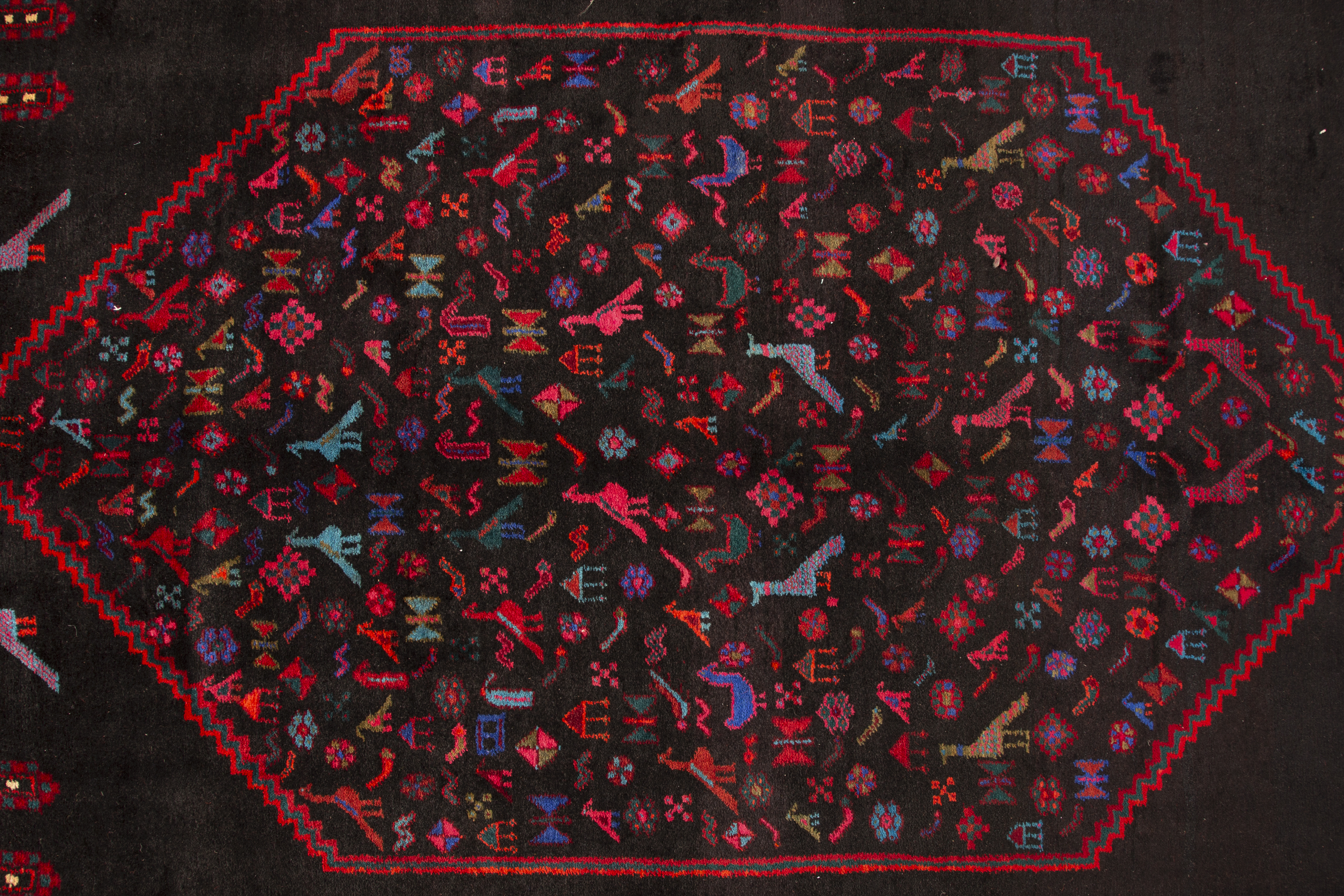 The color palette tells its own story of Persian dye mastery, where dark red represents courage and passion, navy blue symbolizes wisdom and infinity, and crimson embodies life force and vitality. The interplay of black, burgundy, and rust red creates dramatic shadows and highlights that shift throughout the day, revealing new details and nuances that have developed over forty to sixty years of careful aging, giving this semi antique piece its distinctive patina and character that cannot be replicated in modern production.