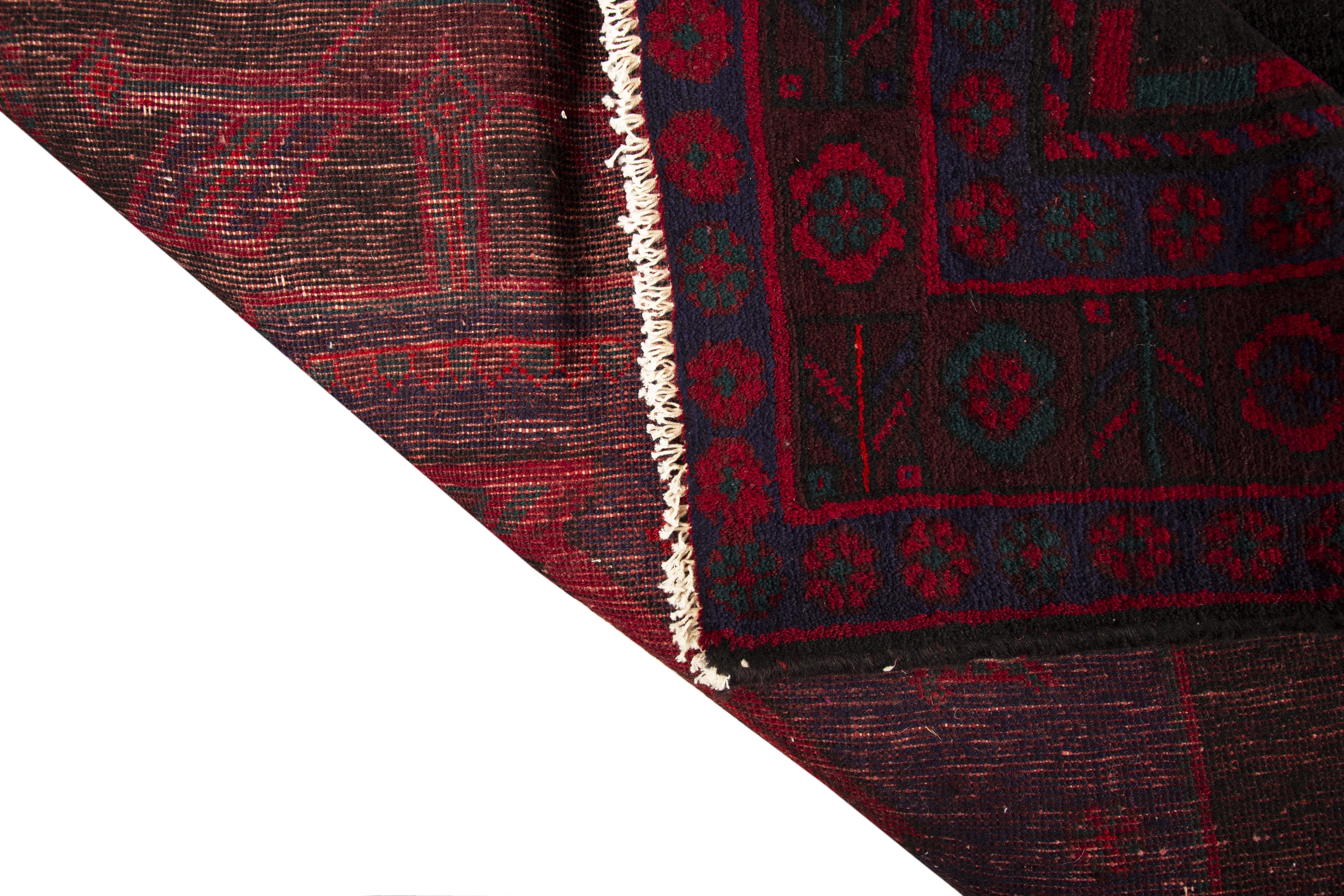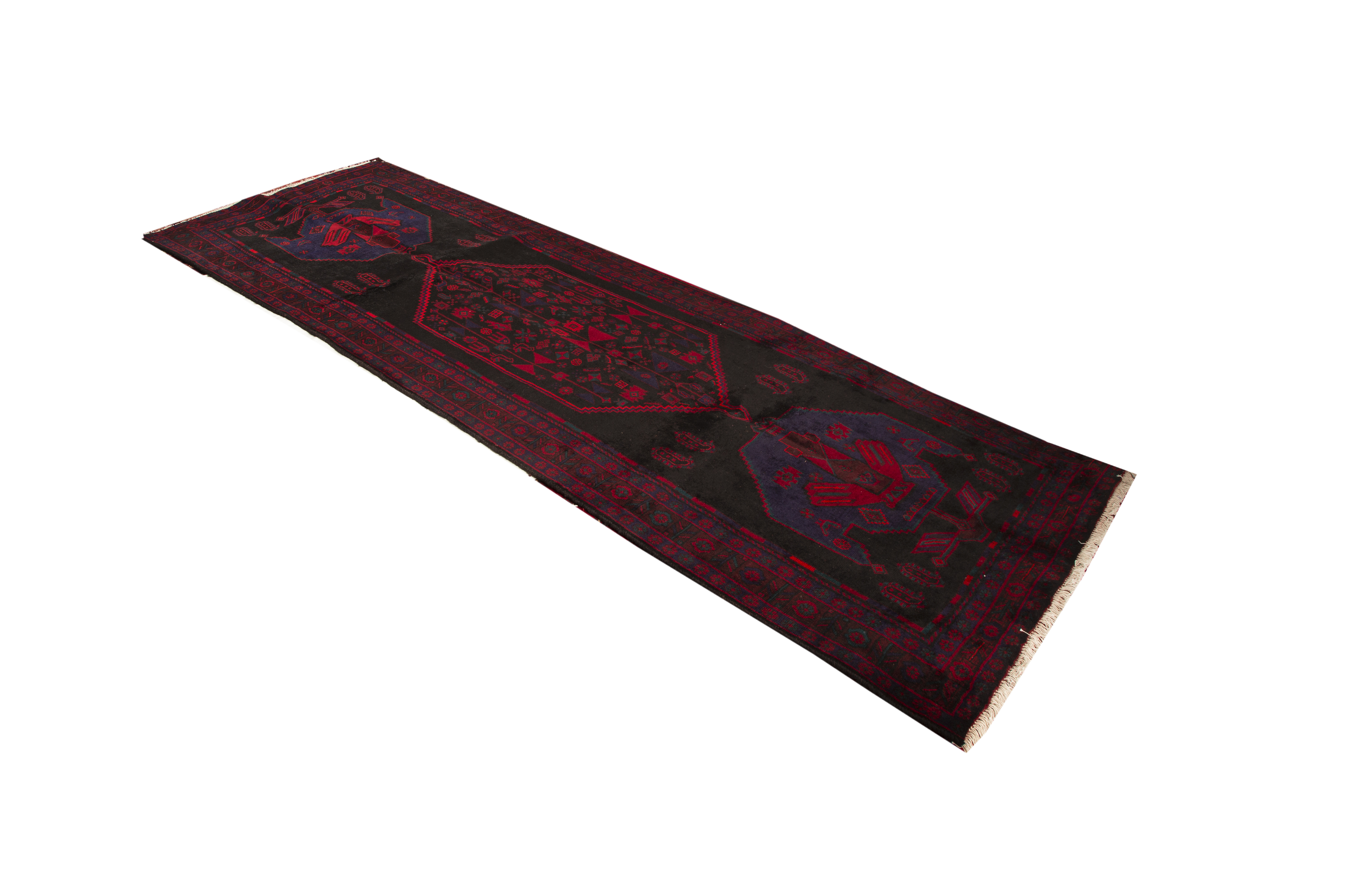 This magnificent semi-antique Bijar Persian rug, measuring 13'1" x 4'9", presents a striking medallion composition that has gained depth and character through four to six decades of careful use. The dominant dark red field creates a bold foundation, while intricate black outlines define the central toranj medallion with mathematical precision. Crimson accents dance throughout the geometric patterns, complemented by burgundy undertones and navy blue corner elements that anchor this exceptional piece with regal sophistication.