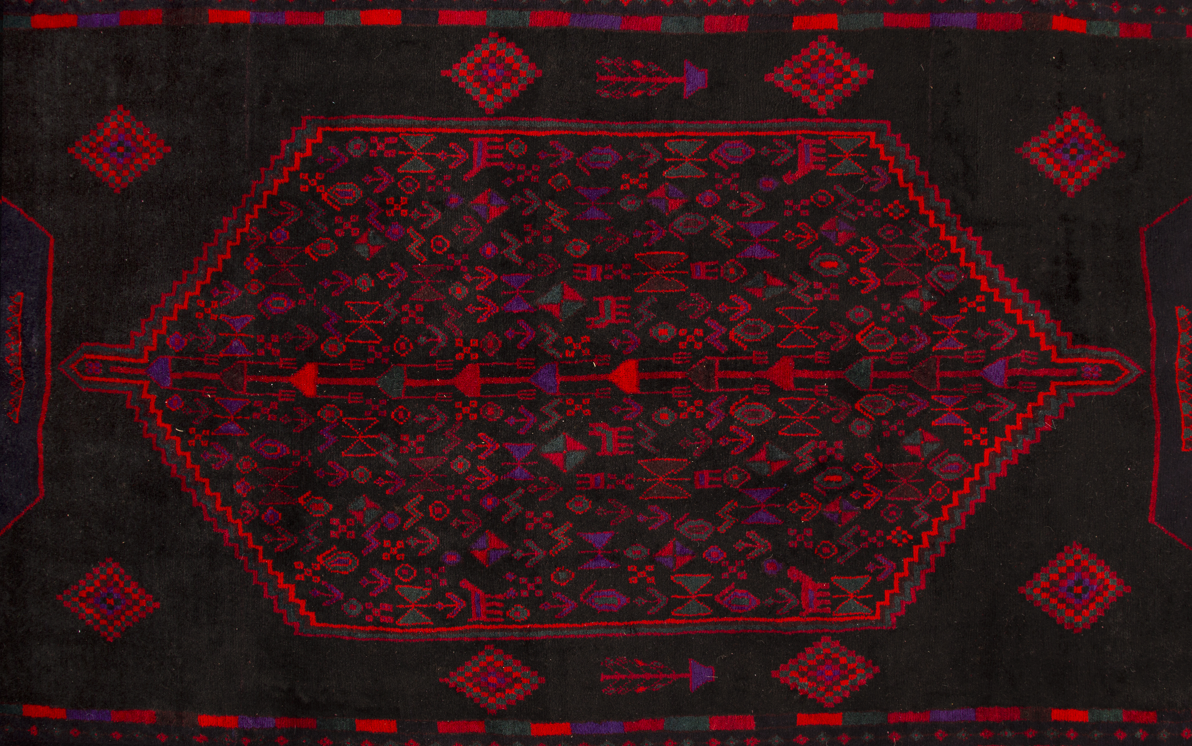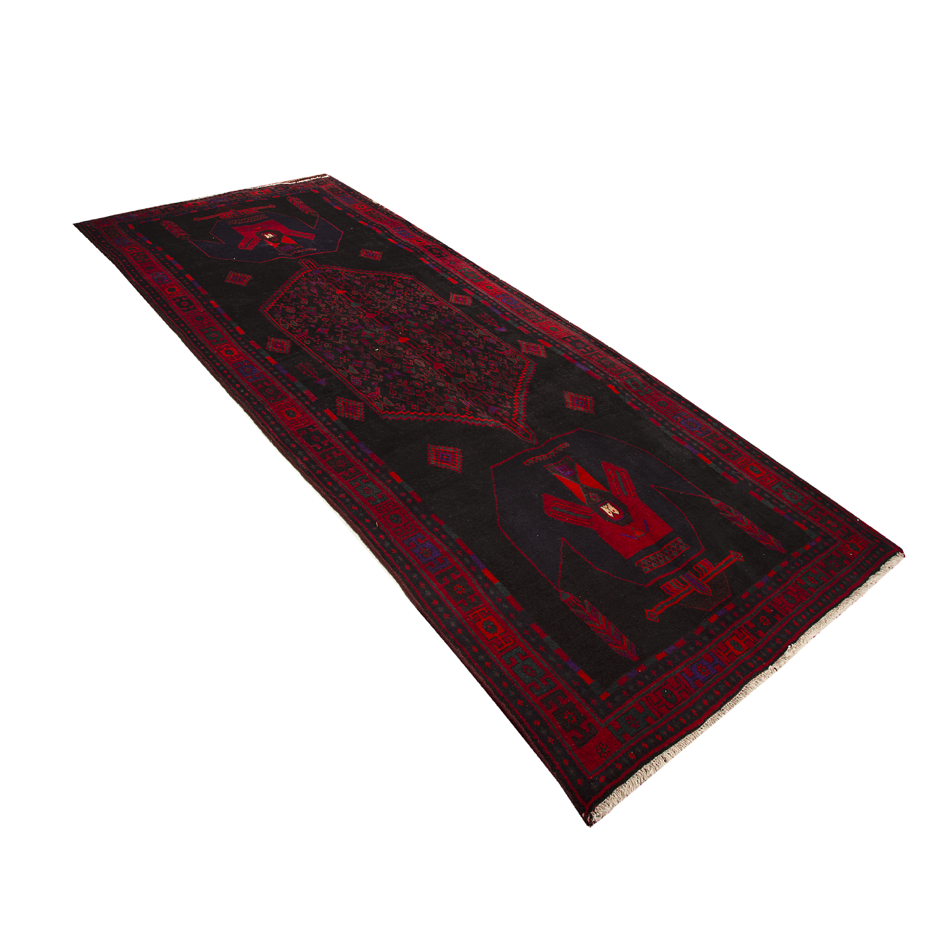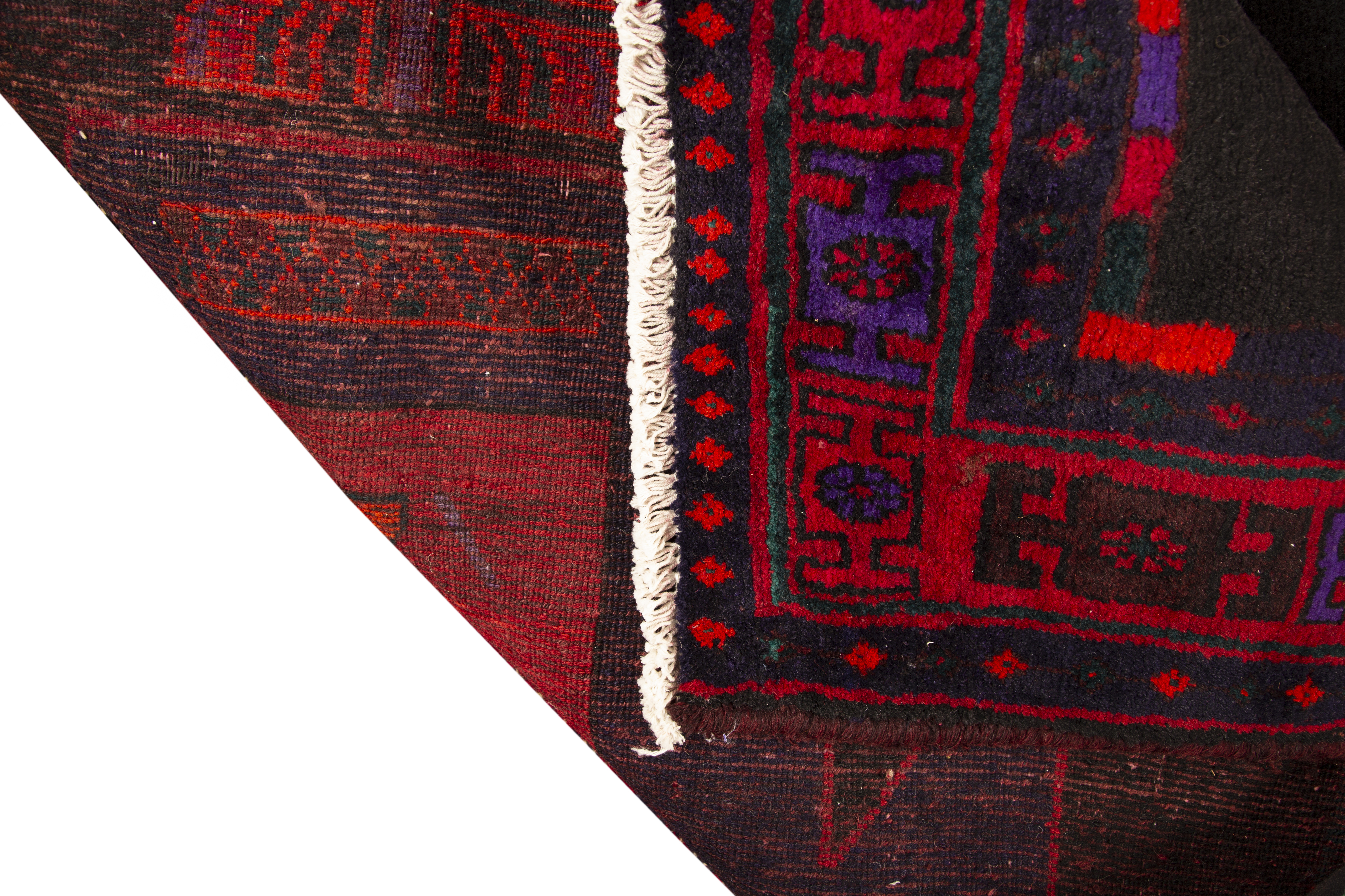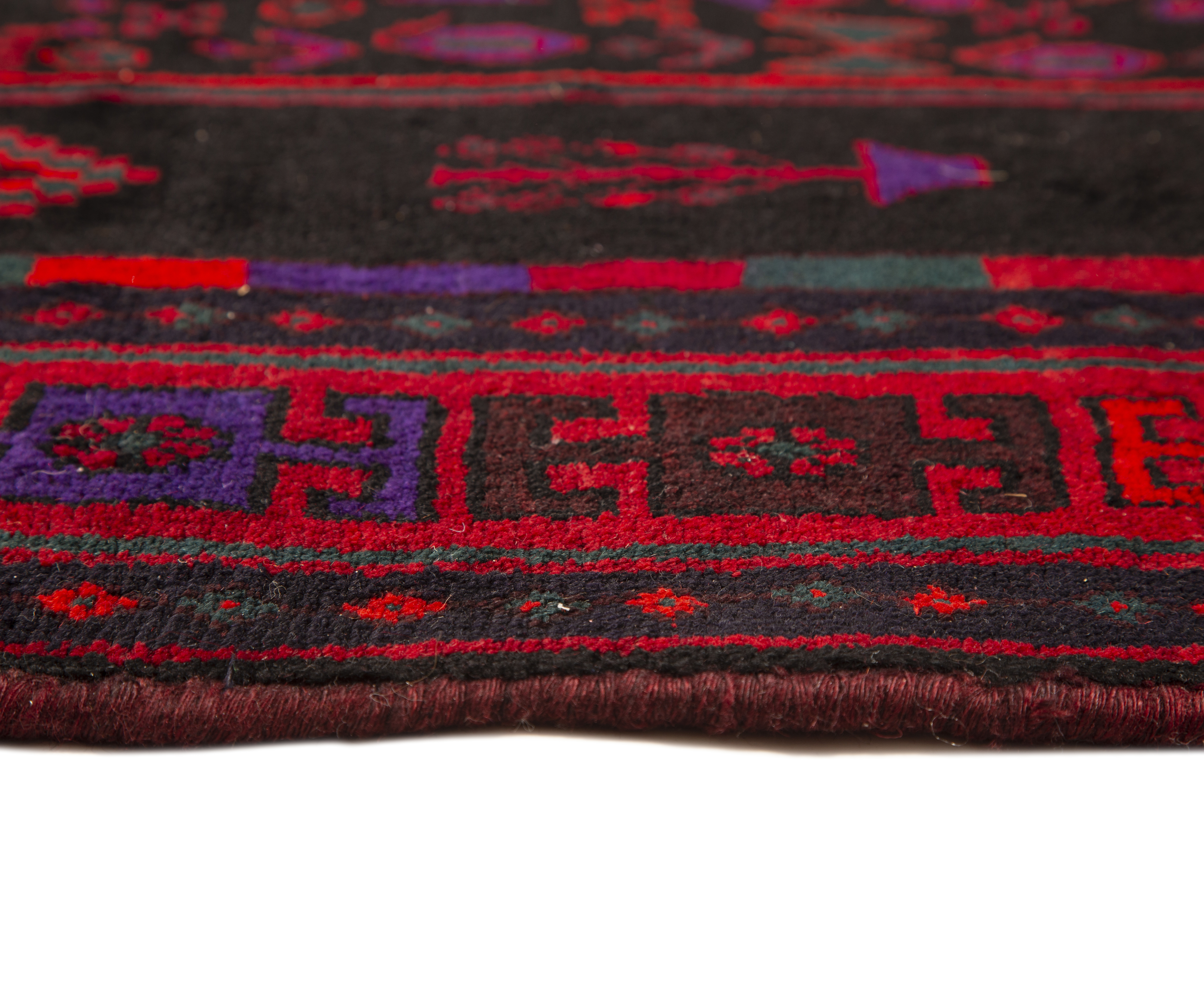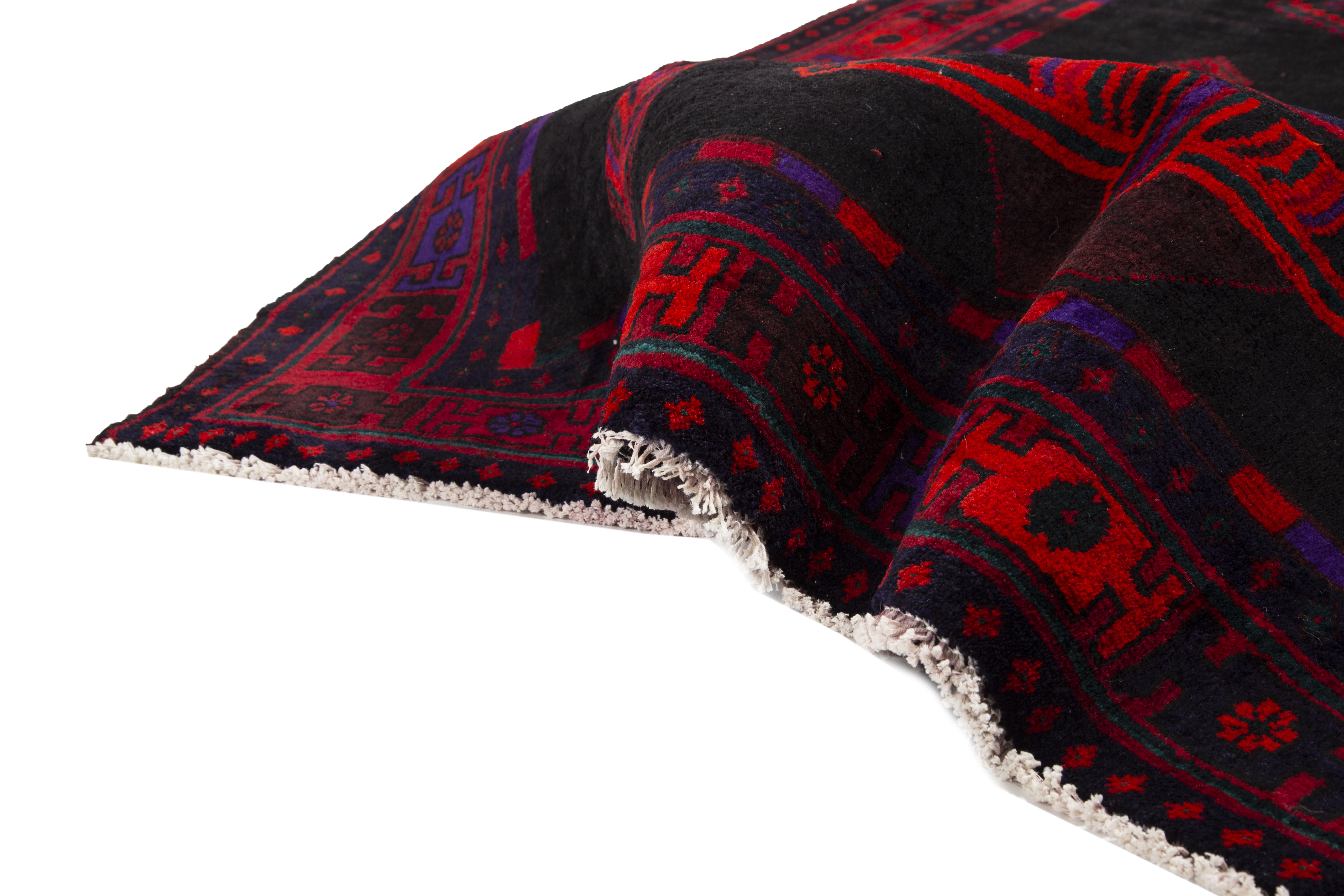 Deep burgundy and dark red hues create the primary palette, accented by rich navy blue and vibrant crimson details that dance throughout the geometric patterns. Black outlines define each motif with striking clarity, while subtle variations in the red tones reveal the natural wool's organic beauty. These colors embody the earth and sky of ancient Persia, where natural dyes created lasting beauty that deepens with age and use.