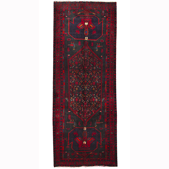 Measuring 13x4 ft and featuring a Medallion design in Crimson, Navy Blue, this Semi Antique Bijar rug embodies the weaving culture of Kermanshah - a tradition of exceptional artistry and enduring craft excellence. Bijar rugs have