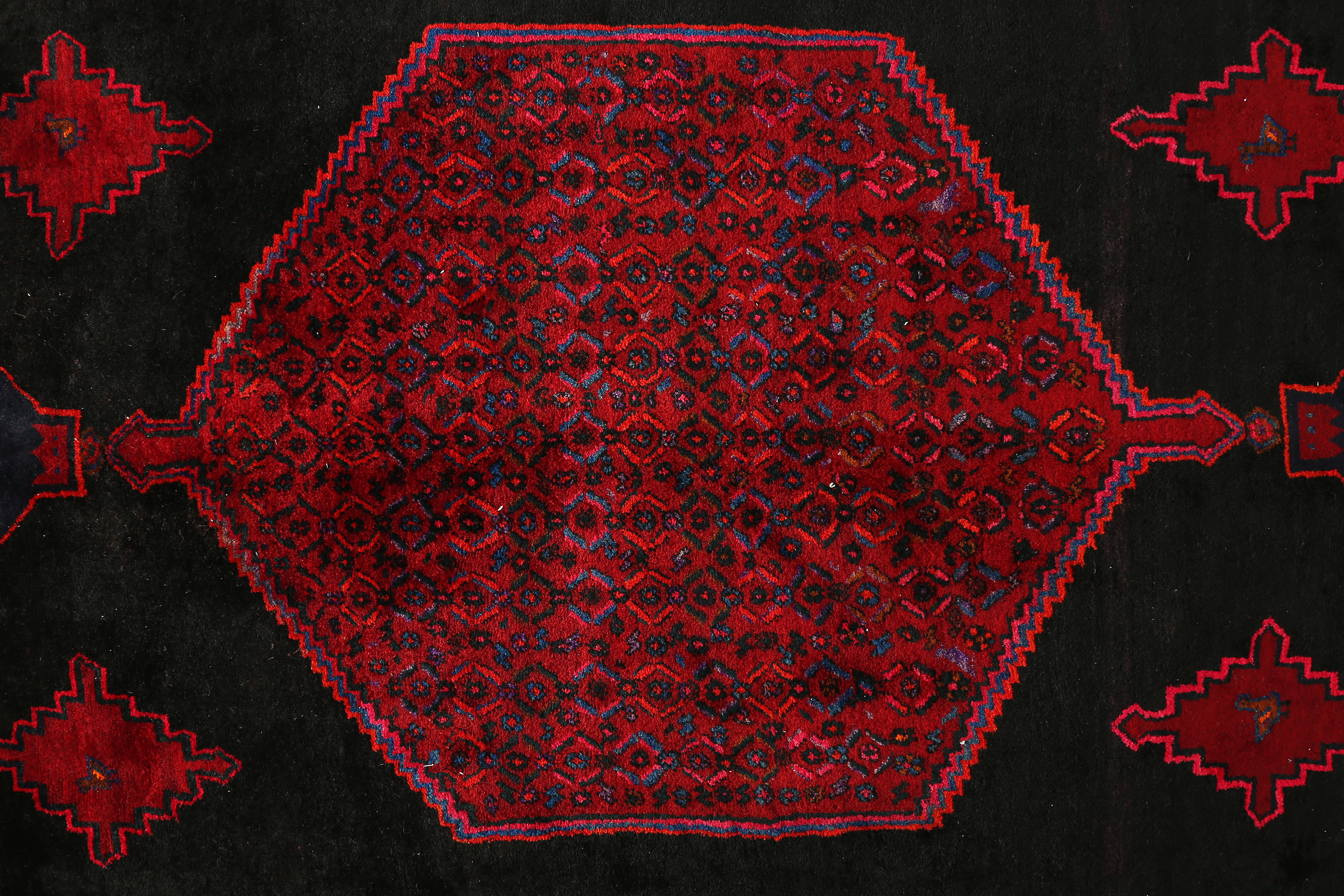 The design tradition of Bijar draws on the full classical Persian repertoire, rendered with the bold, confident drawing characteristic of Kurdish weaving culture. The Herati pattern - a rosette enclosed within a diamond of lancet