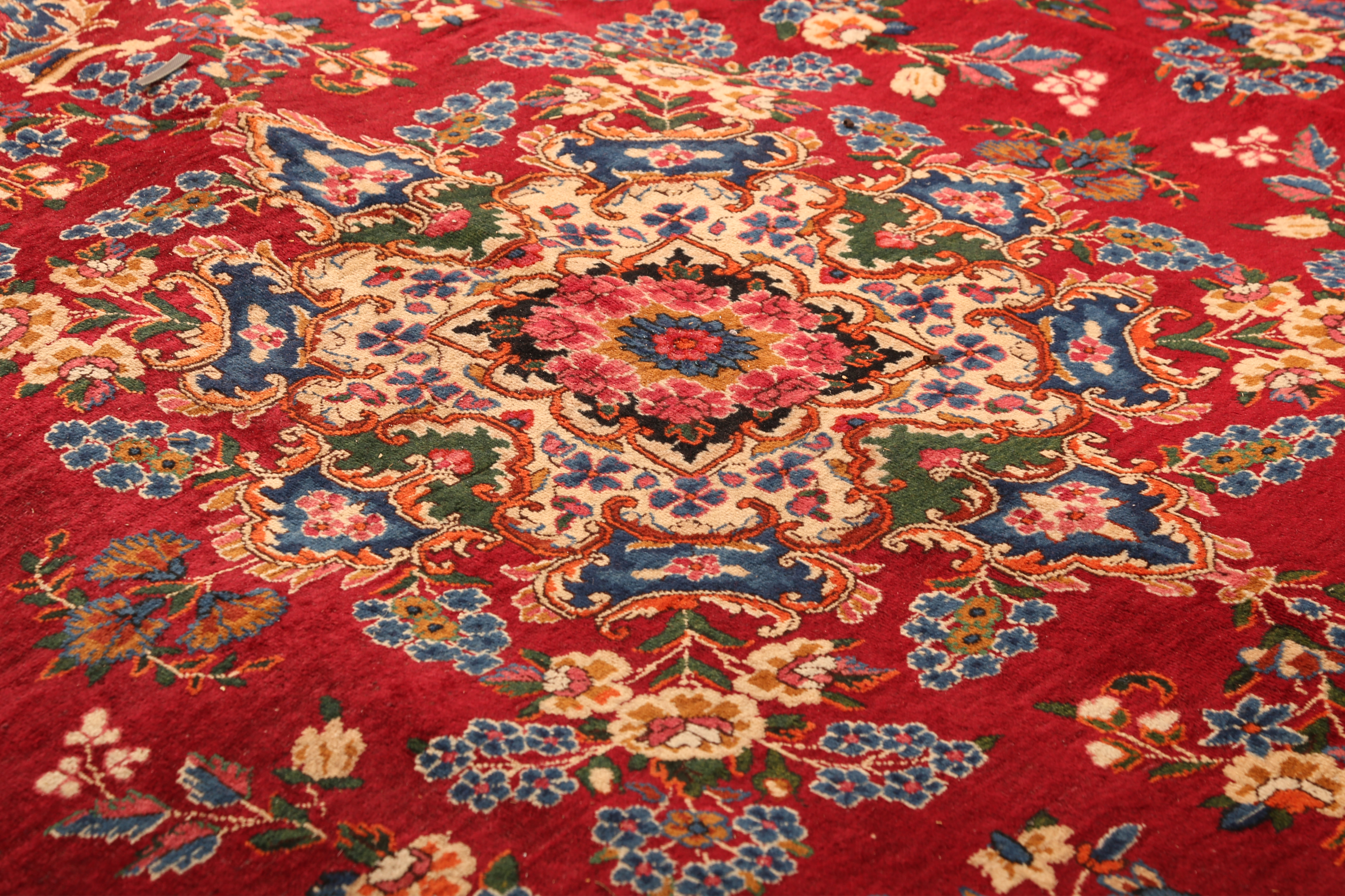 This magnificent 13'5" x 9'7" Kerman masterpiece represents four decades of graceful aging, developing the coveted patina that transforms an already exceptional rug into a semi-antique treasure. The commanding medallion design anchors a symphony of colors-deep crimson fields dance with cream borders while navy blue accents provide sophisticated contrast, all enhanced by touches of gold, green, copper, pink, and ivory that create mesmerizing depth throughout the composition.