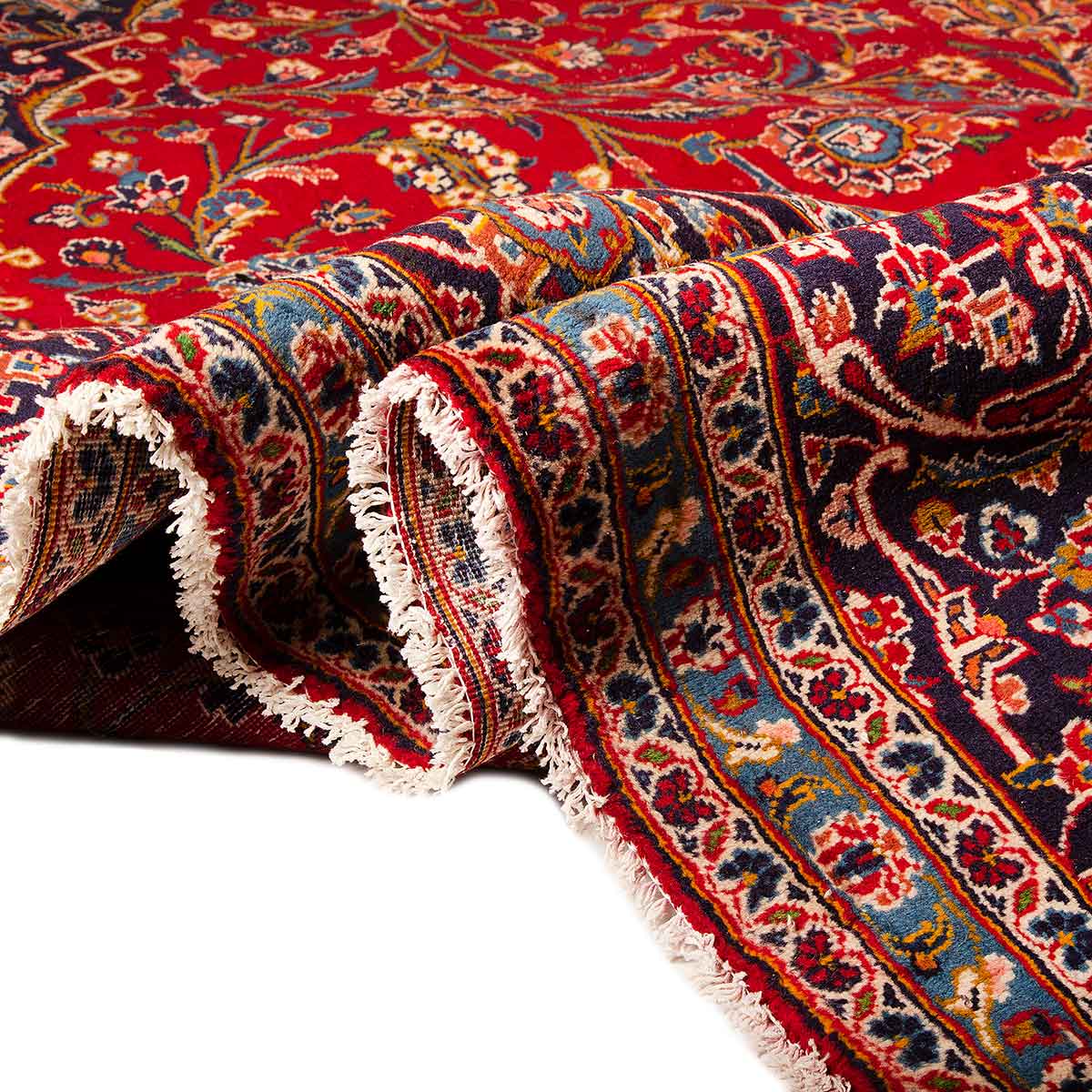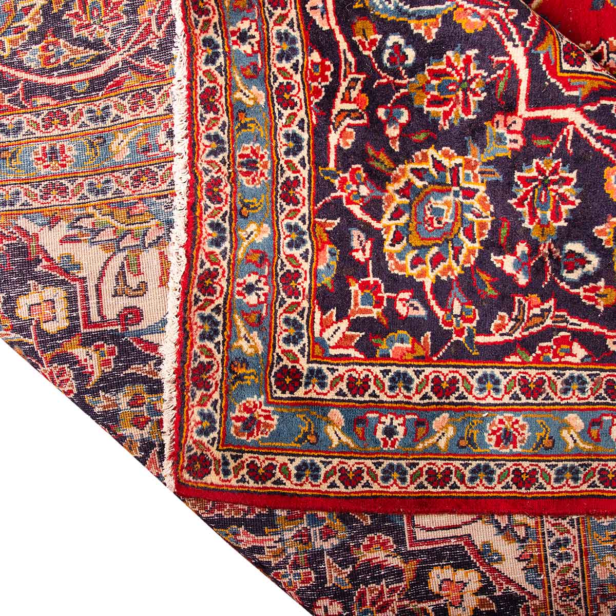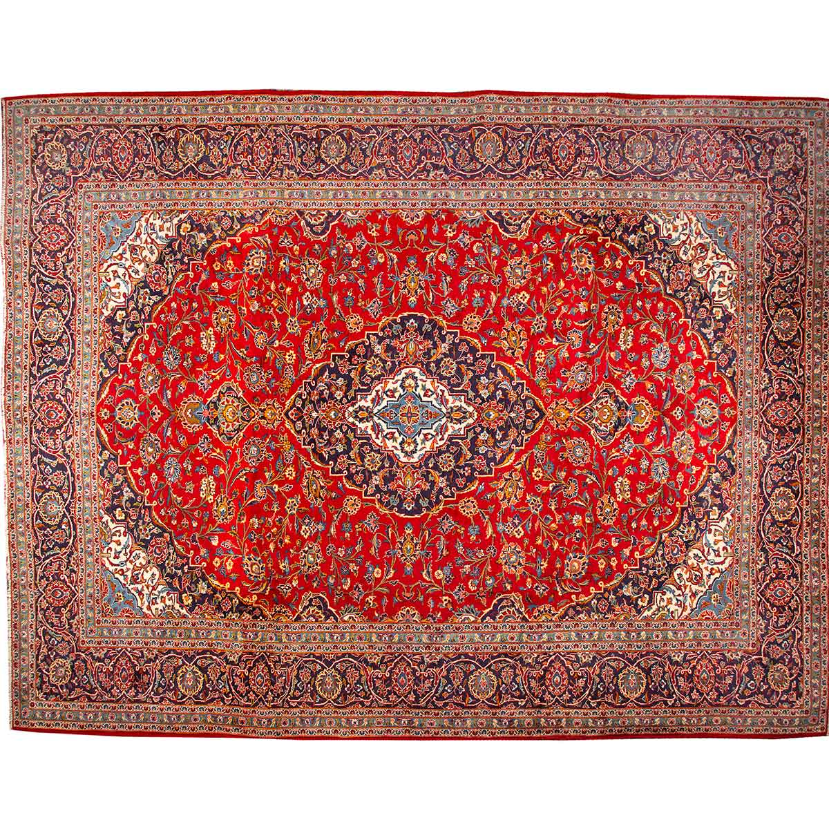 With its Medallion design in Crimson, Navy Blue and its generous 13x10 ft format, this Semi Antique Kashan rug represents the authentic weaving heritage of Isfahan, where rugs of this quality have been hand-knotted for